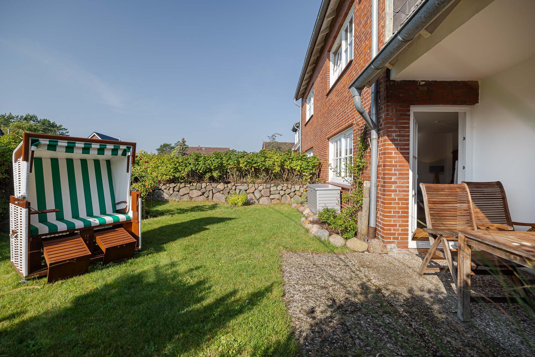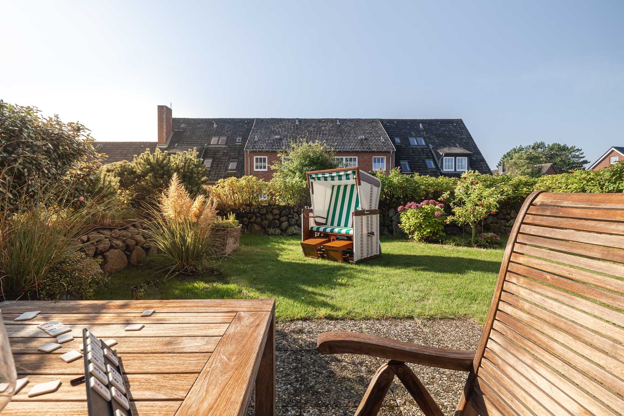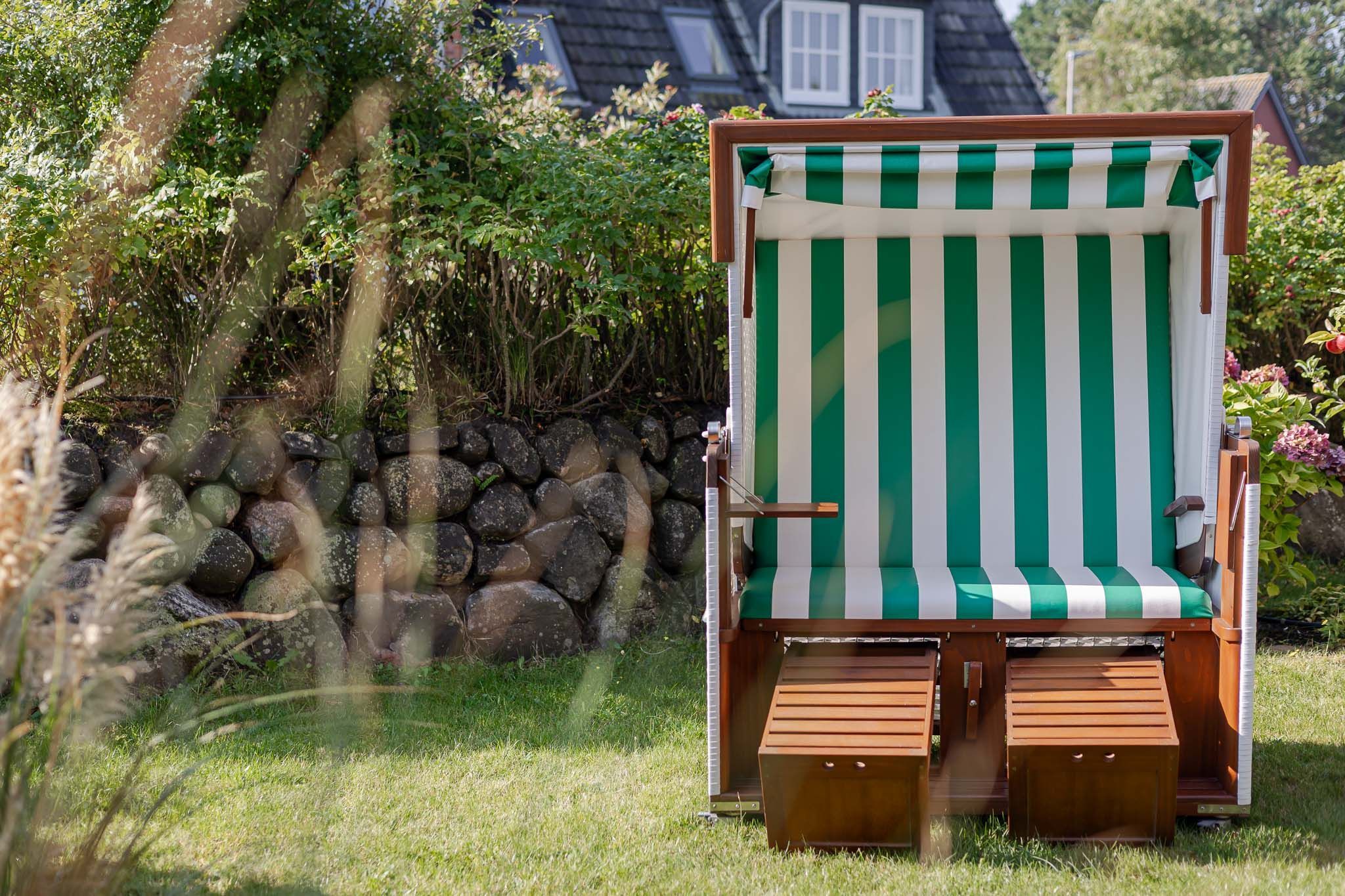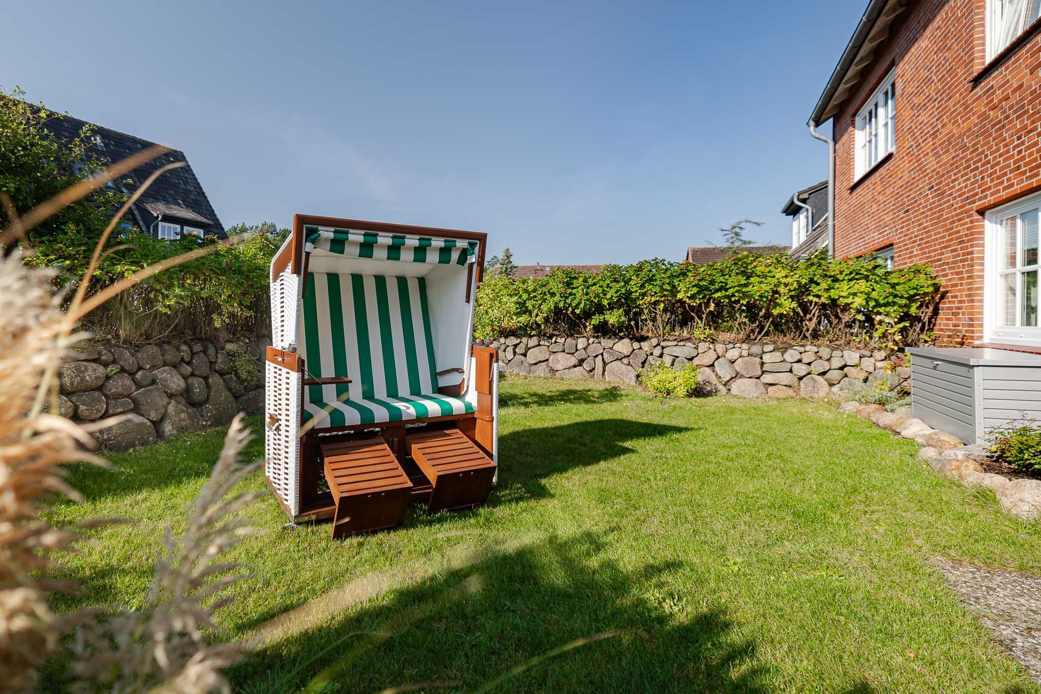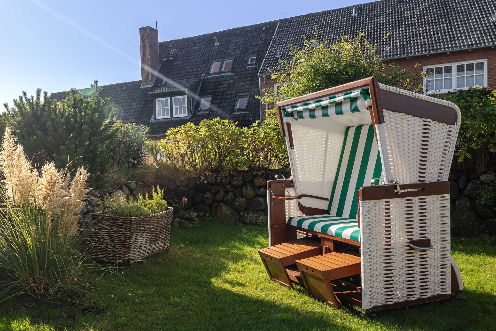 Ein weiteres Highlight dieser Wohnung ist der abgeschlossene, eigene Garten, der von einem traditionellen Friesenwall umgeben ist. Die geräumige Terrasse mit Strandkorb bietet Ihnen ausreichend Platz, um die frische Seeluft zu genießen. Der nach Süden ausgerichtete Garten sorgt den ganzen Tag über für Sonnenschein und lädt zum Verweilen ein.