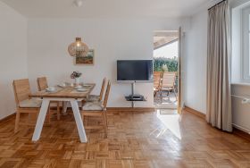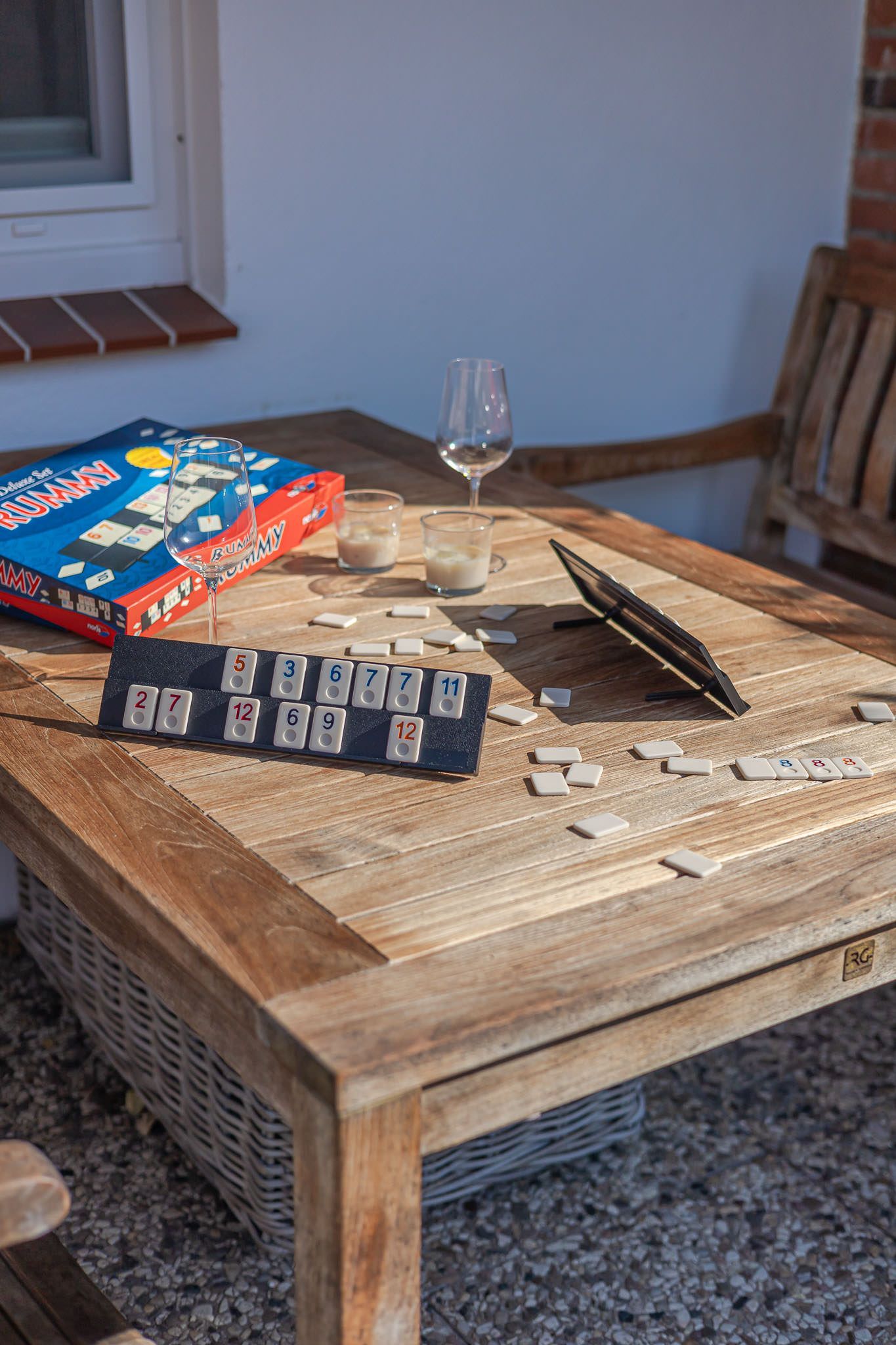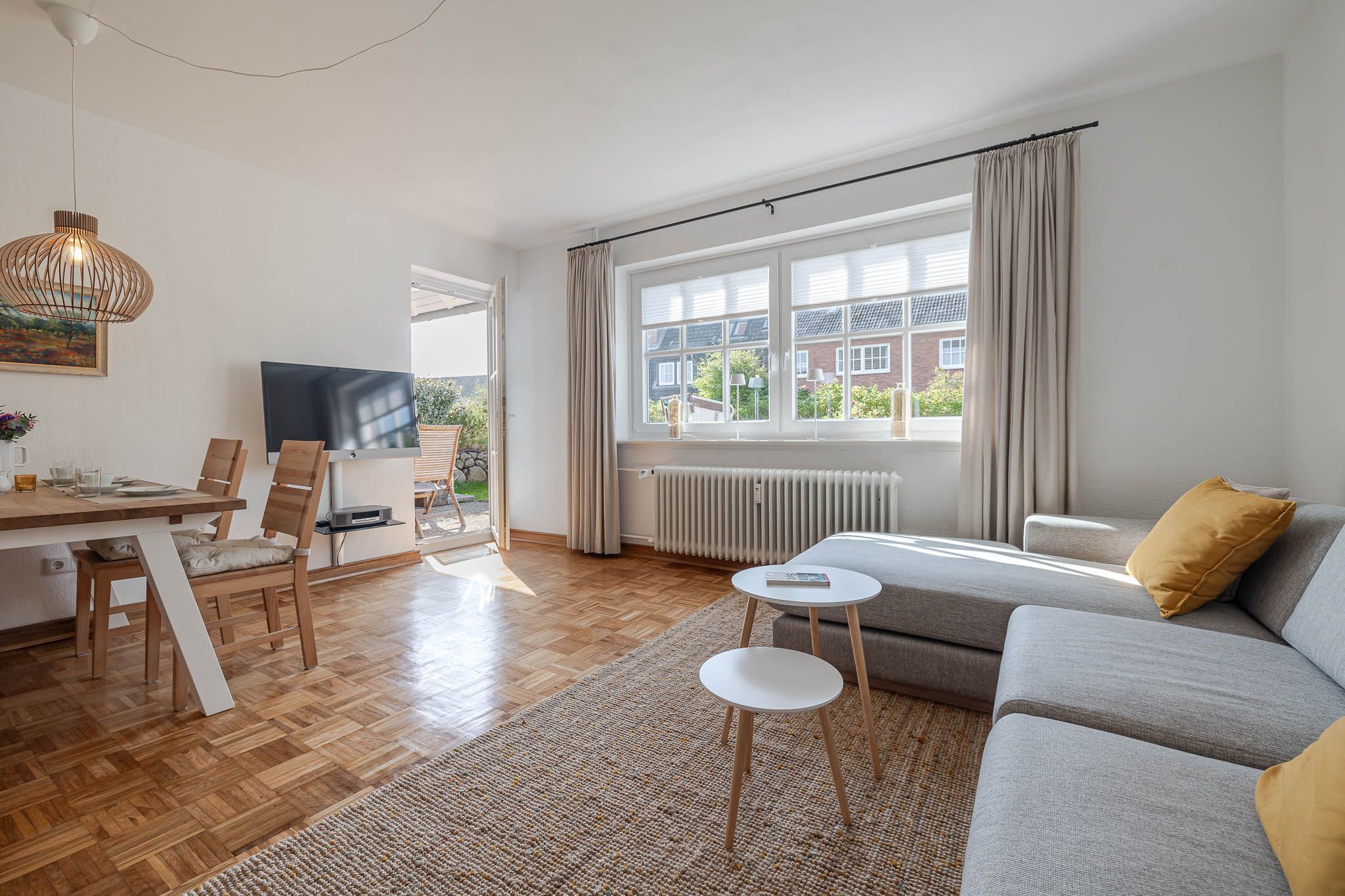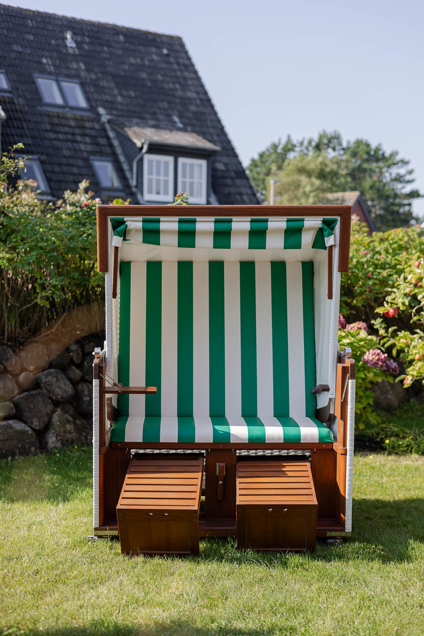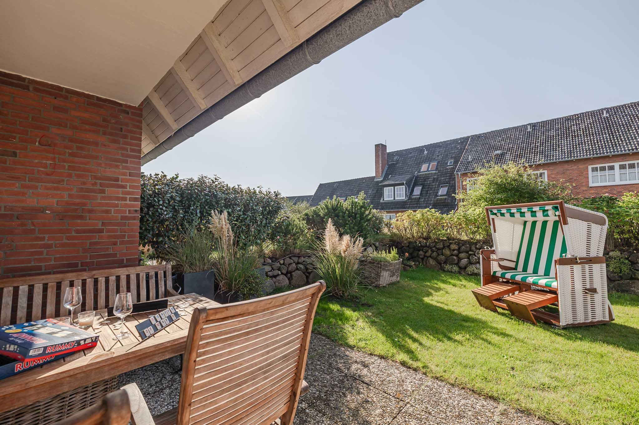 Ein weiteres Highlight dieser Wohnung ist der abgeschlossene, eigene Garten, der von einem traditionellen Friesenwall umgeben ist. Die geräumige Terrasse mit Strandkorb bietet Ihnen ausreichend Platz, um die frische Seeluft zu genießen. Der nach Süden ausgerichtete Garten sorgt den ganzen Tag über für Sonnenschein und lädt zum Verweilen ein.