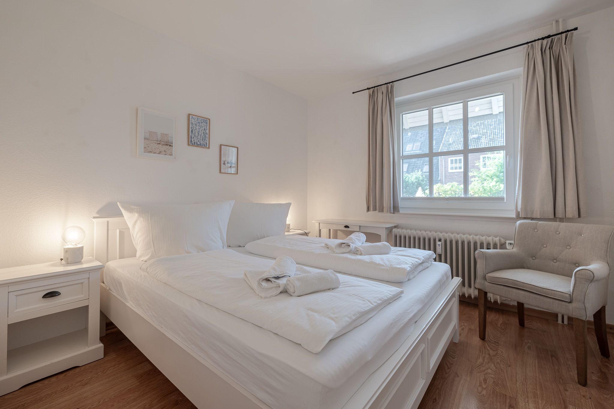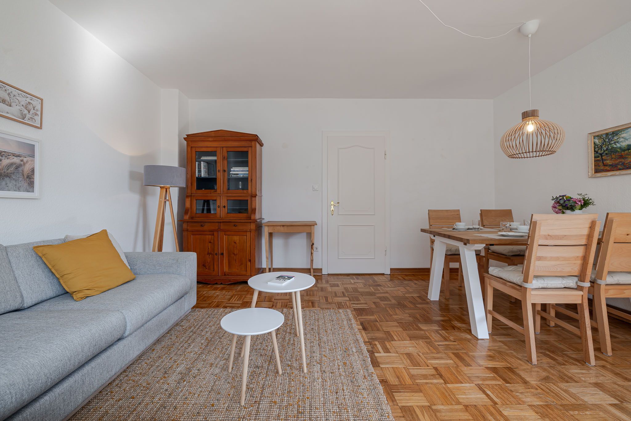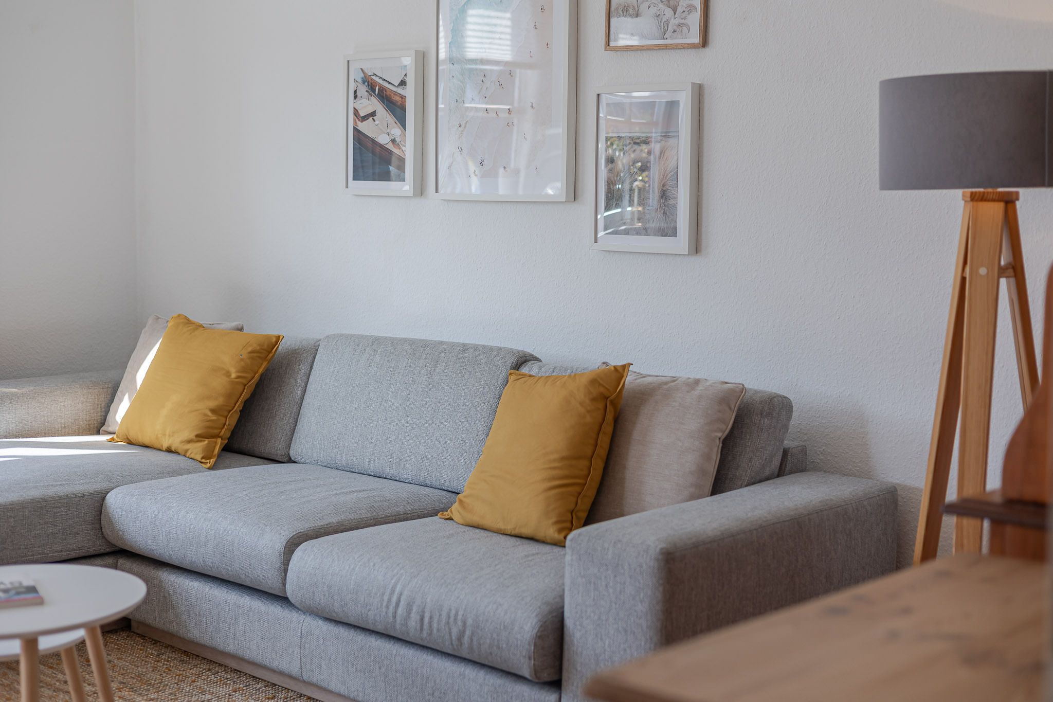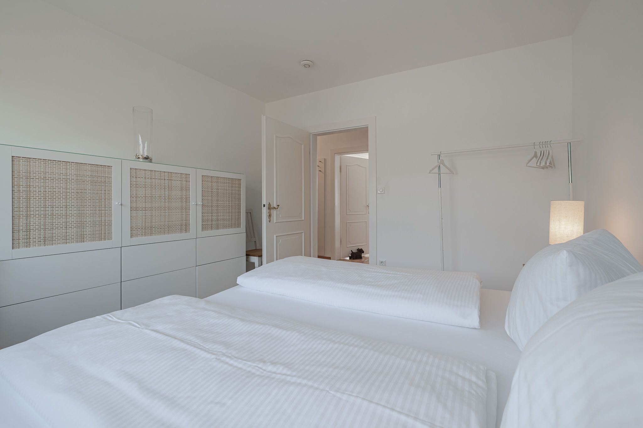 Die Wohnung verfügt über zwei gemütliche Schlafzimmer sowie ein modernes Badezimmer mit einer komfortablen, bodentiefen Dusche. Die voll ausgestattete Küche verfügt nicht nur über eine Spülmaschine, sondern auch eine Waschmaschine ideal auch für längere Aufenthalte. Im angrenzenden Wohnzimmer lädt die großzügige 3 Personen Couch mit Recamiere zum Entspannen ein.