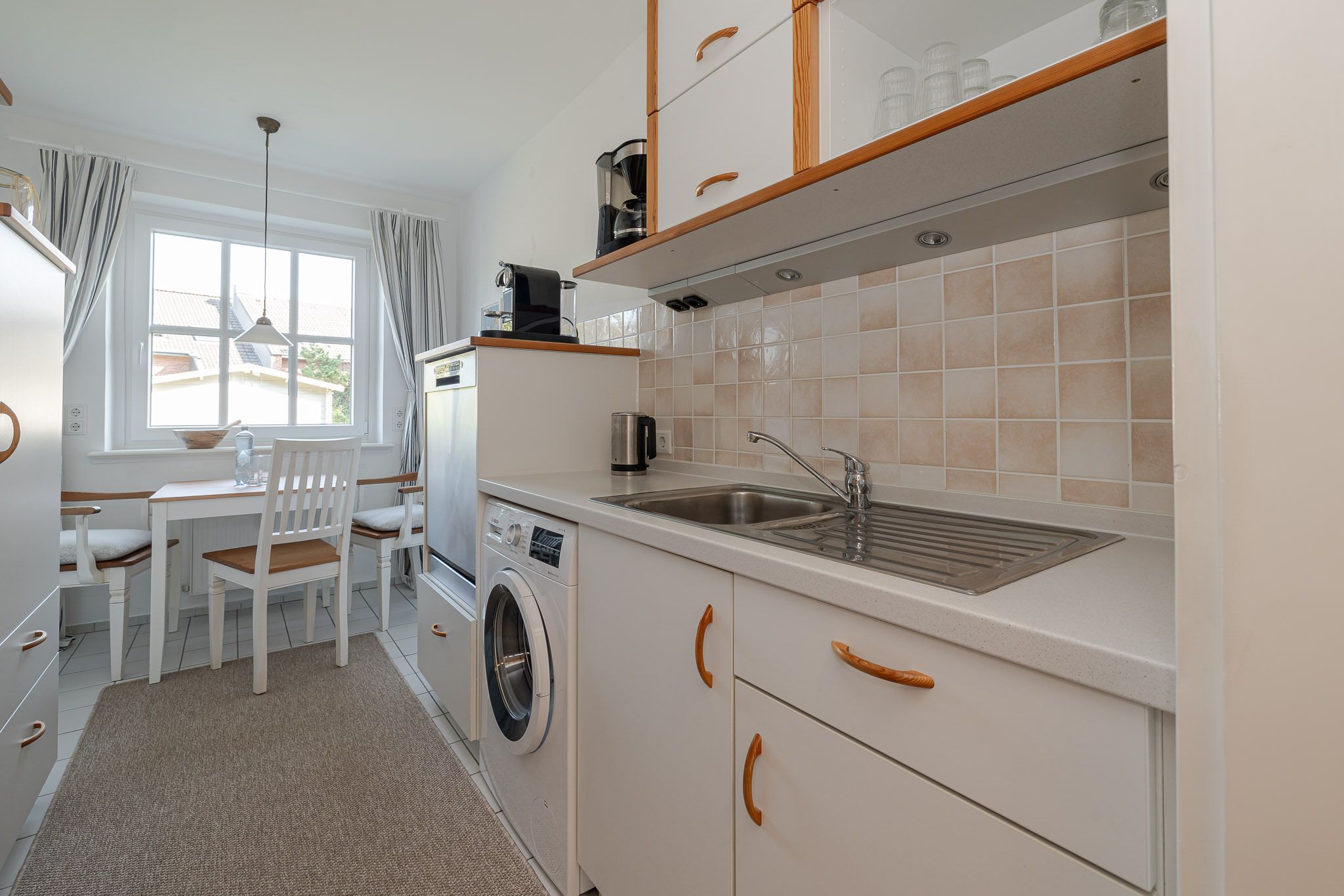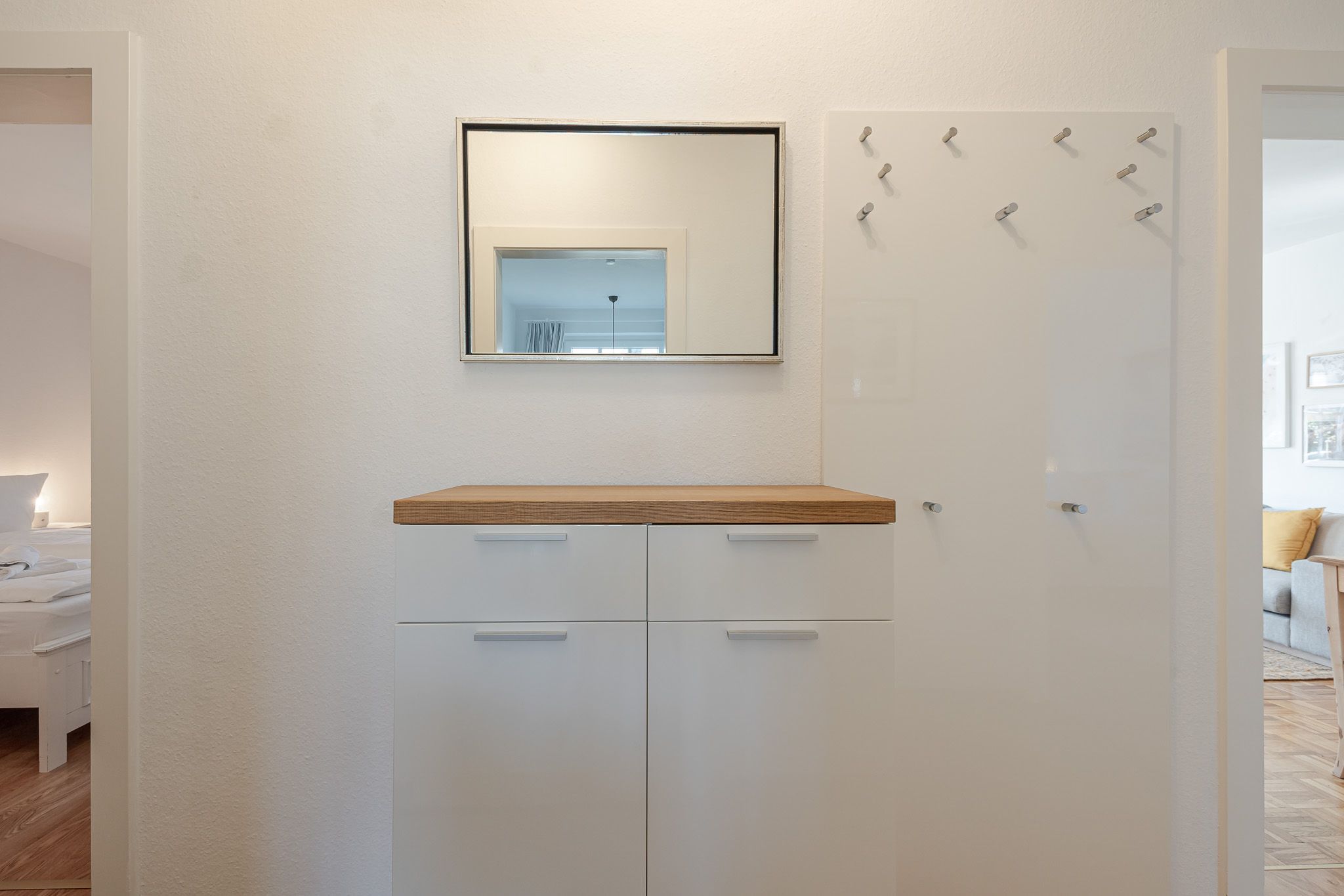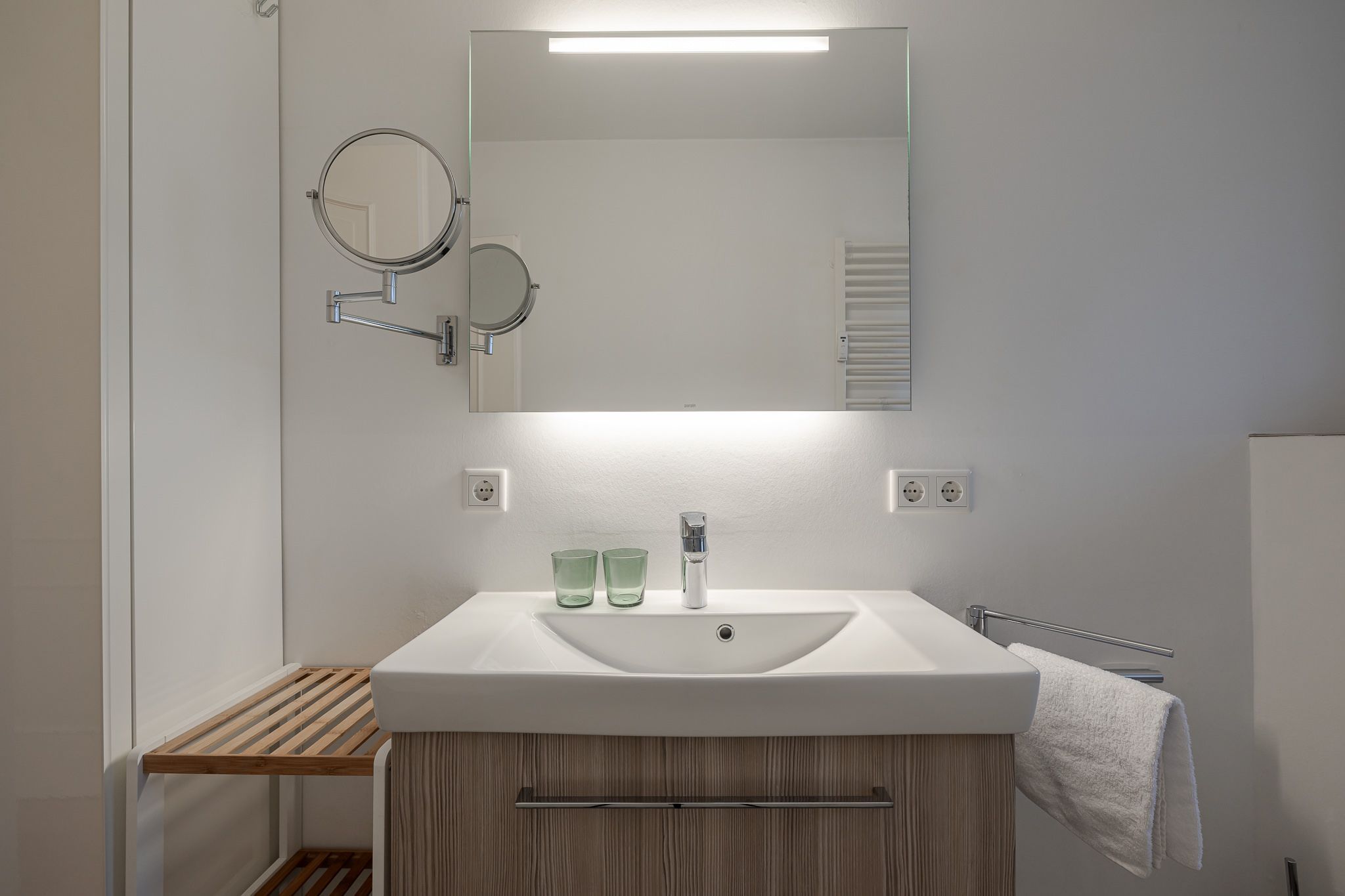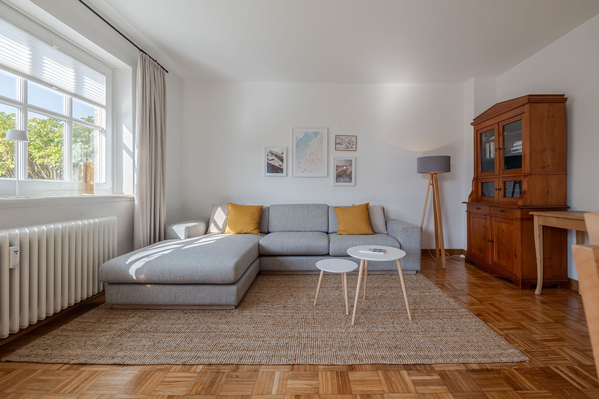 Die Wohnung verfügt über zwei gemütliche Schlafzimmer sowie ein modernes Badezimmer mit einer komfortablen, bodentiefen Dusche. Die voll ausgestattete Küche verfügt nicht nur über eine Spülmaschine, sondern auch eine Waschmaschine ideal auch für längere Aufenthalte. Im angrenzenden Wohnzimmer lädt die großzügige 3 Personen Couch mit Recamiere zum Entspannen ein.
