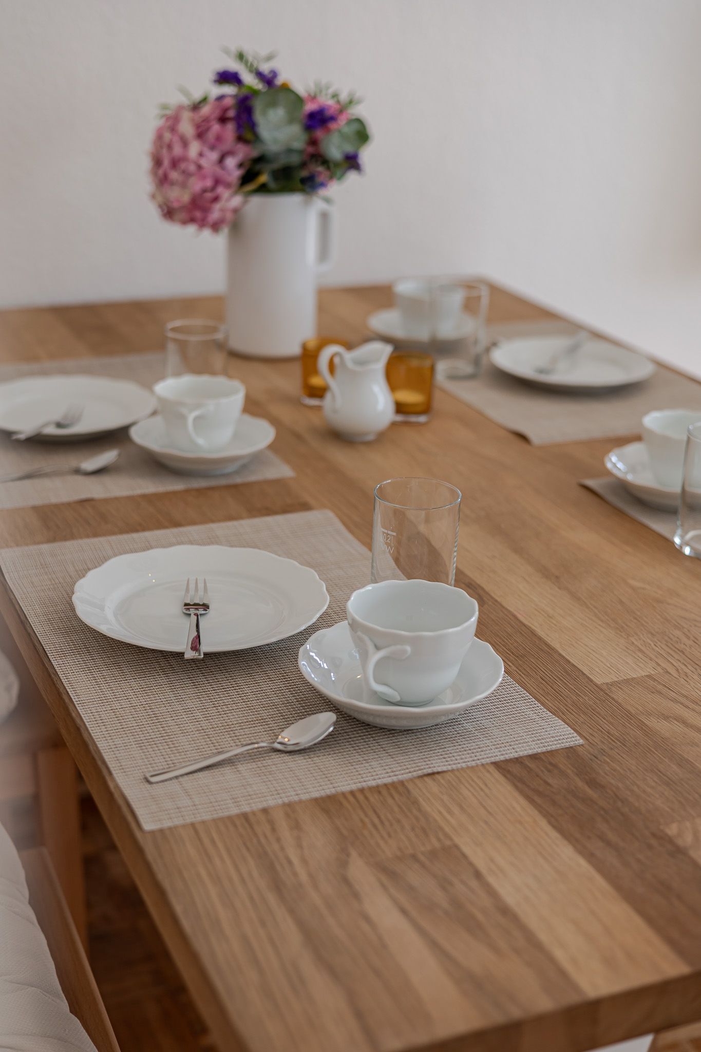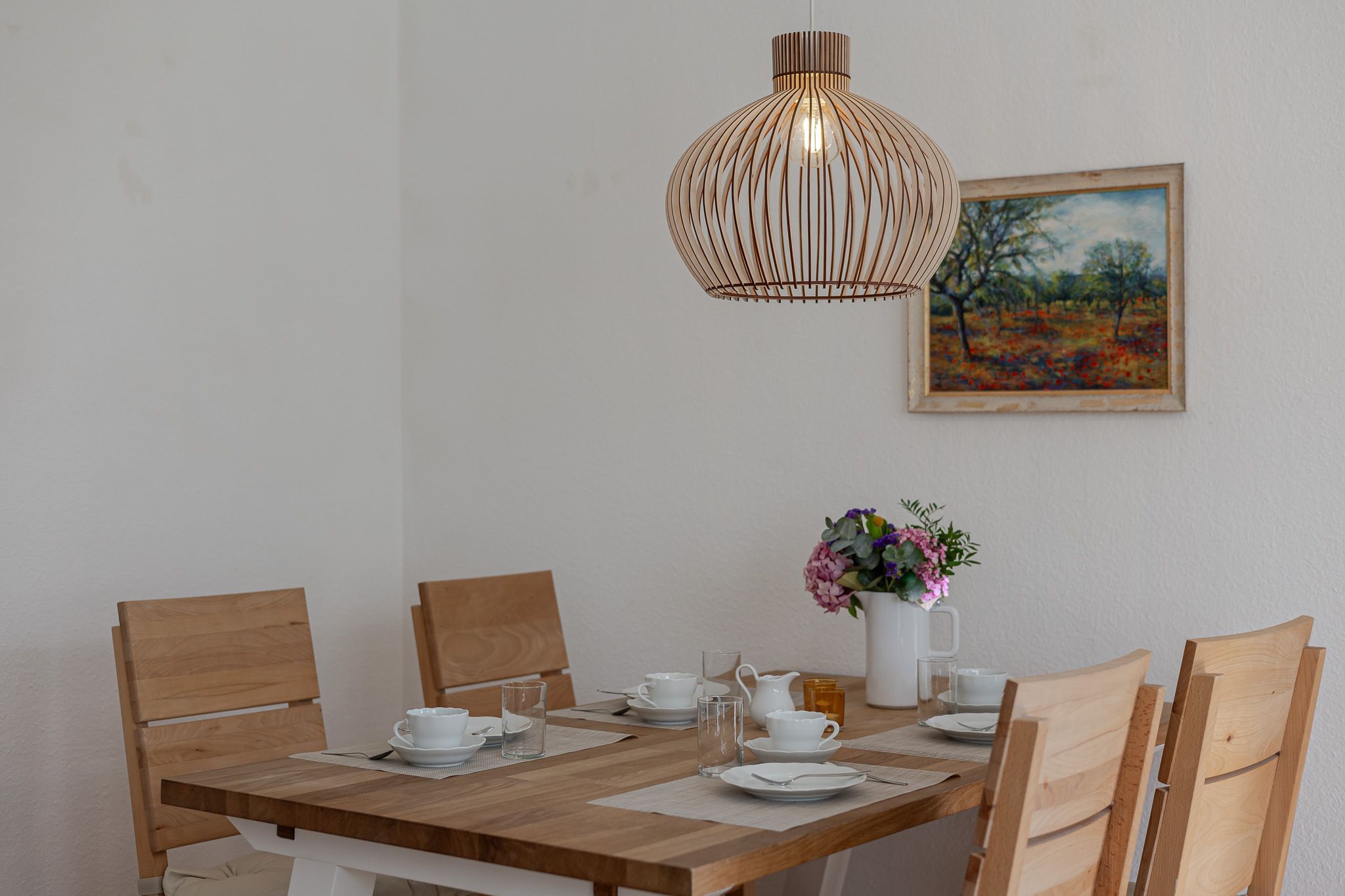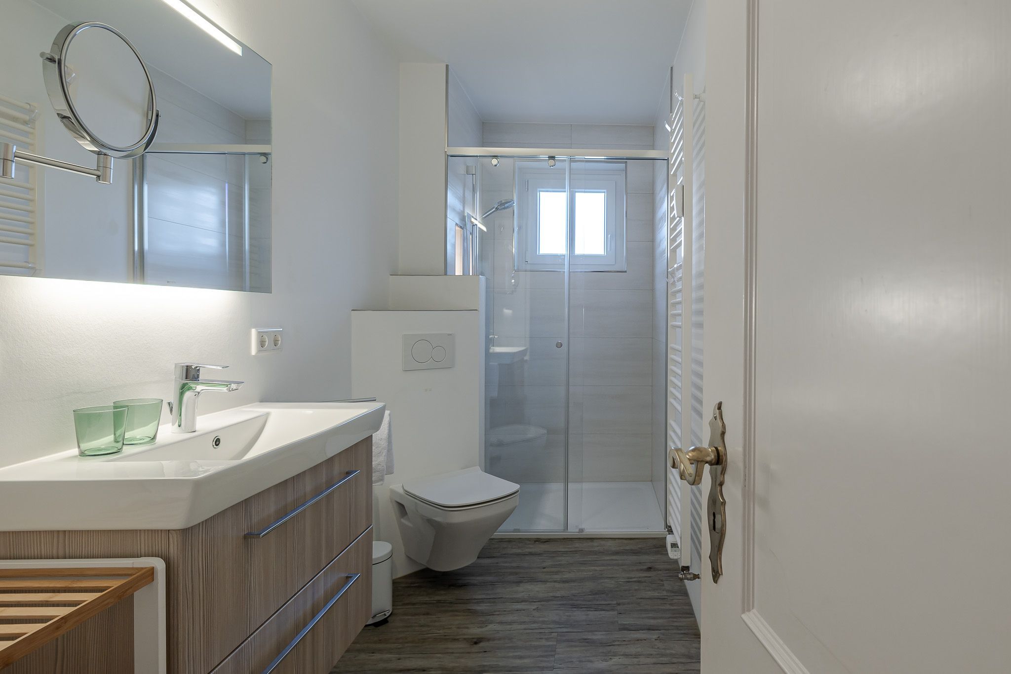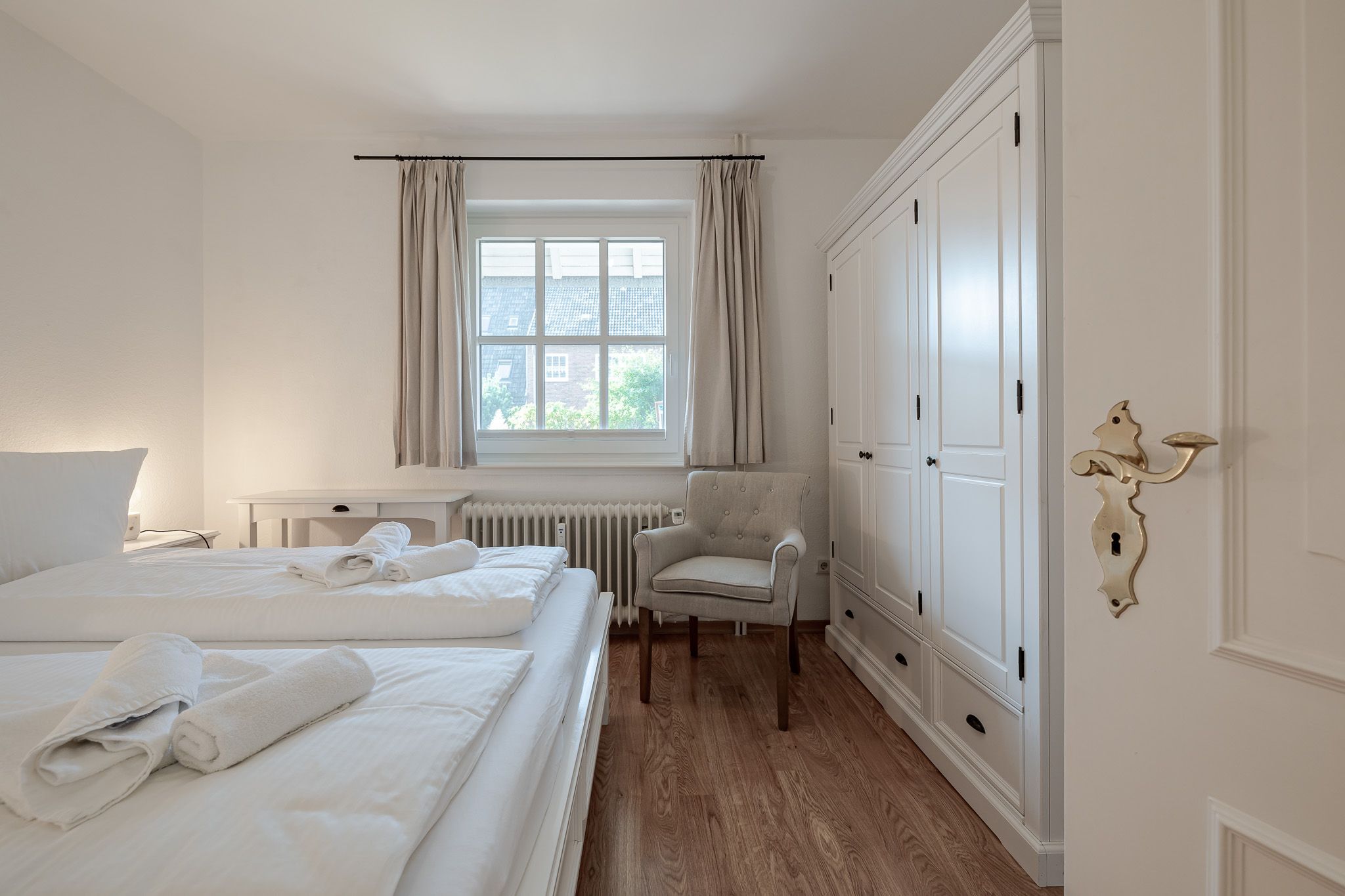 Die Wohnung verfügt über zwei gemütliche Schlafzimmer sowie ein modernes Badezimmer mit einer komfortablen, bodentiefen Dusche. Die voll ausgestattete Küche verfügt nicht nur über eine Spülmaschine, sondern auch eine Waschmaschine ideal auch für längere Aufenthalte. Im angrenzenden Wohnzimmer lädt die großzügige 3 Personen Couch mit Recamiere zum Entspannen ein.