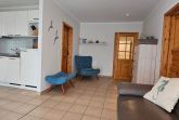 - In einer separaten Ecke im Wohnbereich befindet sich die offene Einbauküche. Diese ist inkl. Geschirrspüler, Herd mit Backofen, Kaffeemaschine, Toaster, Wasserkocher, Kühlschrank mit Gefrierteil und einem Essplatz ausgestattet. Geschirr, Besteck und Gläser sind ausreichend vorhanden.