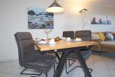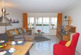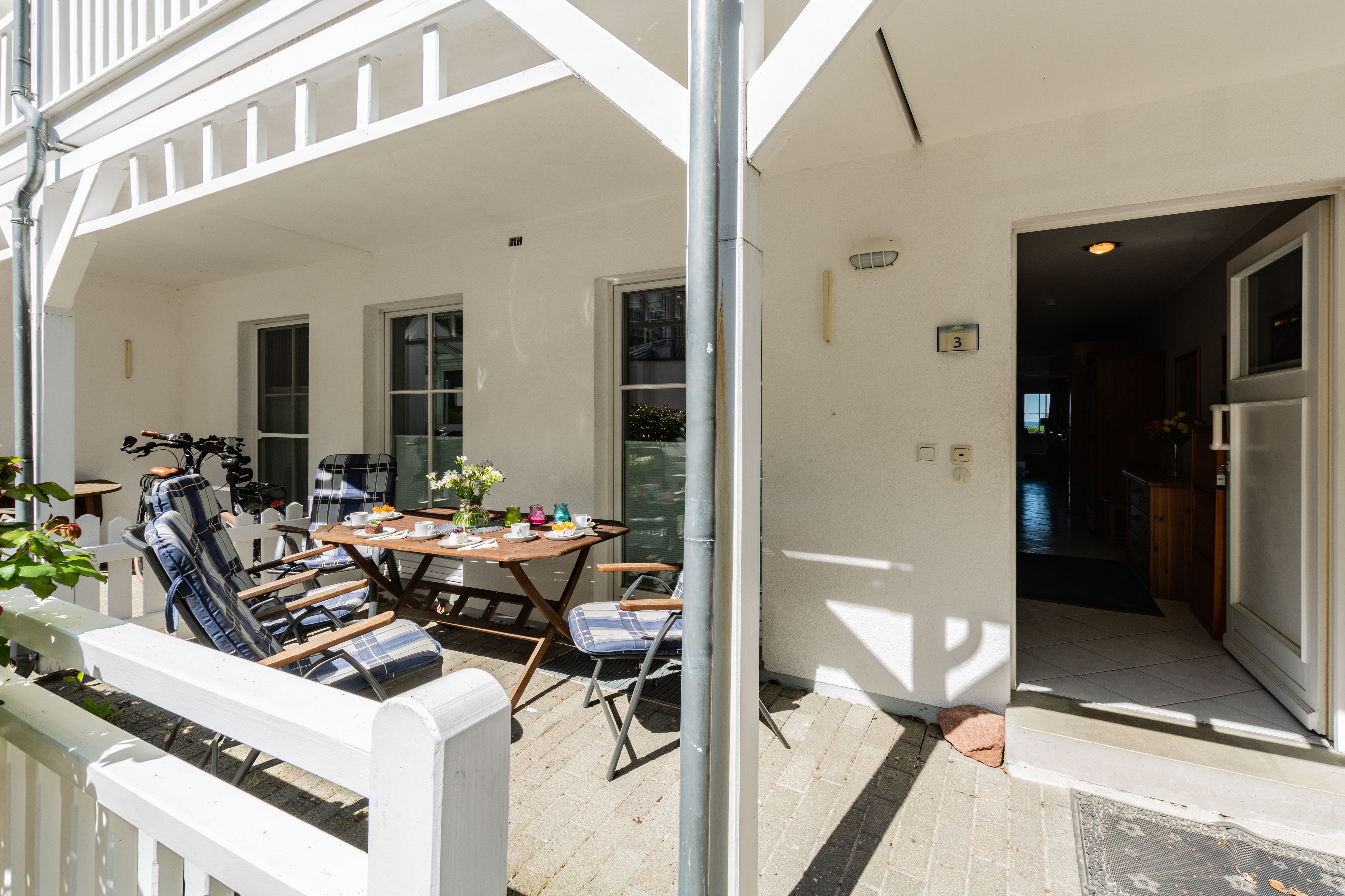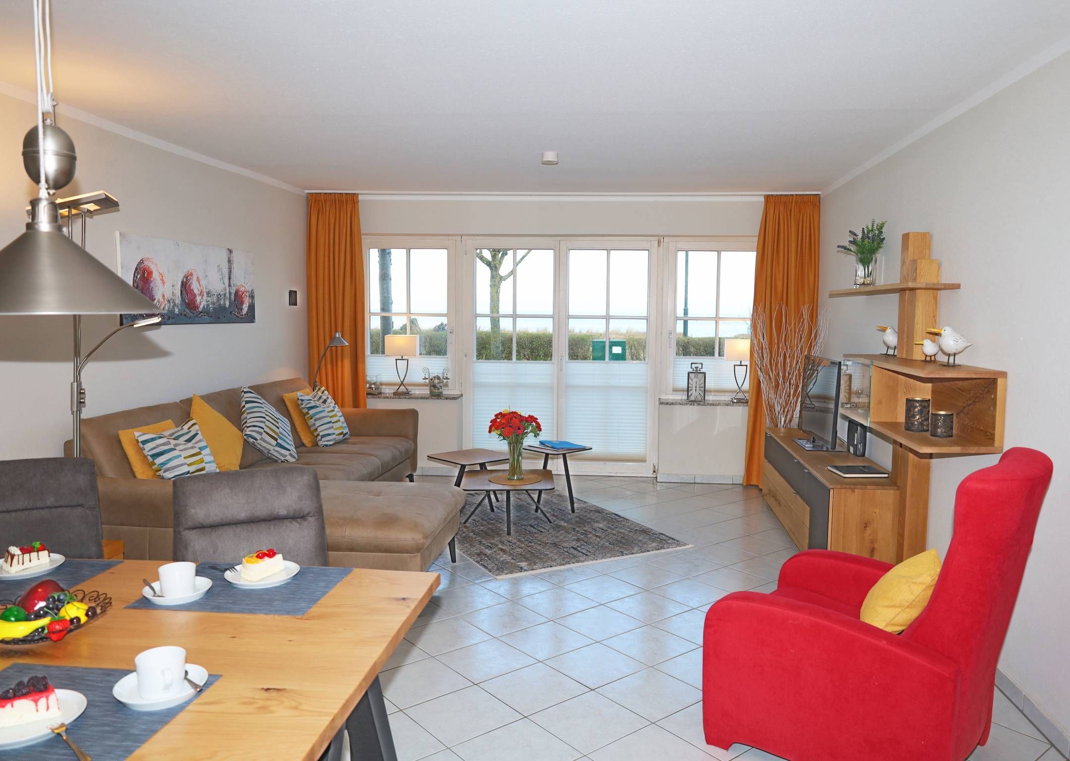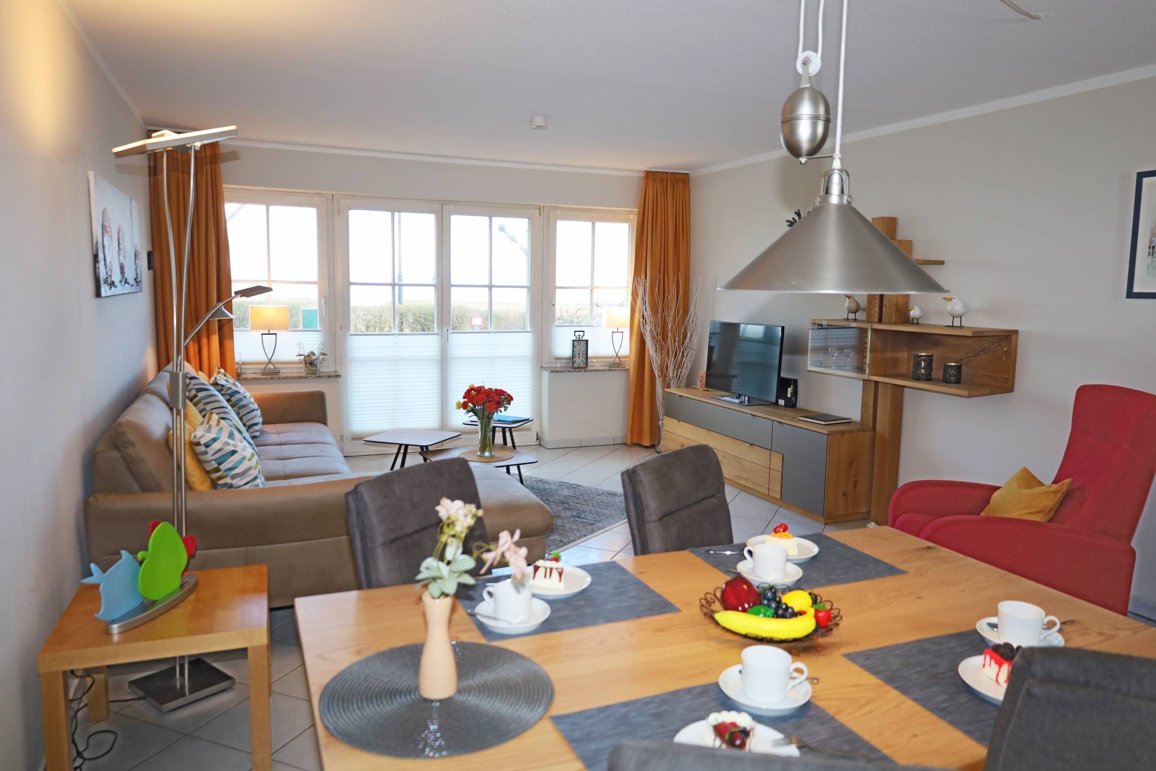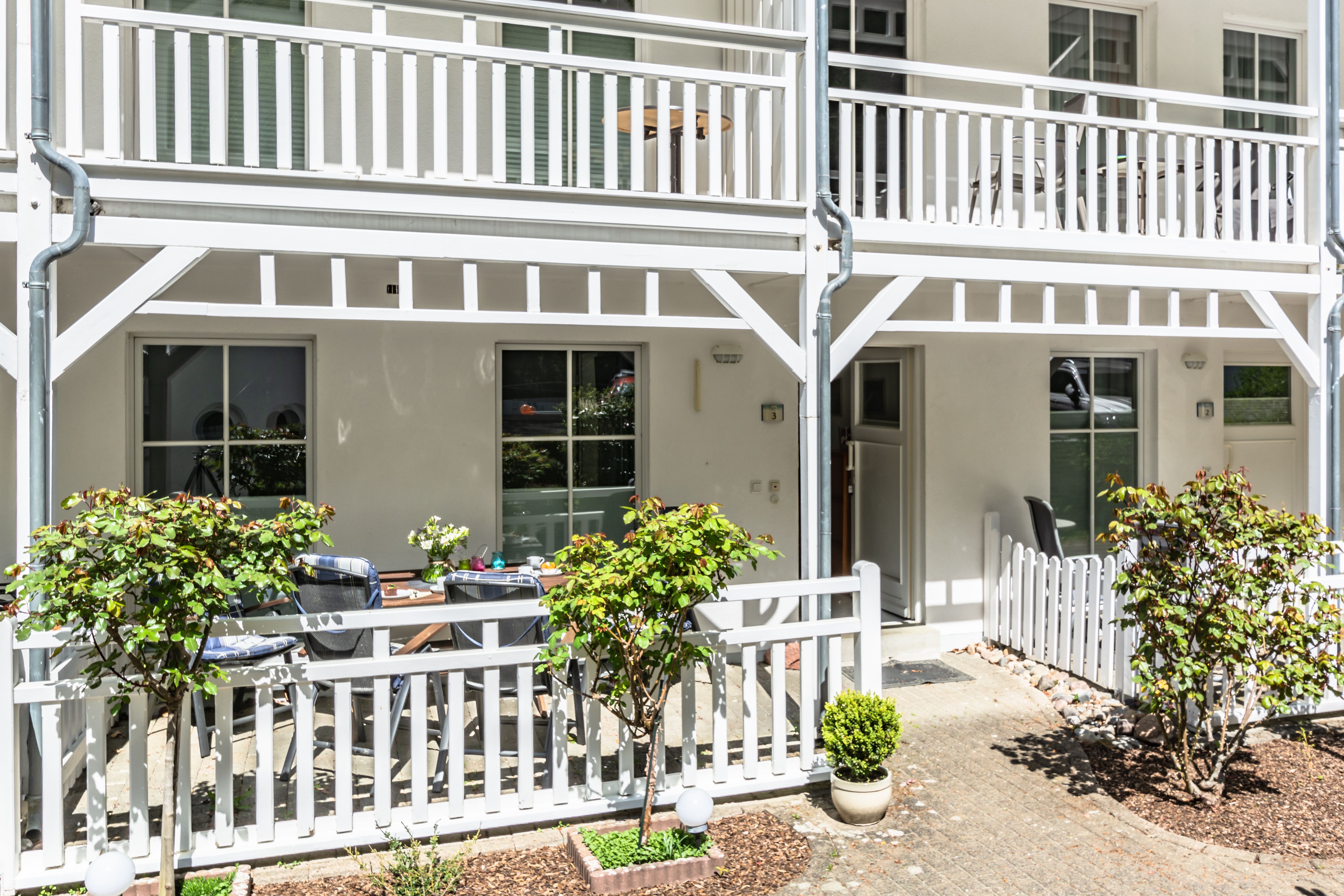 Durch die bodentiefen Fenster genießen Sie einen wundervollen, frontalen Meerblick aus dem Wohnzimmer. Die Terrasse, die sich auf der ruhigen Rückseite des Hauses befindet, ist nach Süden ausgerichtet und lädt an sonnigen Tagen zum Entspannen und Verweilen ein.