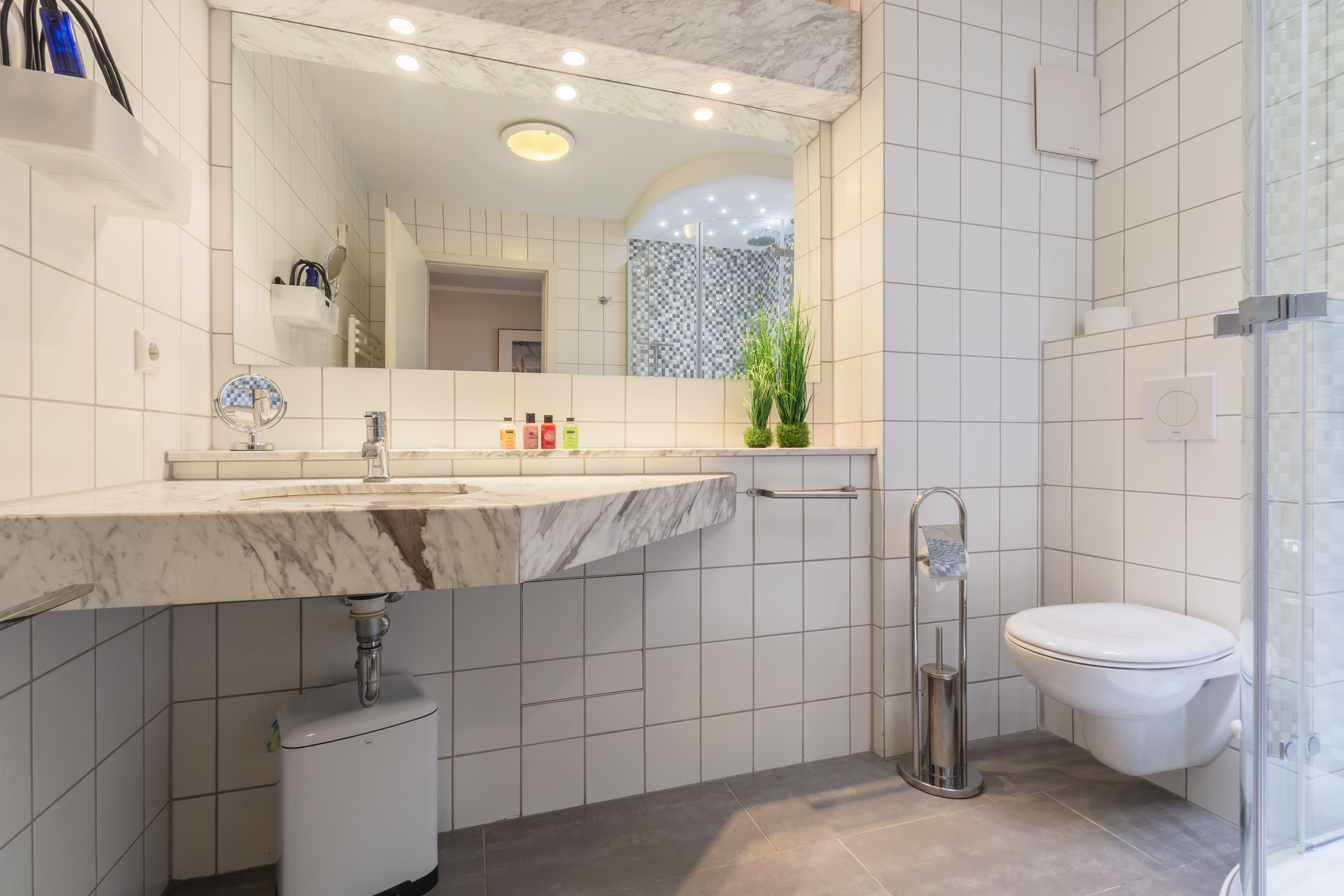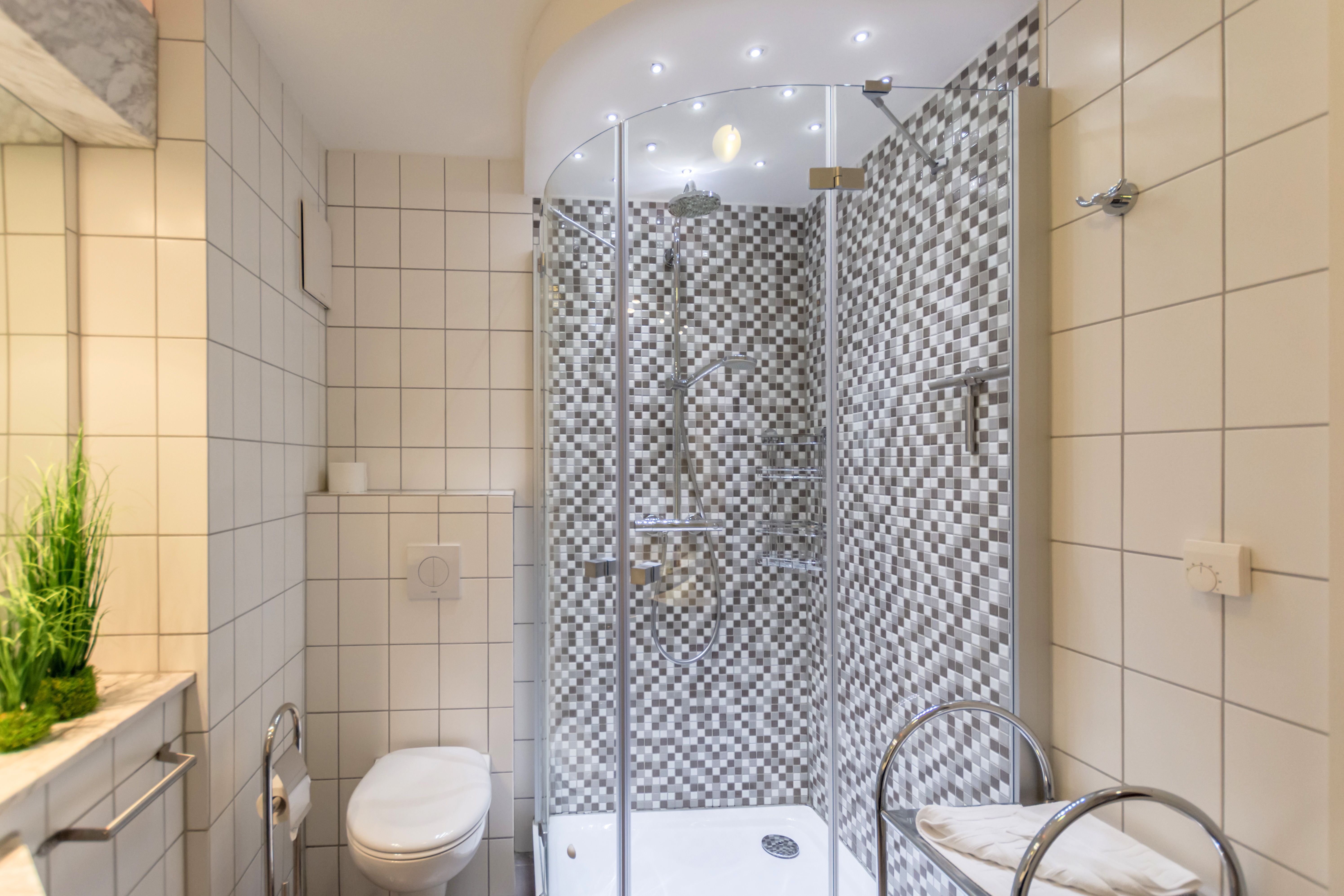 Das Badezimmer ist mit einer Dusche ausgestattet, und ein Föhn steht ebenfalls bereit. Zusätzlich gibt es ein separates Gäste-WC im Appartement.