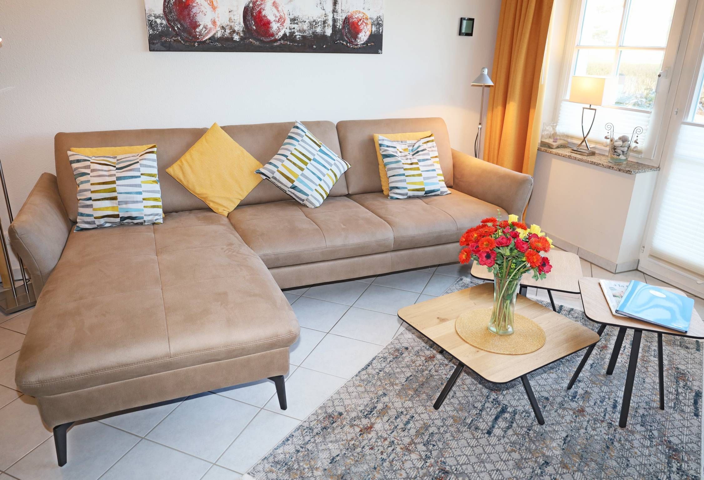 Der großzügige Wohnbereich mit einer Essecke sorgt für ein gemütliches Ambiente. Ein Sofa mit Schlaffunktion (Liegefläche 135 cm x 200 cm) bietet zusätzlichen Komfort und lädt zu entspannten Abenden ein. Für Ihre Unterhaltung stehen Ihnen ein Flachbildfernseher und kostenloses WLAN zur Verfügung.