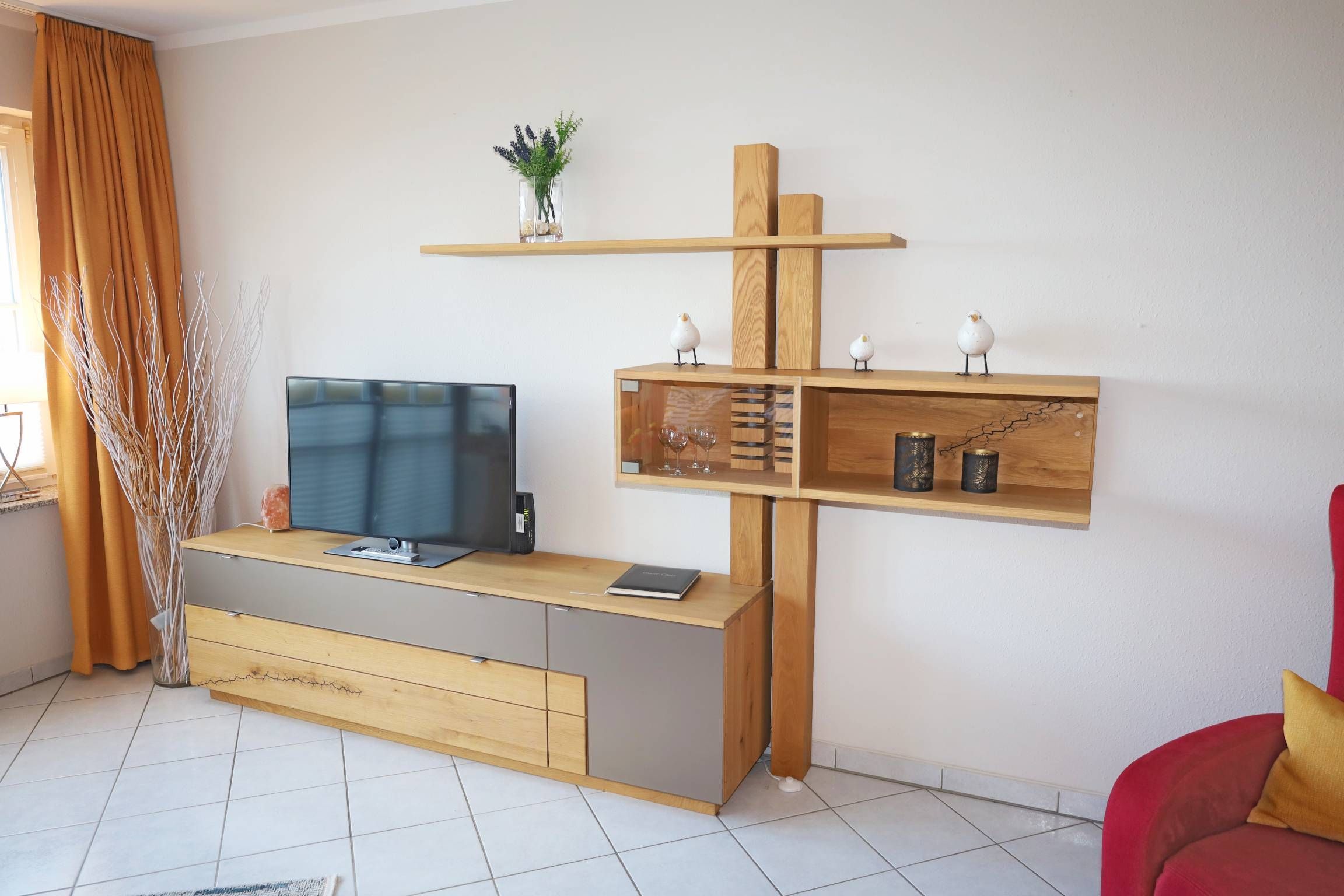 Das Schlafzimmer ist mit einem komfortablen Doppelbett sowie einer weiteren Schlafmöglichkeit zur Aufbettung ausgestattet. Ein geräumiger Kleiderschrank bietet ausreichend Stauraum für Ihr Gepäck. Die offene, gut ausgestattete Küchenzeile lässt keine Wünsche offen: Ein Kühlschrank mit Gefrierfach, eine Mikrowelle, ein Cerankochfeld mit Backofen, Wasserkocher, Kaffeemaschine und Toaster bieten alles, was Sie für die Zubereitung Ihrer Mahlzeiten benötigen.