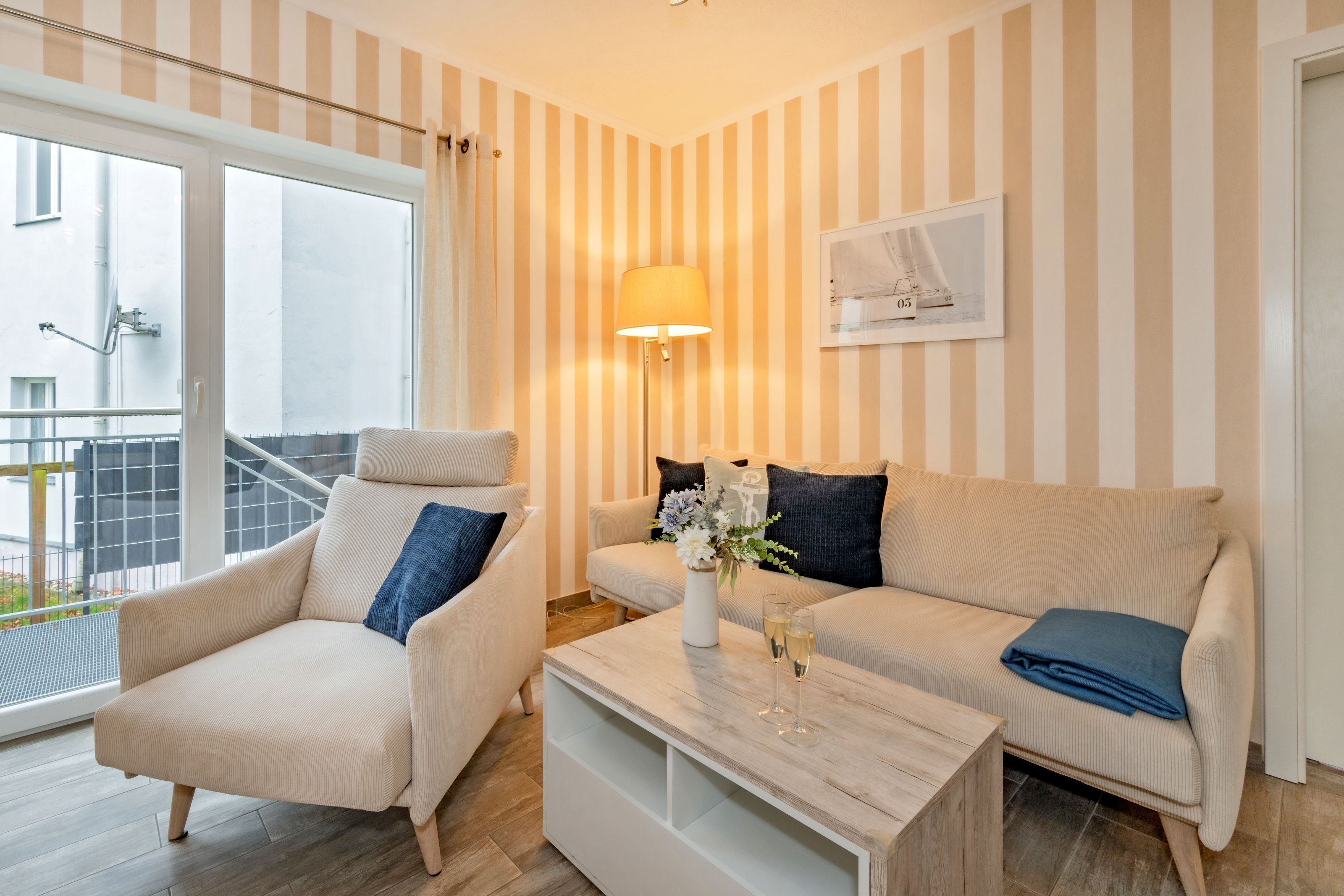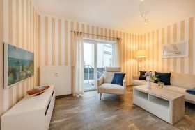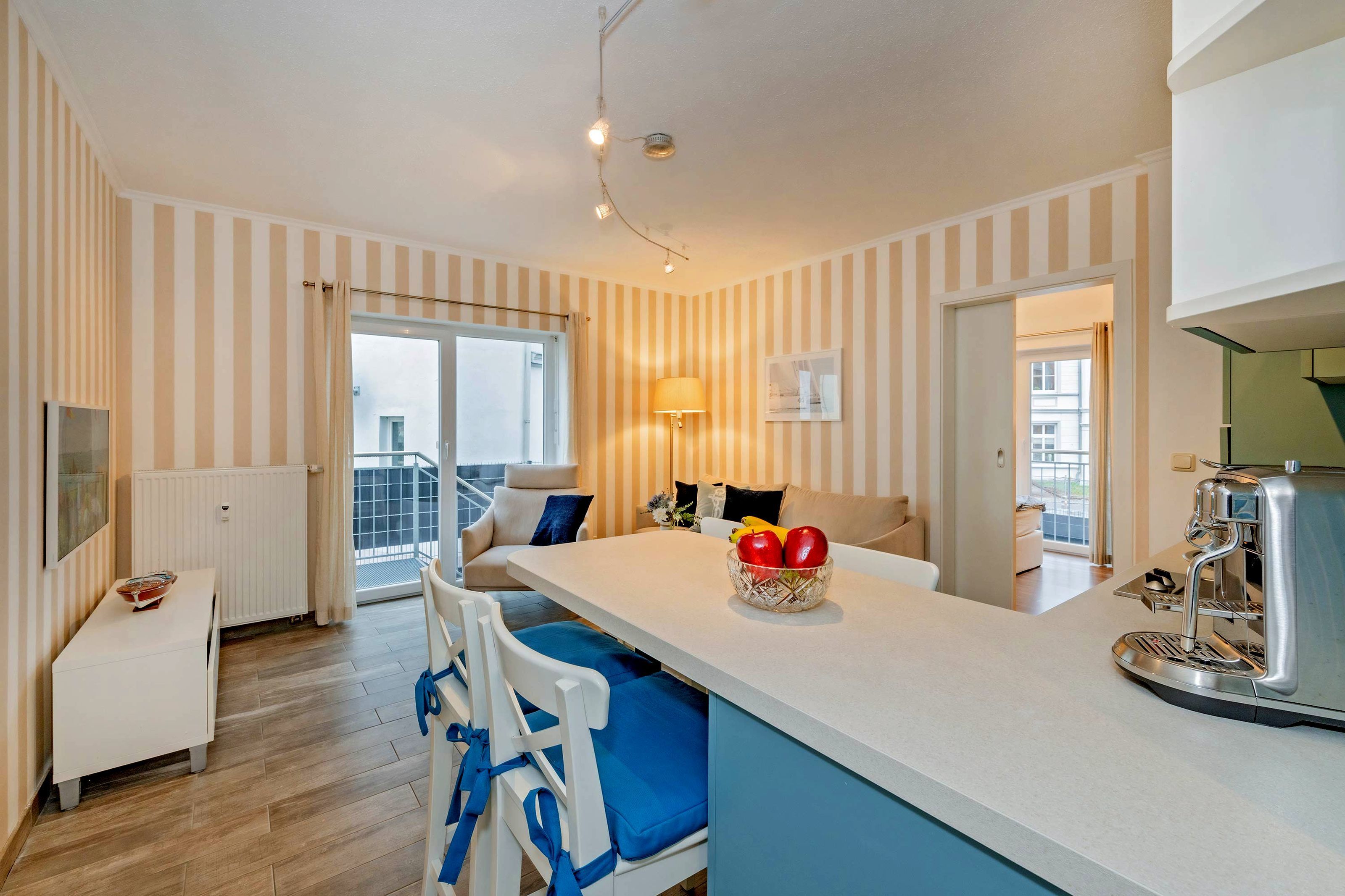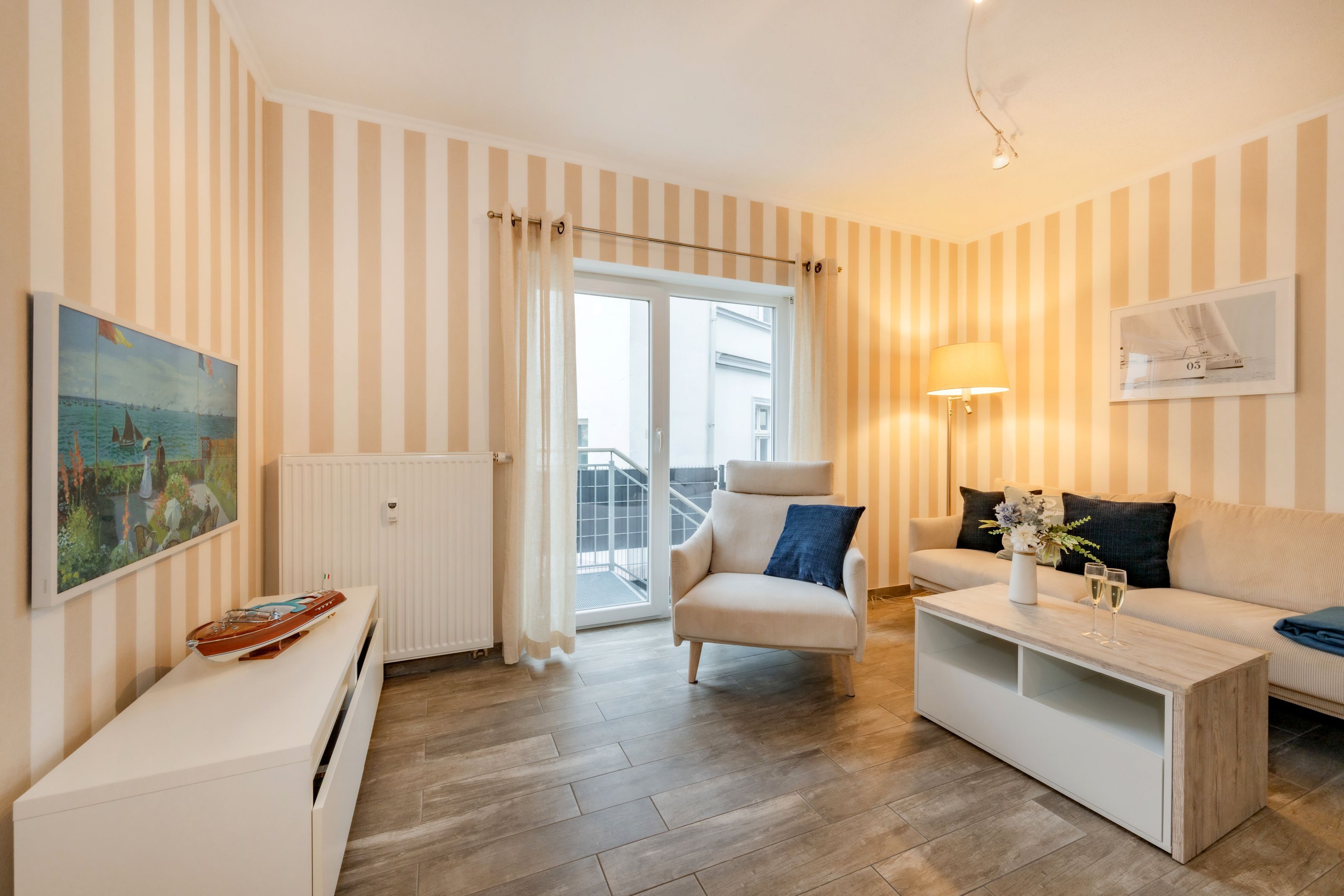 Eine moderne, im maritimen Stil eingerichtete 3-Raum-Nichtraucher-Ferienwohnung (ca. 50 qm) im Hochparterre des Appartementhauses (mit Fahrstuhl) sowie einer Terrasse, zu welcher Sie über 4 kleine Stufen einer Metalltreppe gelangen. Die Wohnung ist für 4 Erwachsene (ggf. zzgl. einem Kleinkind bis 3 Jahre) ausgestattet.
