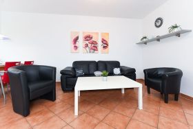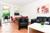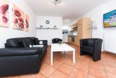 Größe ca. 60 Quadratmeter, Wohnzimmer mit integrierter Küche, Schlafzimmer, zweites separates Schlafzimmer/Kinderzimmer, Badezimmer mit Dusche, Waschtisch und WC, Erdgeschoss, Terrasse, optimal für 2 bis 5 Personen und zusätzlich ein Kleinkind.