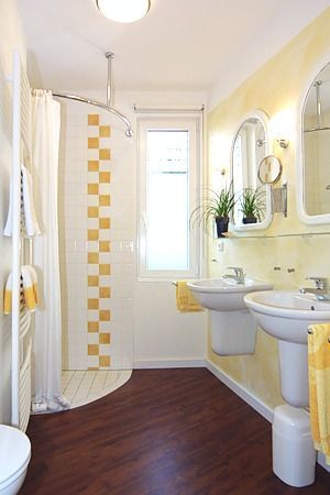 Badezimmer mit Doppel-Waschbecken, Dusche und WC