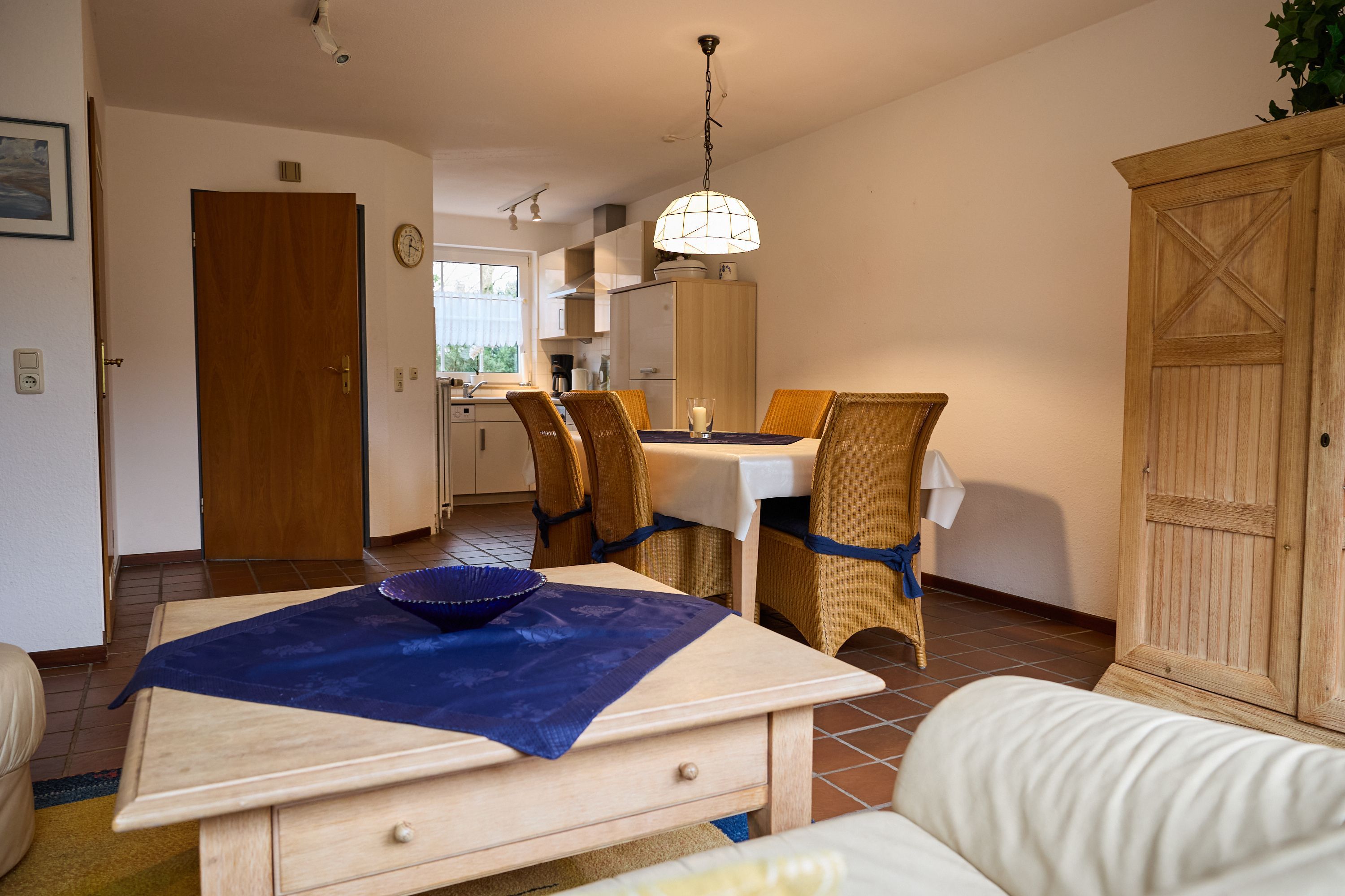 kombinierter Wohn- und Essbereich mit komplett ausgestatteter Einbauküche (u.a. Geschirrspülmaschine, Gefrierfach, Mikrowelle, Kaffeemaschine, Eierkocher, Toaster)