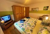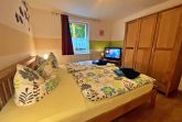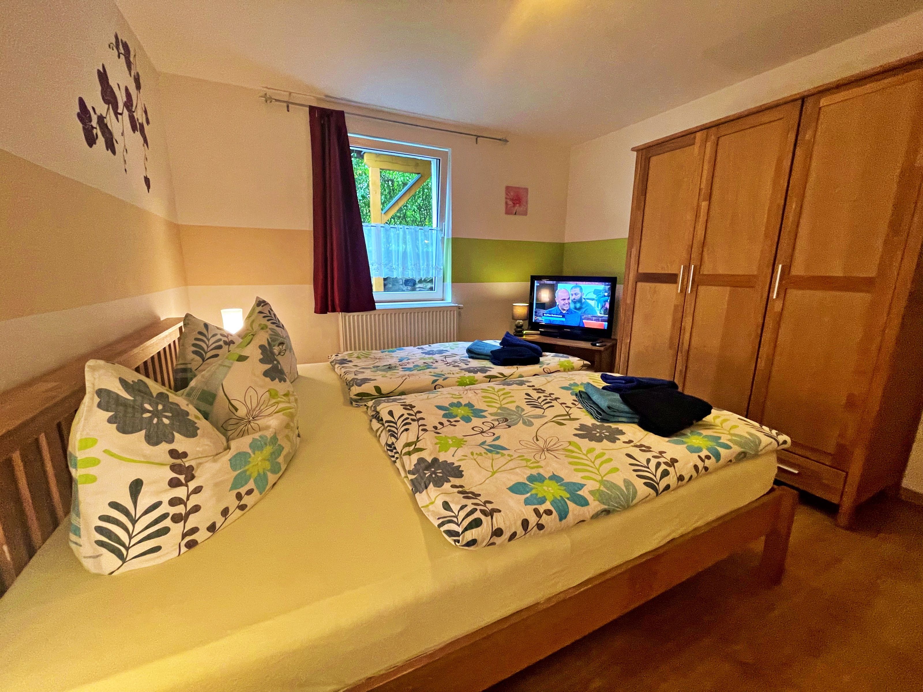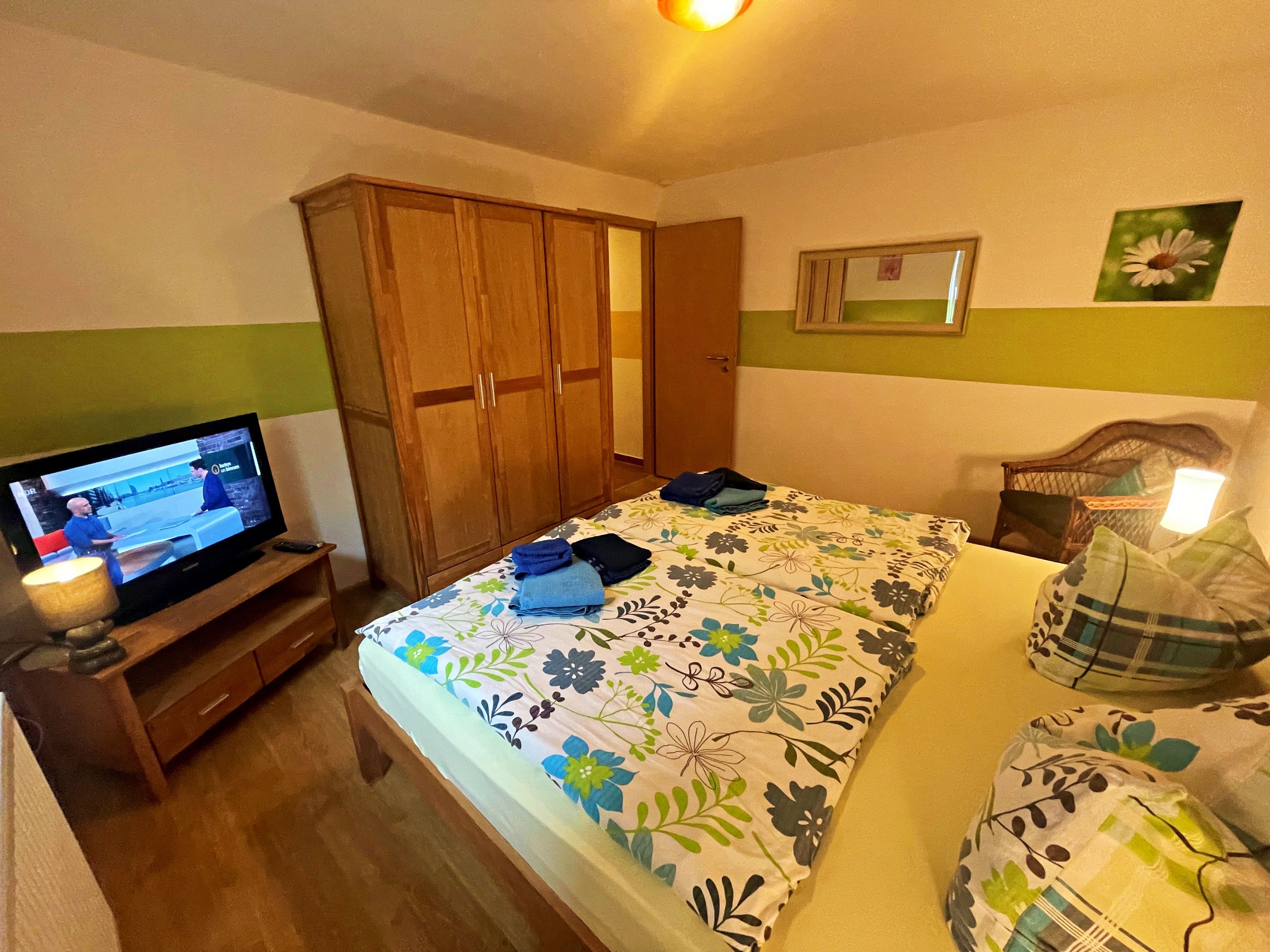 im Schlafzimmer im Erdgeschoss befindet sich ein Doppelbett (ca. 180 x 200cm), ein Flachbildfernseher, ein Kleiderschrank und eine Anrichte,