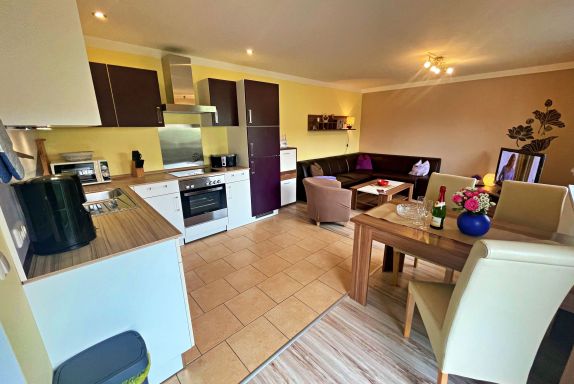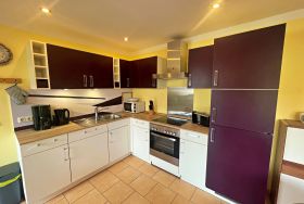 der Küchenbereich im Obergeschoss ist mit einer Einbauküche mit Herd, Backofen, Spüle, Spülmaschine, Kühlschrank mit Gefrierfach, Kaffeemaschine, Toaster, Wasserkocher, Eierkocher, Mikrowelle und Geschirr ausgestattet,