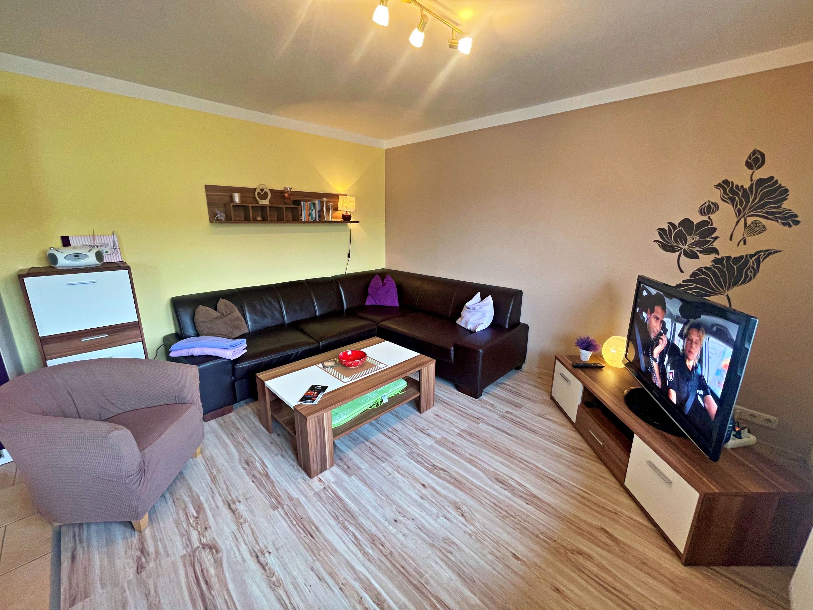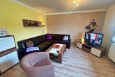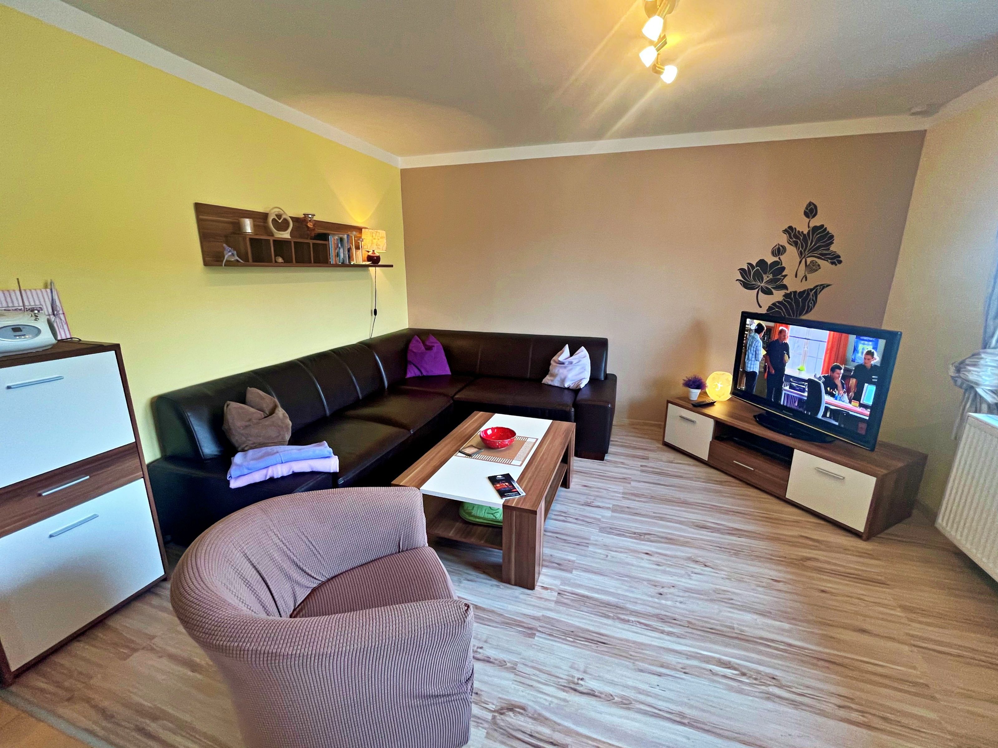 Wohnzimmer im Obergeschoss mit Couchecke, Flachbildfernseher, DVD, Radio,