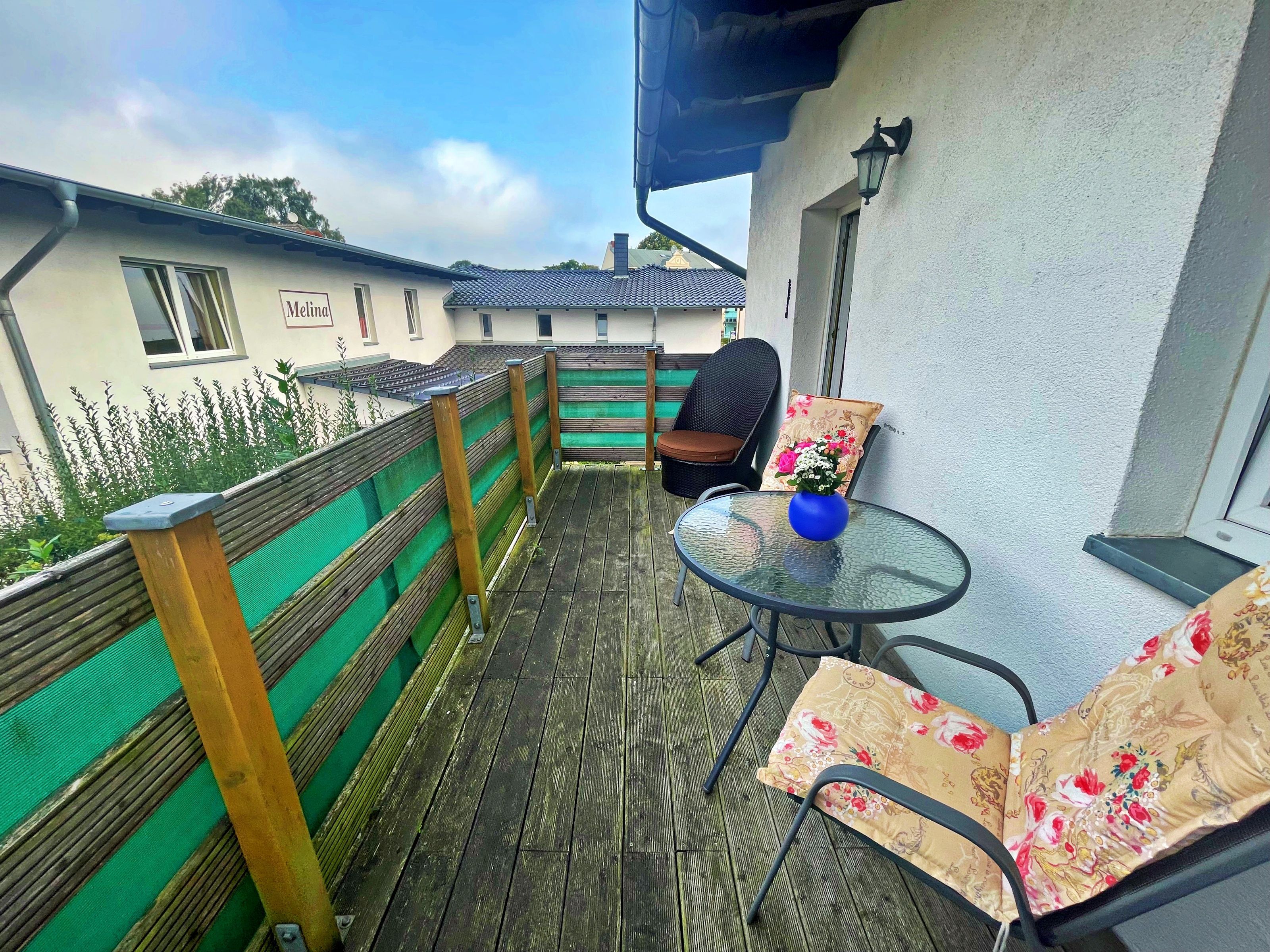 Balkon (ca. 11m²) mit Tisch und Gartenstühlen.