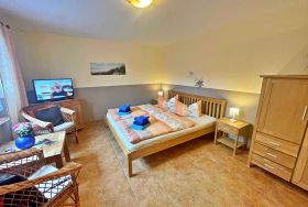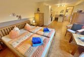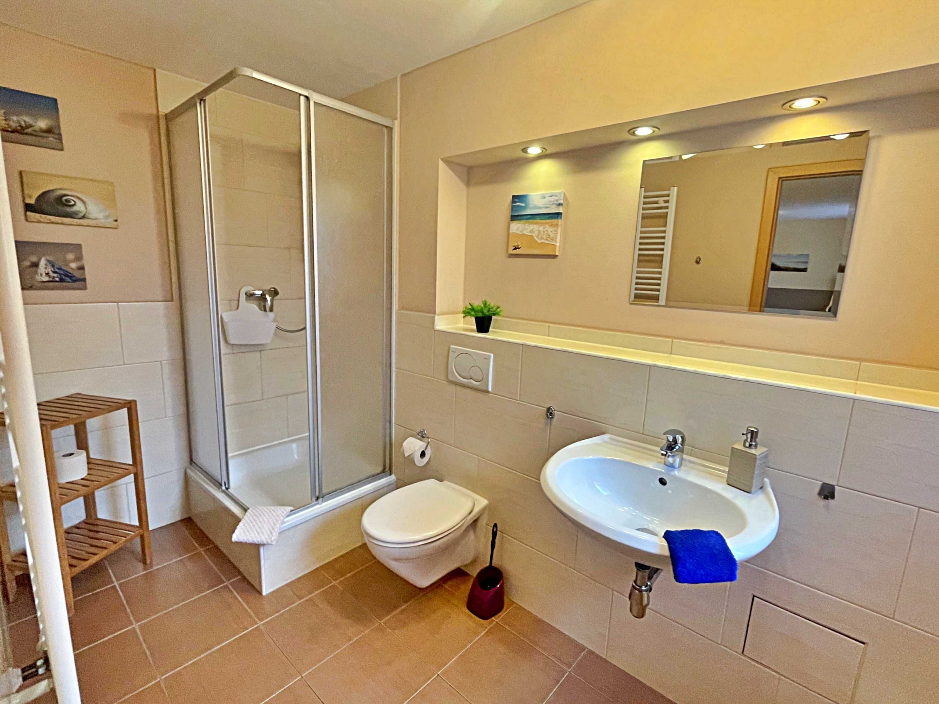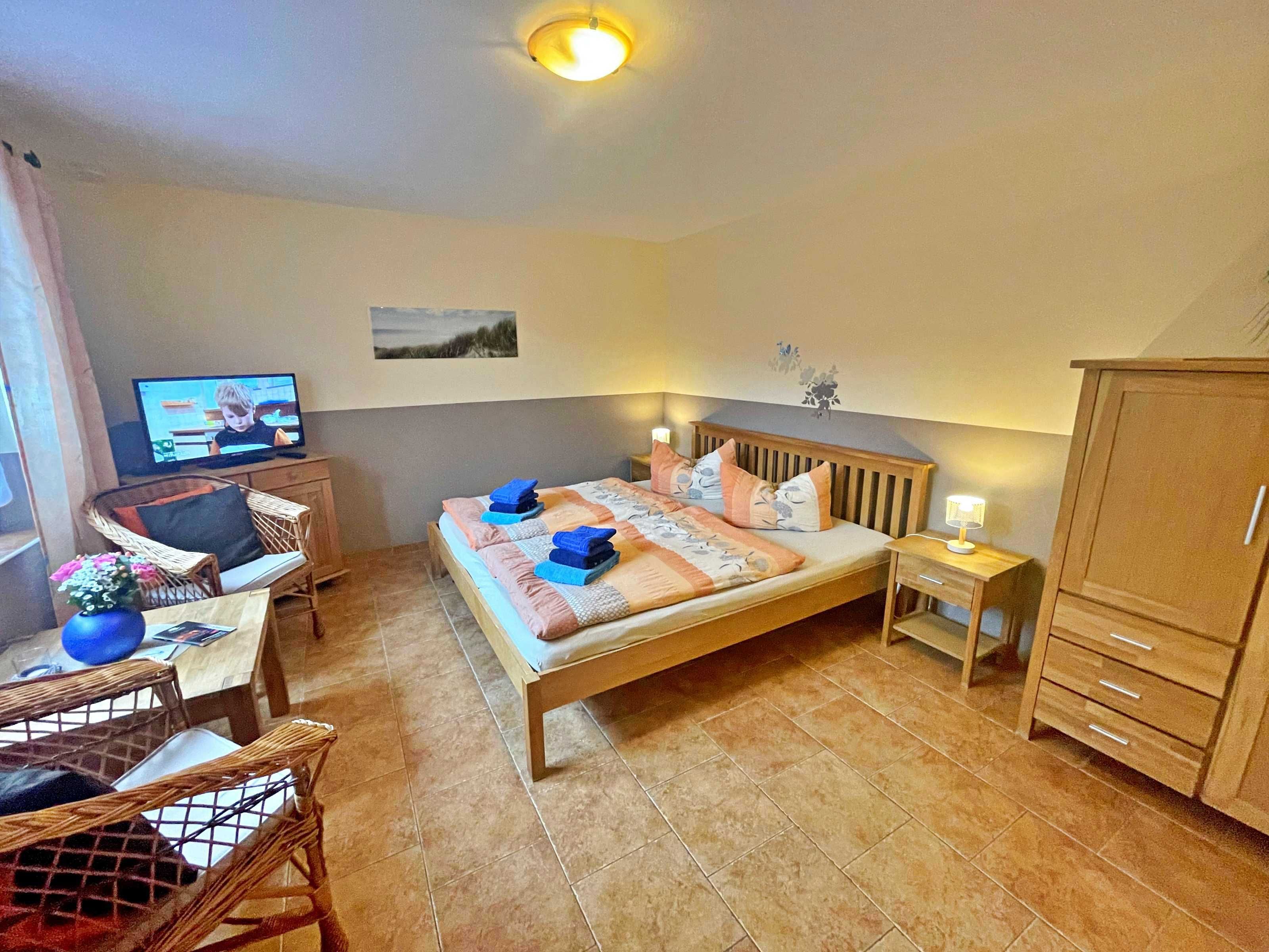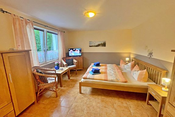Die 1-Zimmer-Ferienwohnung im Erdgeschoss verfügt über ca. 33 m² Wohnfläche aufgeteilt in einen kombinierten Wohn- und Schlafraum und ein Bad. Zur Wohnung gehört eine direkt angrenzende Terrasse und ein Kfz-Stellplatz auf dem Grundstück.