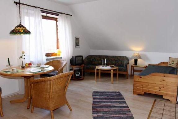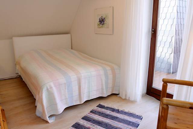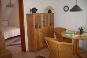 Zu dieser freundlichen Wohnung im ersten Stock mit 32 qn Wohnfläche gehört ein großer Balkon mit herrlichem Blick über Wiesen, Deich und den alten Halligleuchtturm. Sie hat ein kleines separates Schlafzimmer mit 160 m Doppelbett und einem Wohnraum mit Sofa, einem Kojenbett, Sitzecke und einer Küchenzeile. Die Wohnung ist für zwei bis drei Personen geeignet.
