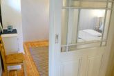 Die 45m² große Ferienwohnung befindet sich im ersten Stock und ist über eine Außentreppe mit Balkon separat und bequem zu erreichen. Die Wohnung verfügt über ein Wohnzimmer mit offener Küche, ein Bad und ein Schlafzimmer. Damit sich unser Gäste besonders wohlfühlen, haben wir nachhaltige, hochwertige Baustoffe, Materialien und Einrichtungen verwendet und so eine wie wir finden gute Mischung vorhandener, teilweise hundert Jahre alten Bauelemente und moderner Technik und Materialien geschaffen. Die Wände sind mit Lehmputz verputzt und mit Allergiker freundlicher Farbe gestrichen. Es gibt für die ganzjährige Vermietung eine Wand- oder Fußbodenheizung. Der Fußboden im Wohn- und Schlafraum ist aus heimischer massiver Kiefern-Diele und im Bad hochwertig gefliest. Die komplette Beleuchtung ist mit sparsamen LED-Lampen ausgestattet. Die Möbel im Schlaf- und im Wohnzimmer sind aus FSC-zertifiziertem Vollholz. Die Betten im Schlafzimmer sind mit 90x220 extralang und mit zwei Matratzen mit unterschiedlichen Härtegraden ausgestattet. Die Bettwäsche wird gestellt. Die Schränke sind im Landhaus-Stil.