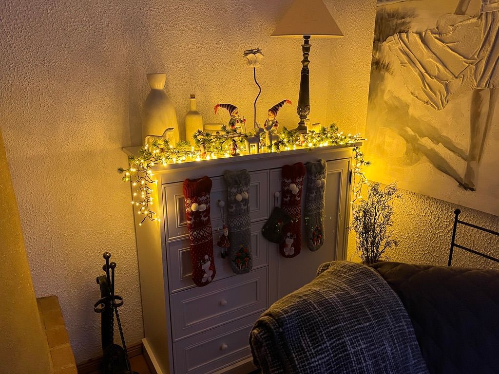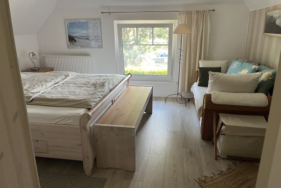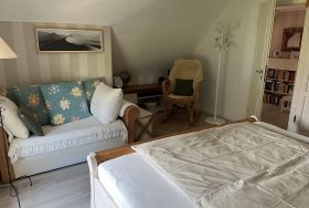 In der oberen Etage befinden sich die 2 Schlafräume mit je einem Doppelbett. Und wenn das einmal nicht reicht, kann in einem Raum eine Aufbettung erfolgen.