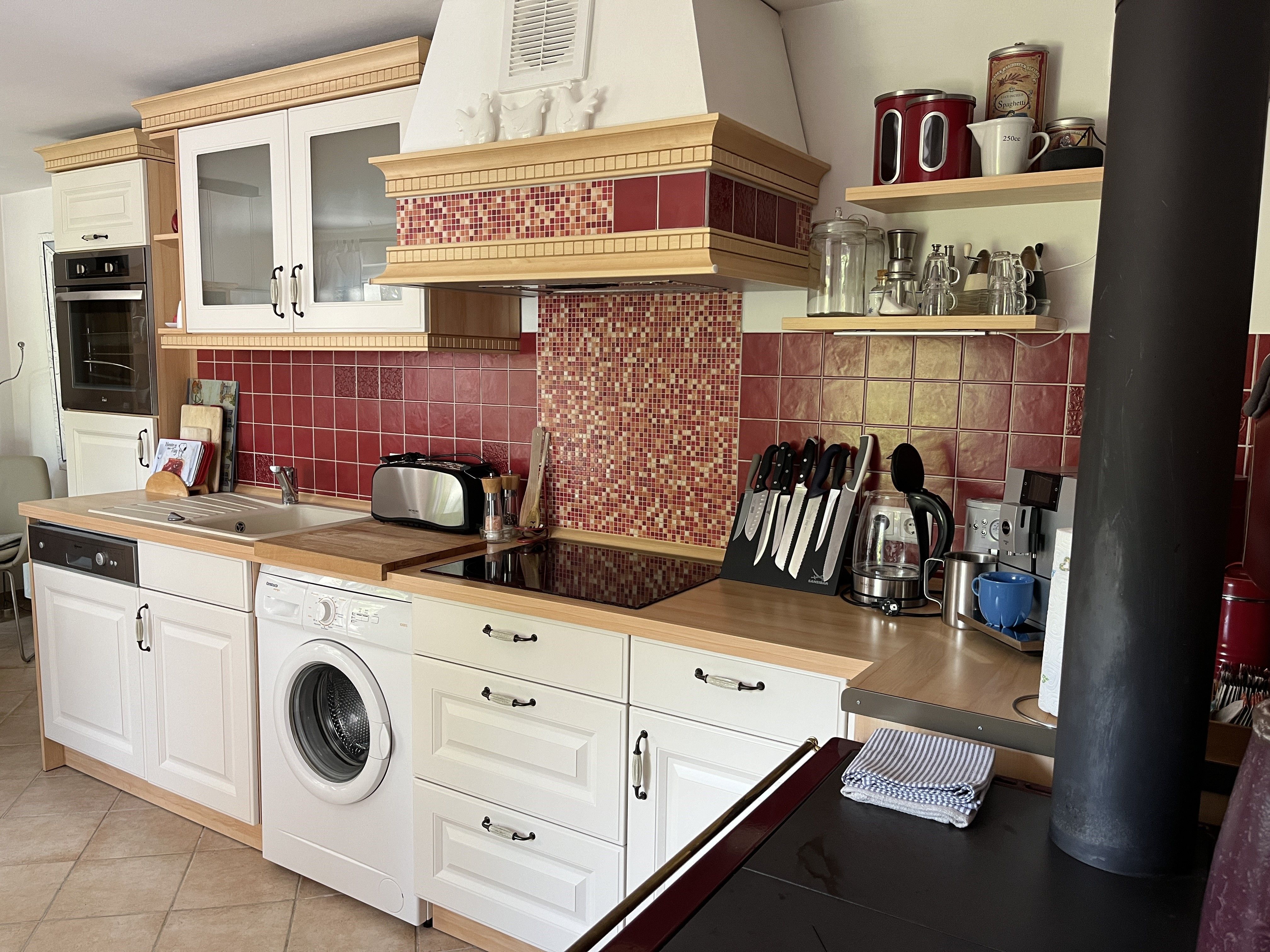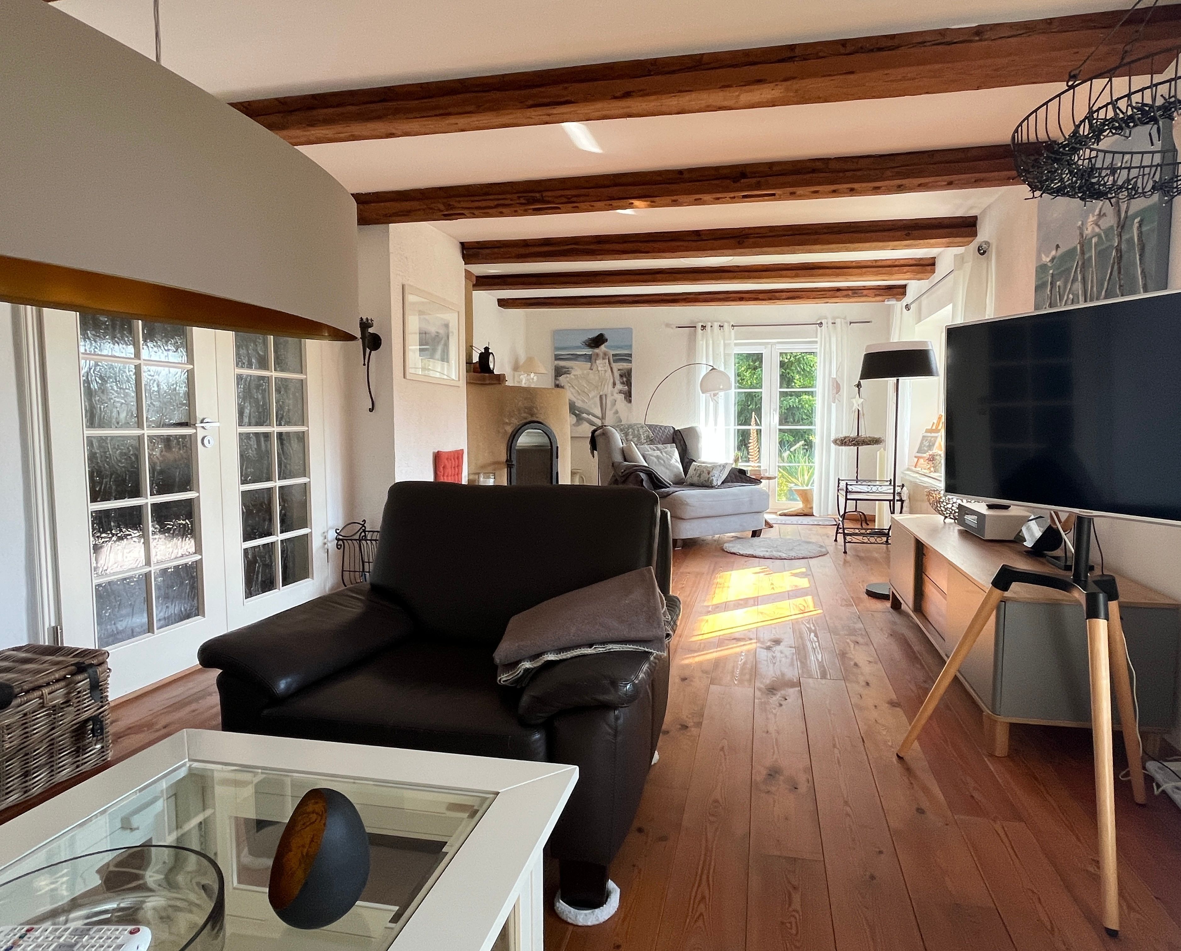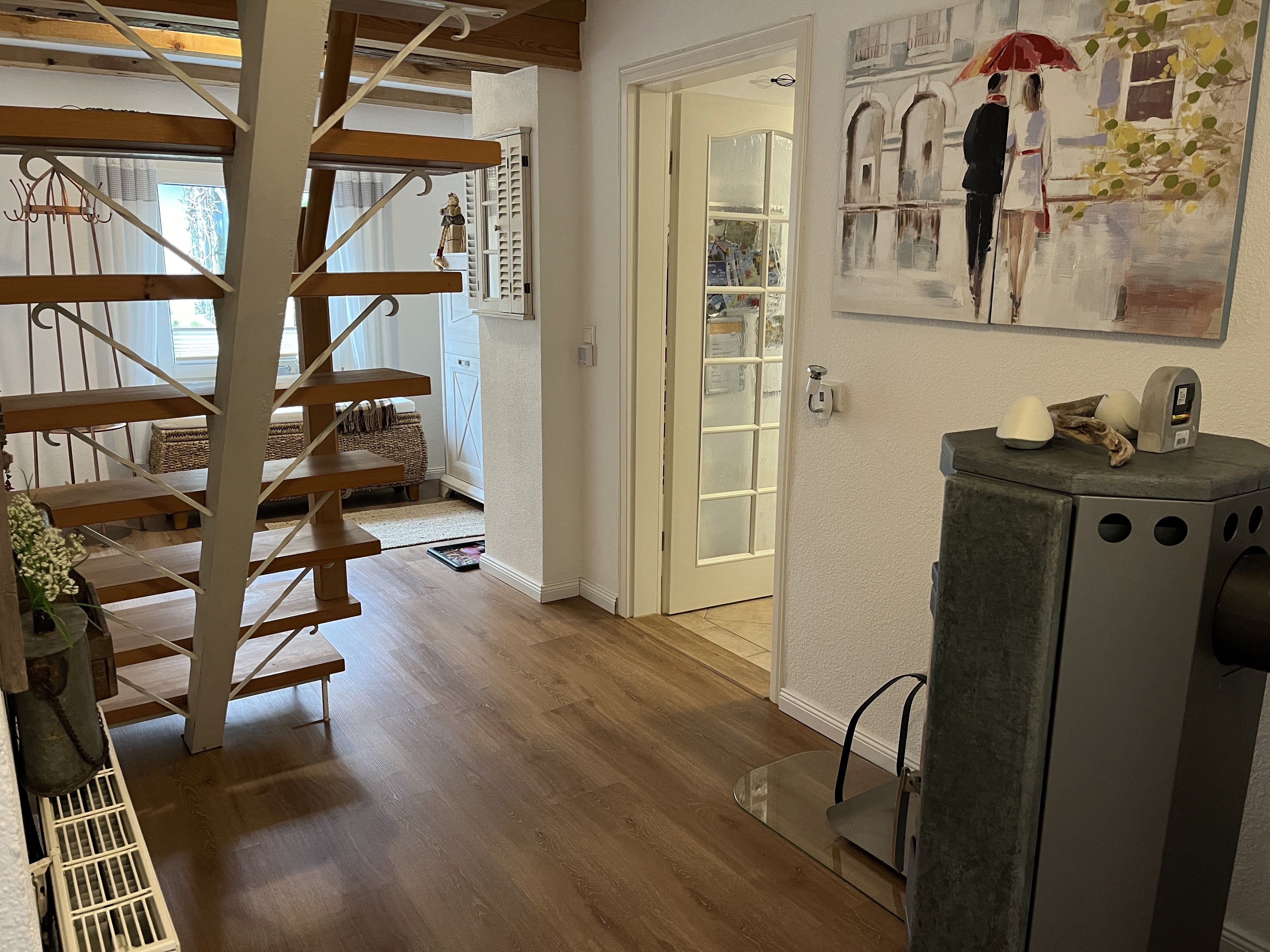 Im Erdgeschoss befindet sich der Wohnbereich mit Kaminofen, die Diele, die Küche und das Bad.