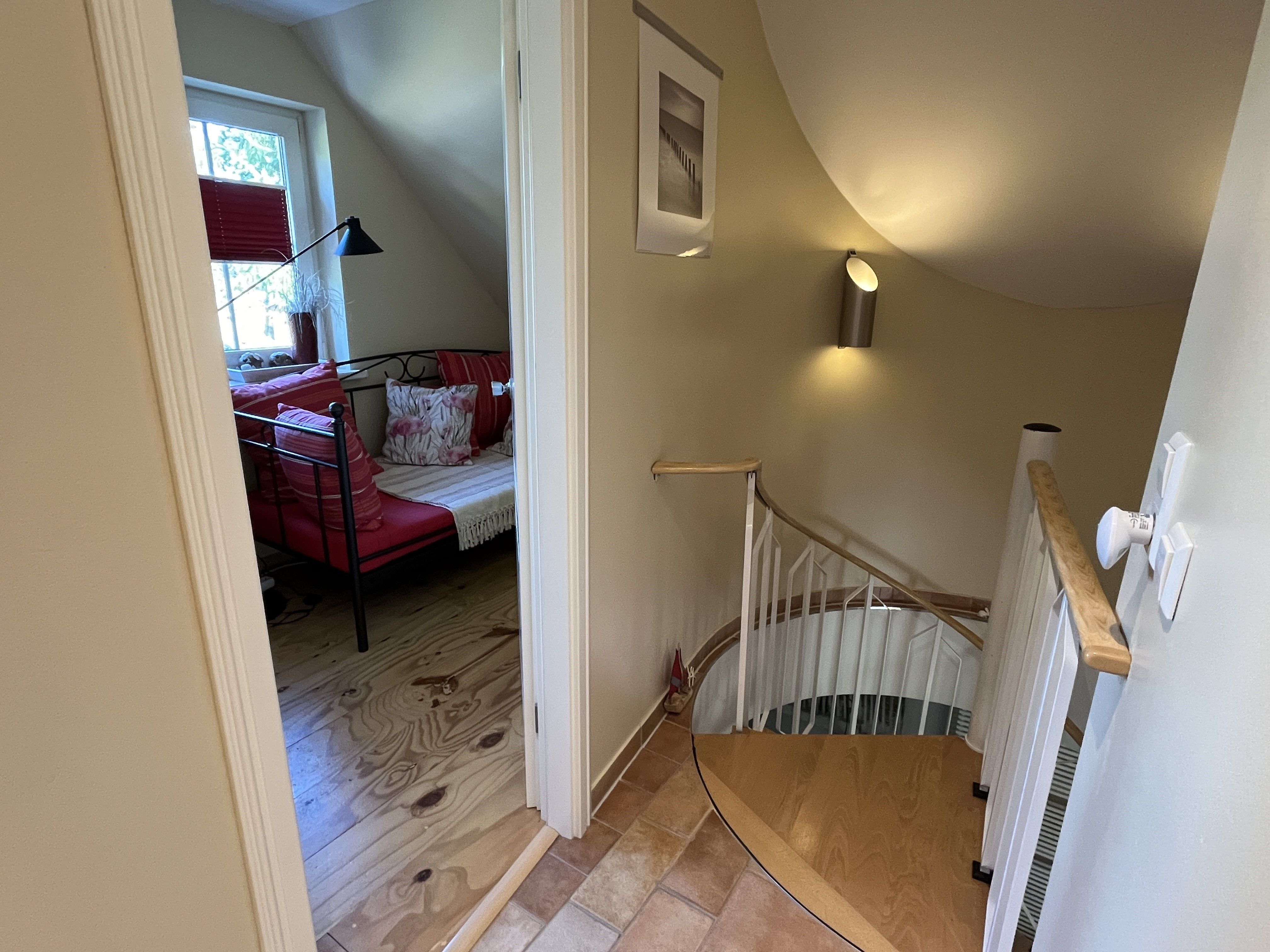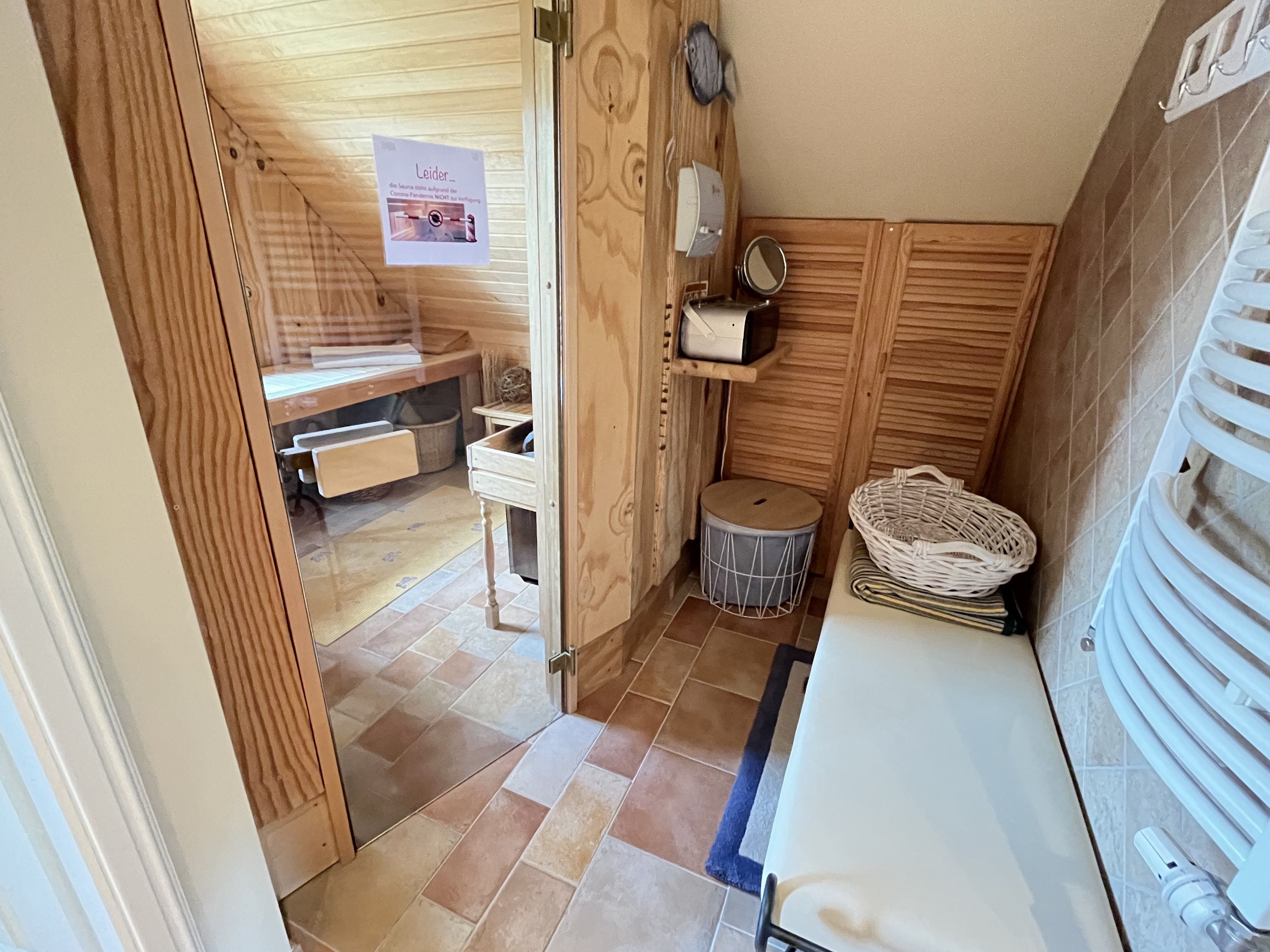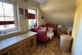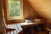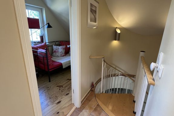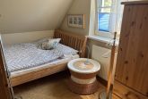 In der oberen Etage befinden sich neben der Sauna 10,00€ (inkl. separate Duschmöglichkeit) auch die 2 Schlafräume (jeweils mit Doppelbett). Und wenn das einmal nicht ausreicht, kann in einem Raum eine Aufbettung erfolgen. Von hier gelangen Sie in den Bereich des Bades und auf die Terrasse sowie in den Aufgang ins Obergeschoss des Ferienhauses. Das großzügige Bad, mit Wanne und Duschbereich, lädt auch gern zum „Wohlfühlen“ ein.