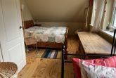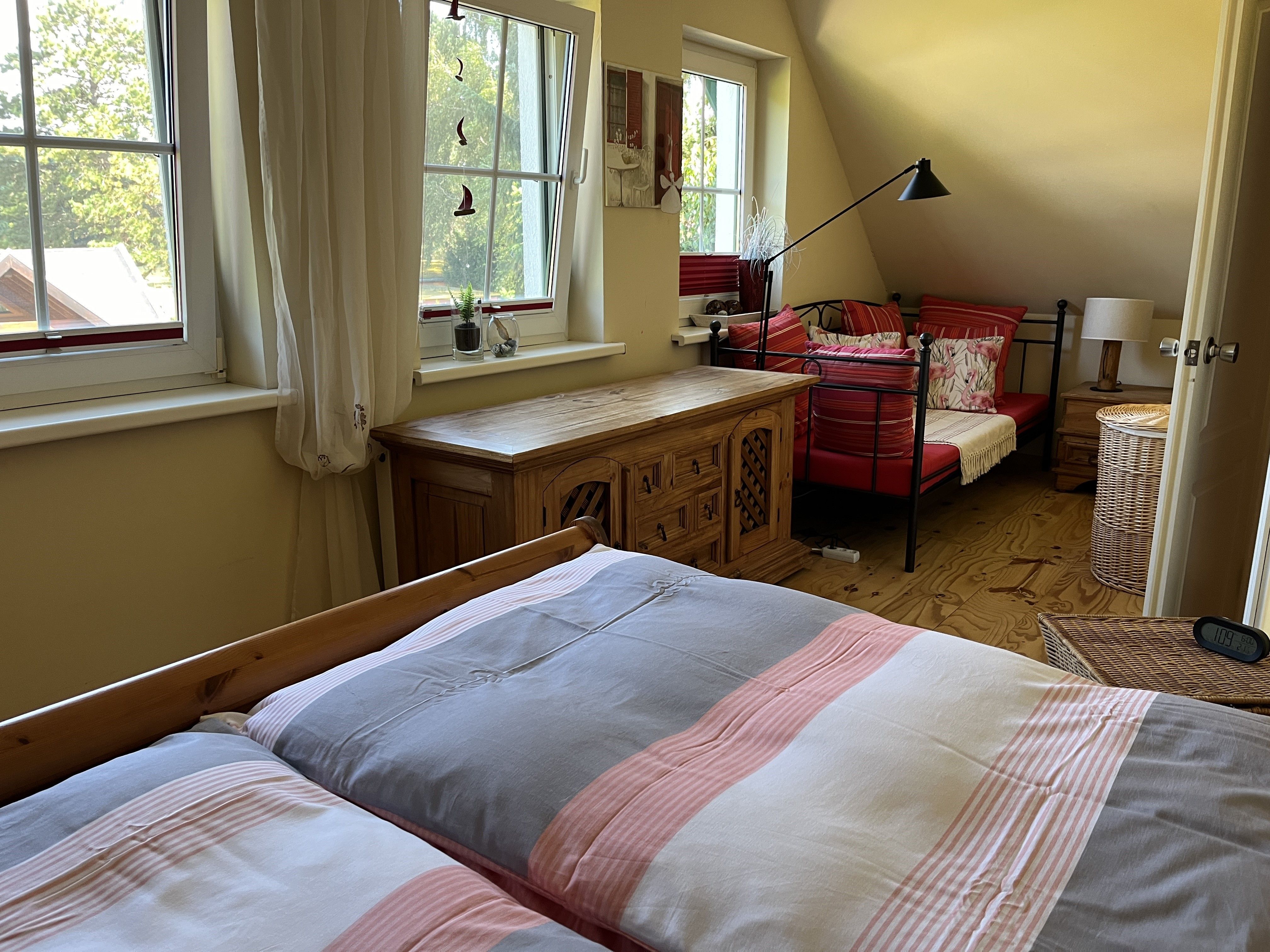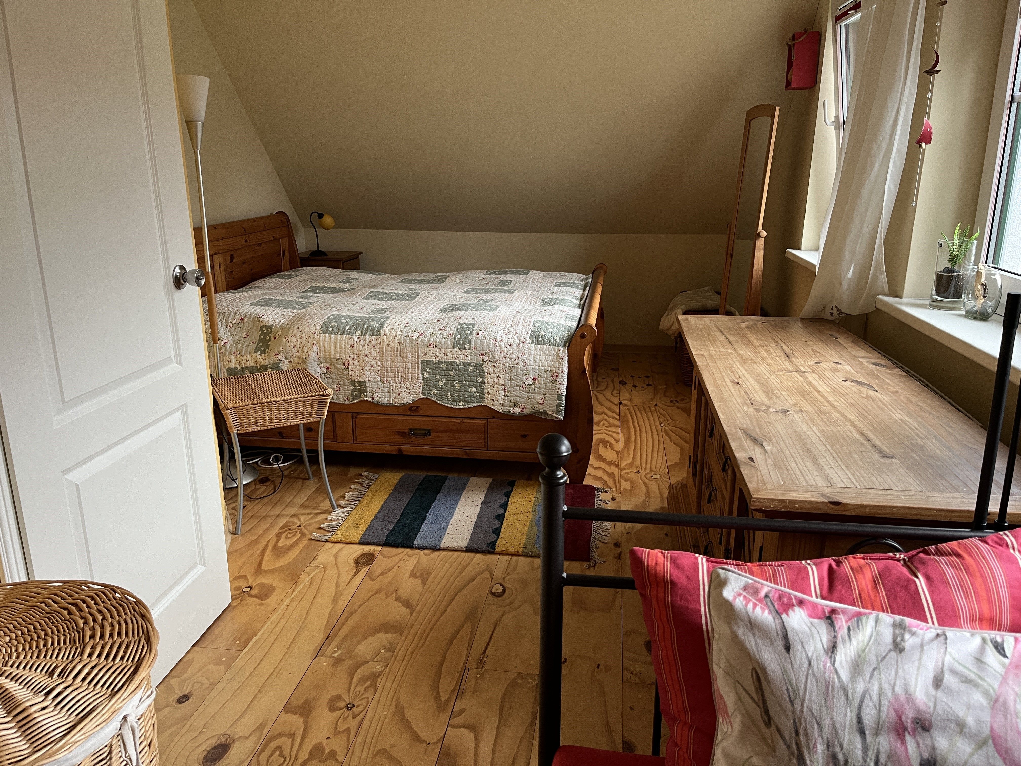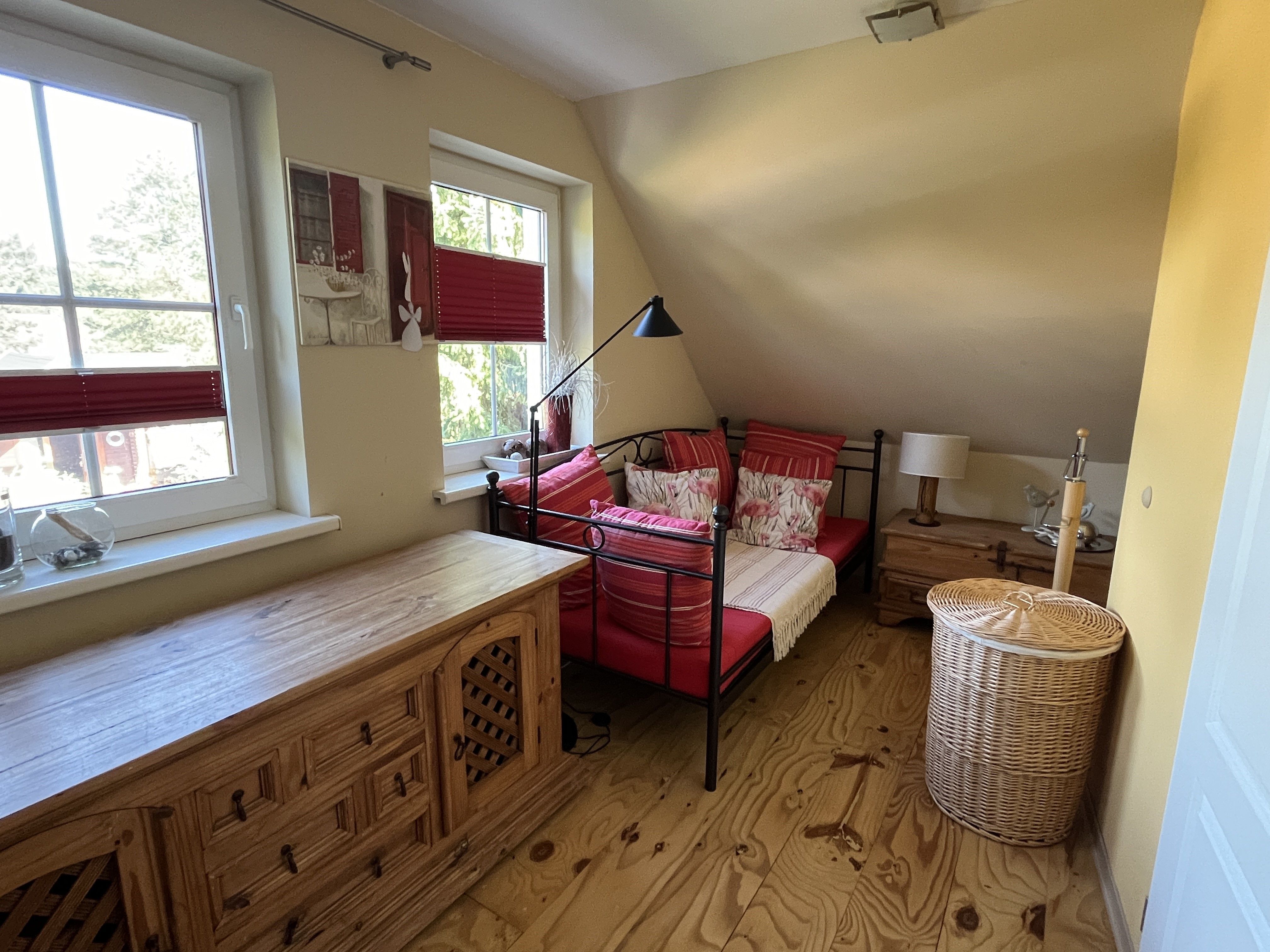 In der oberen Etage befinden sich neben der Sauna 10,00€ (inkl. separate Duschmöglichkeit) auch die 2 Schlafräume (jeweils mit Doppelbett). Und wenn das einmal nicht ausreicht, kann in einem Raum eine Aufbettung erfolgen. Von hier gelangen Sie in den Bereich des Bades und auf die Terrasse sowie in den Aufgang ins Obergeschoss des Ferienhauses. Das großzügige Bad, mit Wanne und Duschbereich, lädt auch gern zum „Wohlfühlen“ ein.