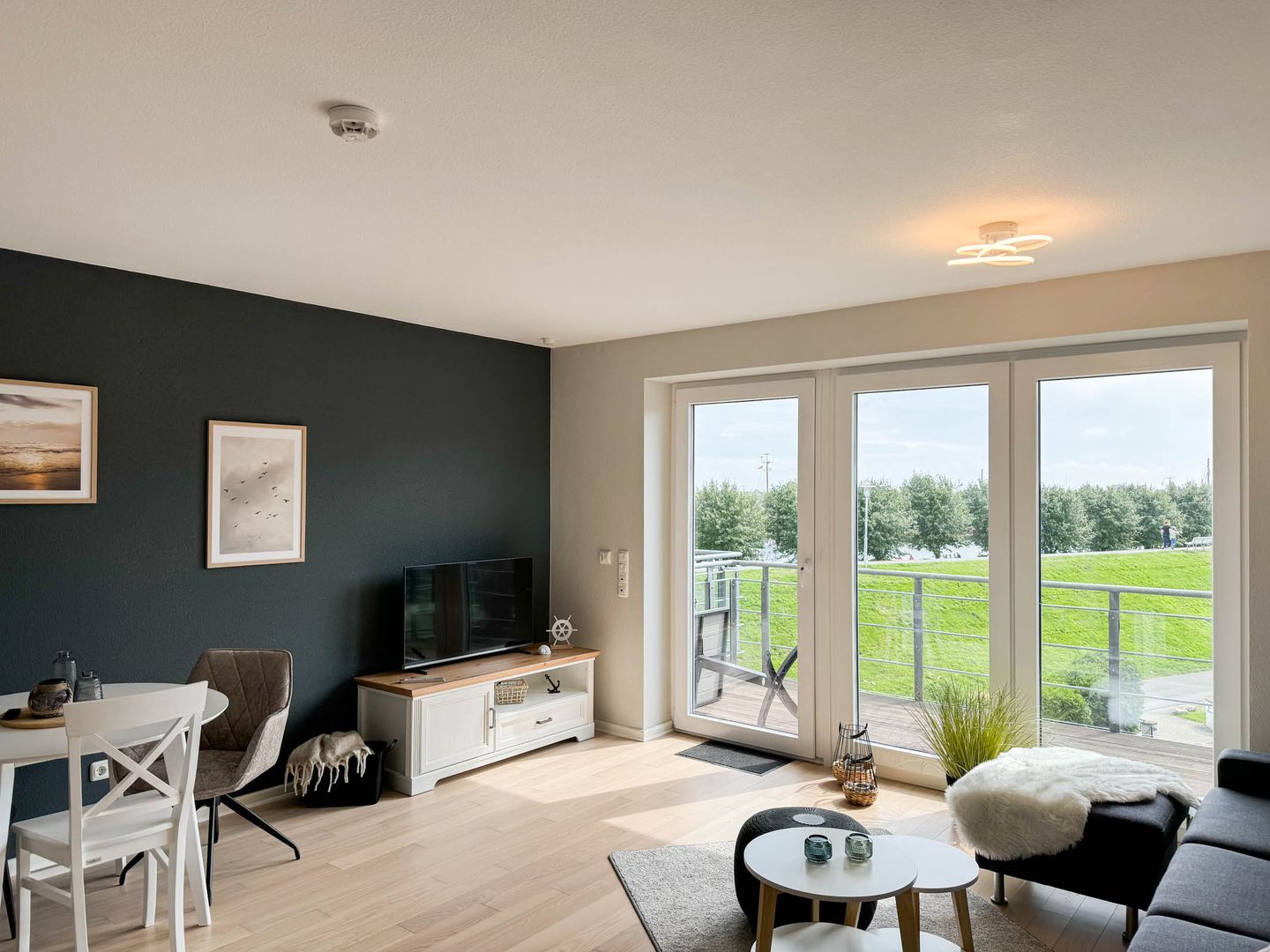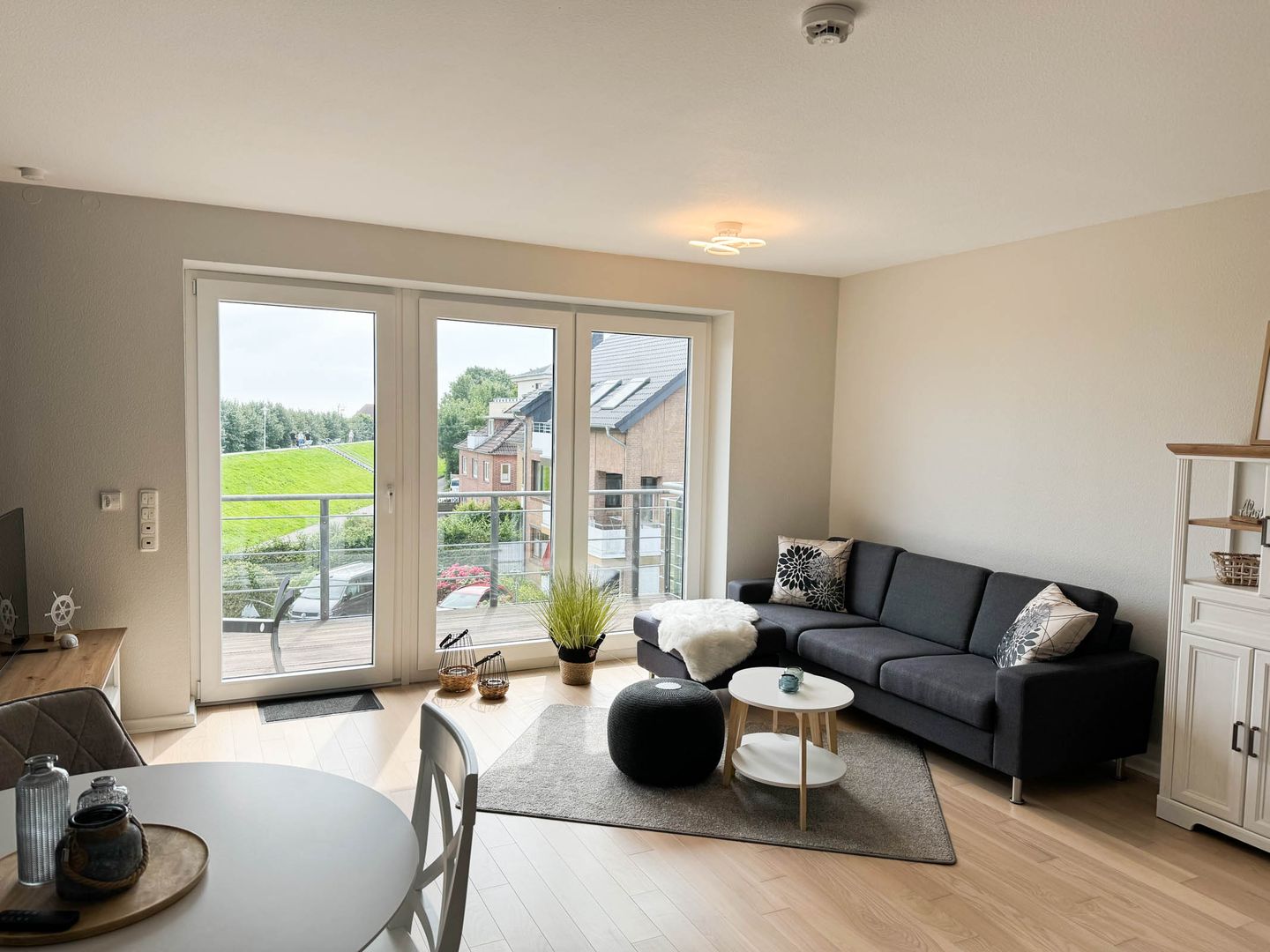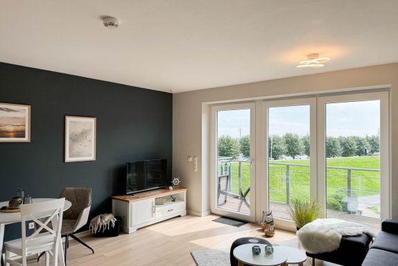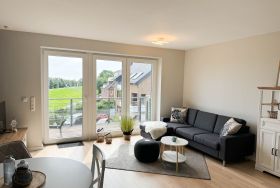 Die Ferienwohnung 2.3 (55qm) liegt im 2. Obergeschoss und ist eine helle, moderne 2-Raum-Wohnung mit Balkon in Südwest-Lage. Die Küchenzeile und der Essbereich sind direkt im Wohnbereich integriert. Das Bad verfügt über eine ebenerdige Dusche, WC.