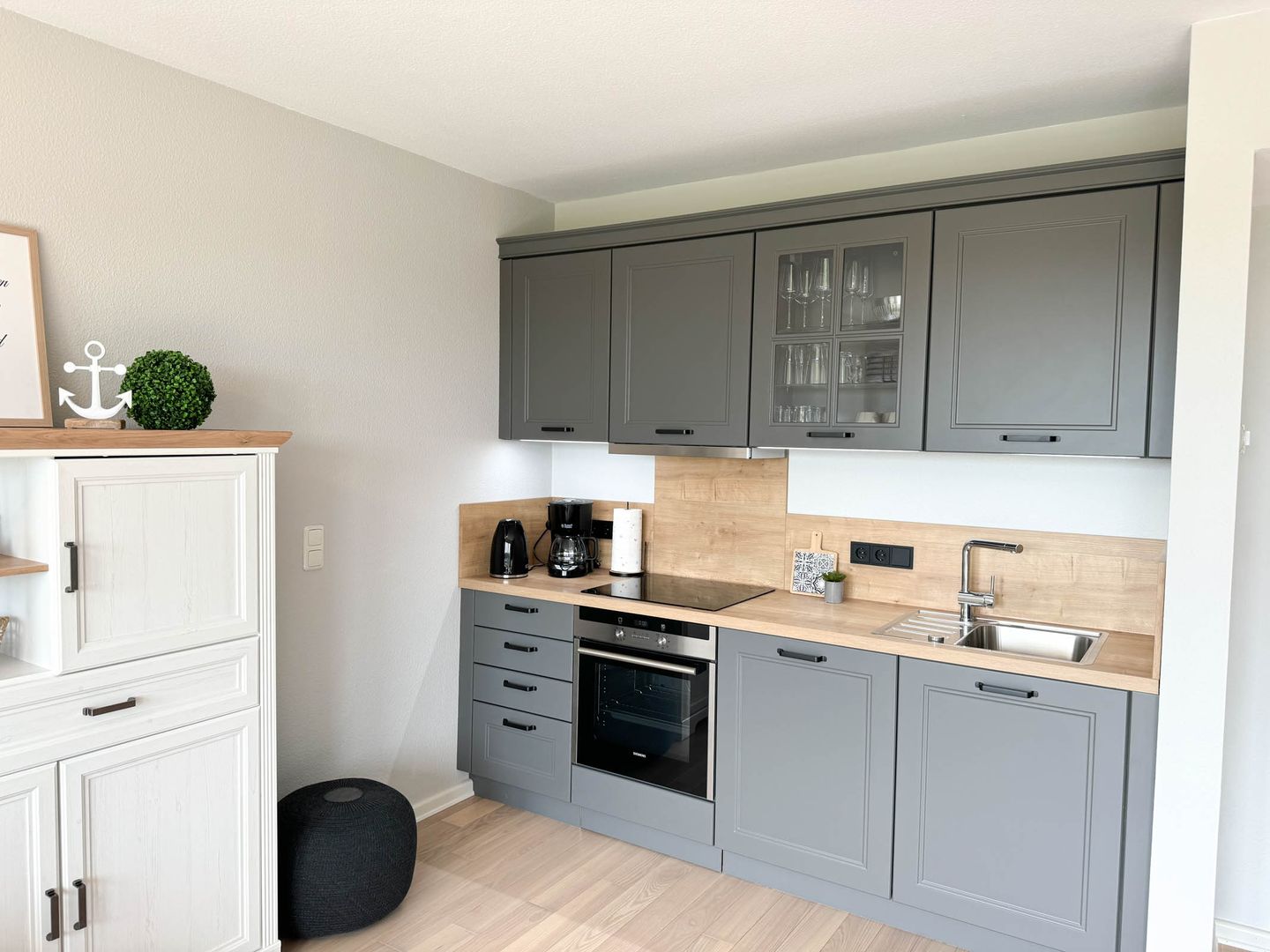 Küchenzeile: Geschirrspüler, Backofen, Kochfeld, Kühlschrank mit Gefrierfunktion, Heißwasserkocher, Kaffeemaschine, Toaster.
