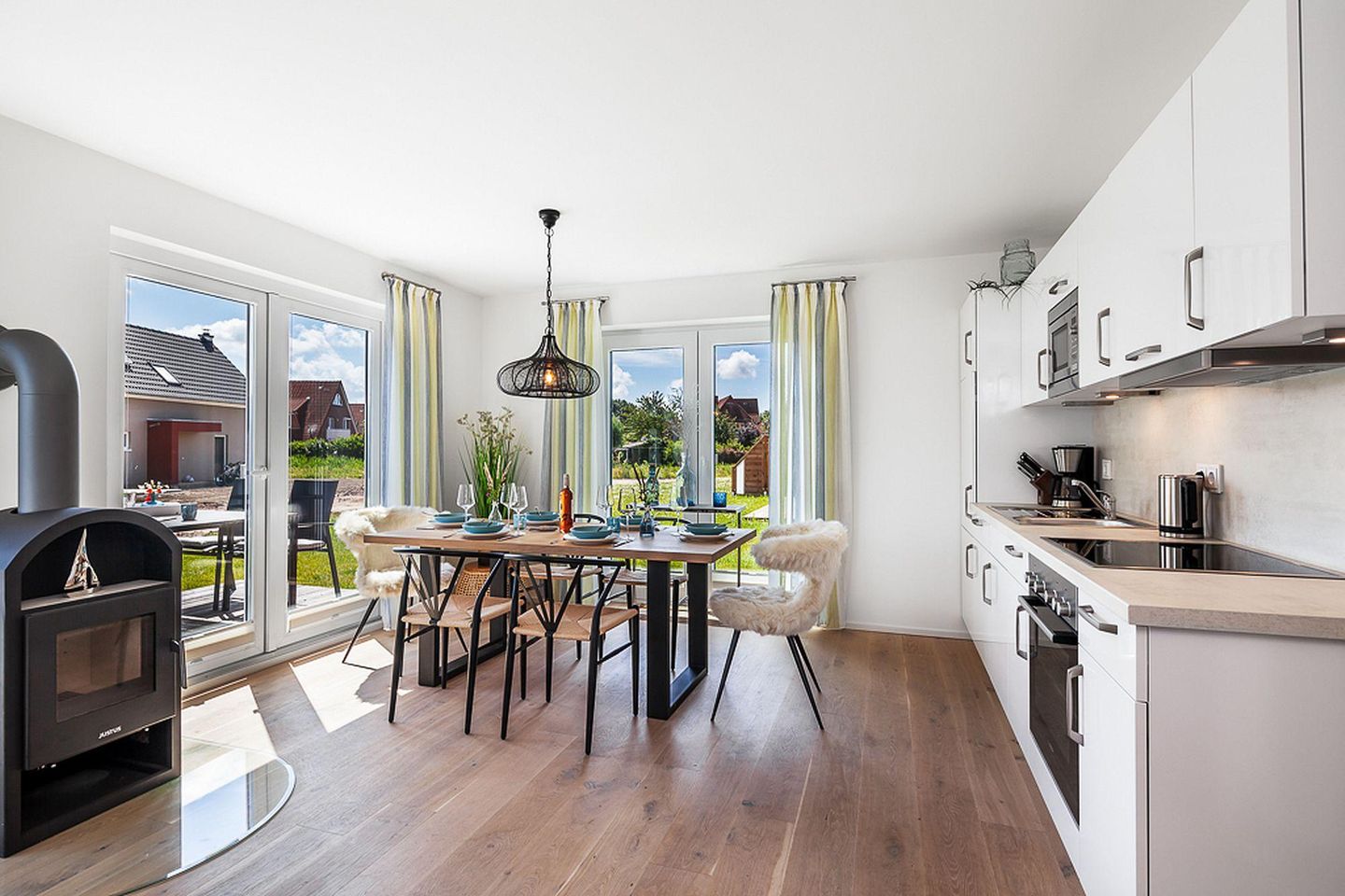 Hobbyköche können sich in der modernen Nobilia-Küche mit hochwertiger Ausstattung austoben und ein tolles Menü zaubern. Zum Lunch trifft man sich am schönen Esstisch, der Platz bietet für sechs Personen. Und den abschließenden Sundowner nimmt man bei Sonnenuntergang auf der windgeschützten Terrasse ein.