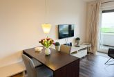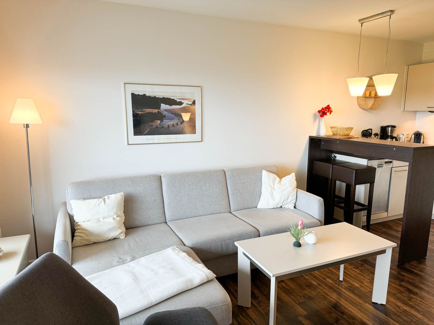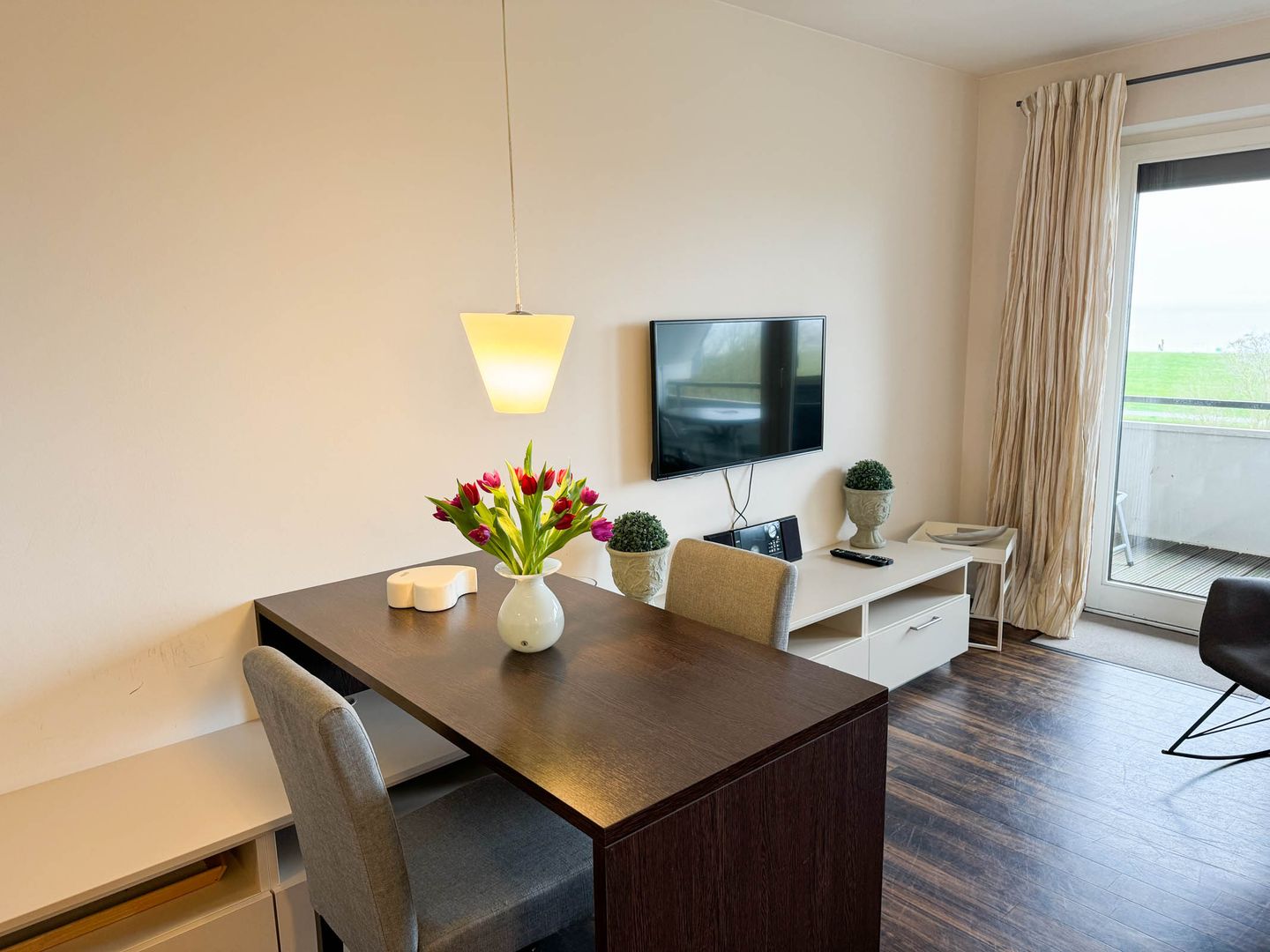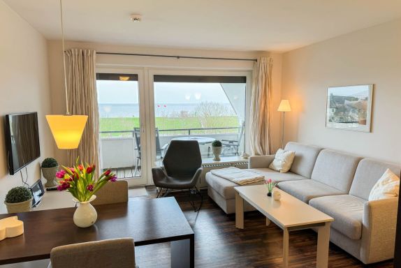 Vom eingangsnahen Parkplatz 48 erreichen Sie mittels Fahrstuhl bequem Ihr App. „Meeresleuchten“ im 4. OG. Schon beim Eintritt in den mit Einbauschränken ausgestatteten Flur öffnet sich ein grandioser Blick über den Balkon auf die Nordsee oder das Wattenmeer. Im Wohnzimmer lädt eine neue, gemütliche Couch zum Verweilen ein, die sich im Handumdrehen in ein komfortables Bett mit 14cm Kaltschaummatratze als Schlafmöglichkeit auch für eine 3. Person umwandeln lässt. Ein großer TV-Flatscreen und eine CD-Anlage mit Radio rundet das Angebot zum Unterhalten oder Entspannen ab. Von dort gelangen Sie auf den Südwestbalkon mit bequemen Balkonmöbeln und 2 Sonnenschirmen ausgestattet, von dem Sie vorbeiziehende Schiffe oder traumhafte Sonnenauf- oder -untergänge bei einem Glas Wein oder einem Imbiss genießen können. In der zum Wohnraum offen gelegenen Küche mit Espressomaschine, Mikrowelle, Geschirrspüler, Cerankochfeld, Kühlschrank mit Gefrierschrank können Sie Ihre Mahlzeiten auch an einer Essbar genießen, von der Sie auch einen schönen Blick auf das Naturerbe Wattenmeer haben. Ein weiterer Essbereich schließt sich dem offenen Wohnzimmer an. Das Schlafzimmer ist mit einem bequemen Doppelbett , genügend Stauraum in 3 Schränken, Schuhablage und einem zusätzlichen Flachbildfernseher ausgestattet. Im modernen Badezimmer finden Sie eine Dusche, WC, Handtuchheizung, Föhn und Kosmetikspiegel. Durch neue elektrische Außen-Rolläden an allen Fenstern können Sie das Appartement gegen Sonne, Tageslicht und Lärm schützen.