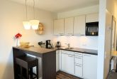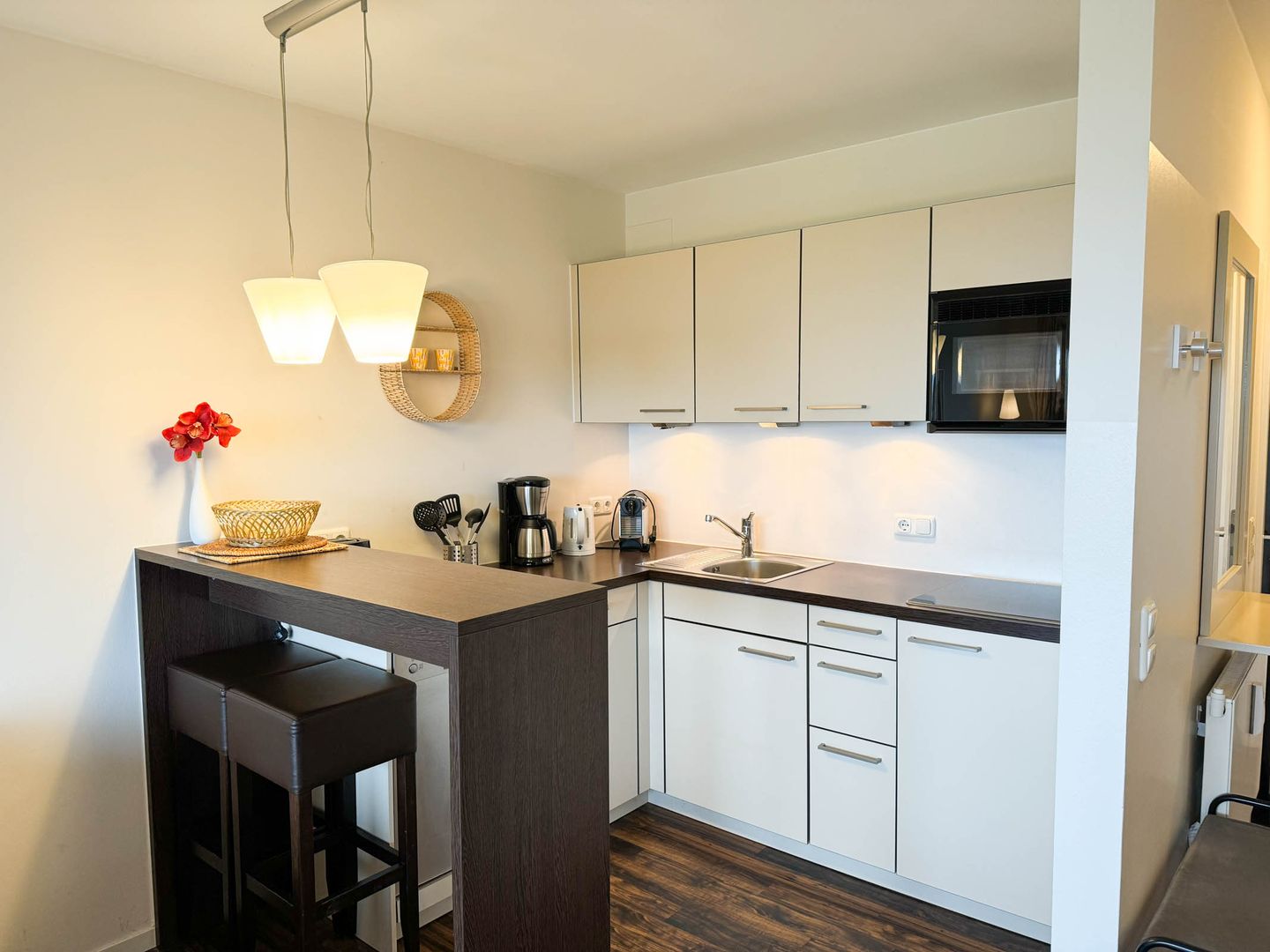 Küchenbereich: Esstresen, Geschirrspüler, Cerankochfeld, Mikrowelle, Kühlschrank mit Gefrierfach, Filterkaffeemaschine, Nespresso-Kapselmaschine, Wasserkocher, Toaster.