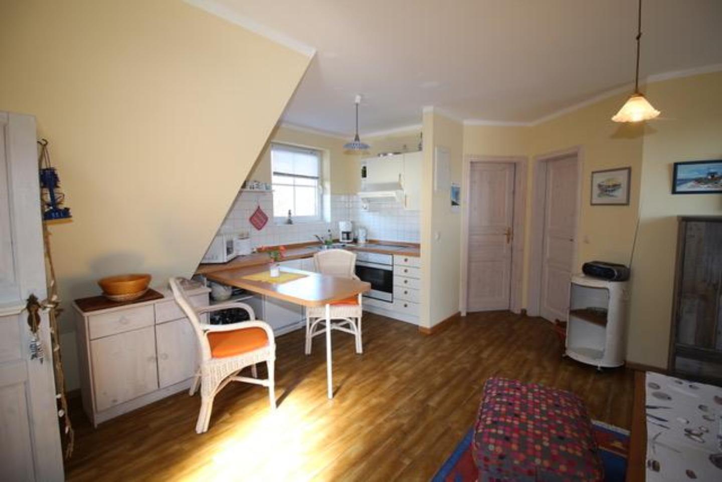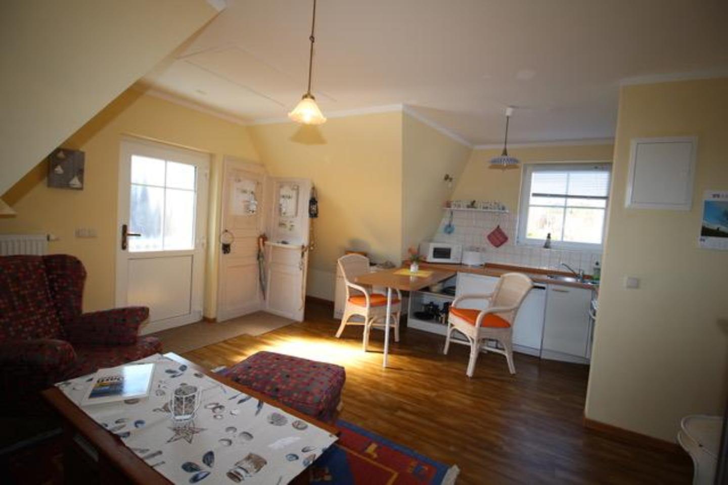 Eigener Zugang. Wohnzimmer mit Küchenzeile, Spülmaschine und Mikrowelle.