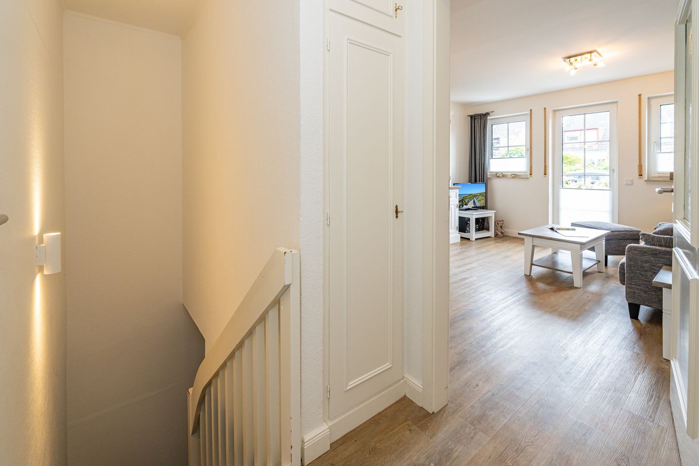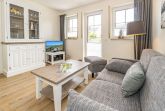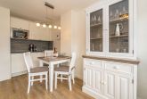 Vom Eingangsbereich kommen Sie in das gemütliche Wohn-/Esszimmer mit Sofa, TV, Essplatz und einer offen gestalteten Landhausküche (Geschirrspüler, Mikrowelle, Cerankochfeld, Nespresso-Maschine). Vor dem Wohnzimmer liegt die Südterrasse mit Gartenmöbeln (saisonal).