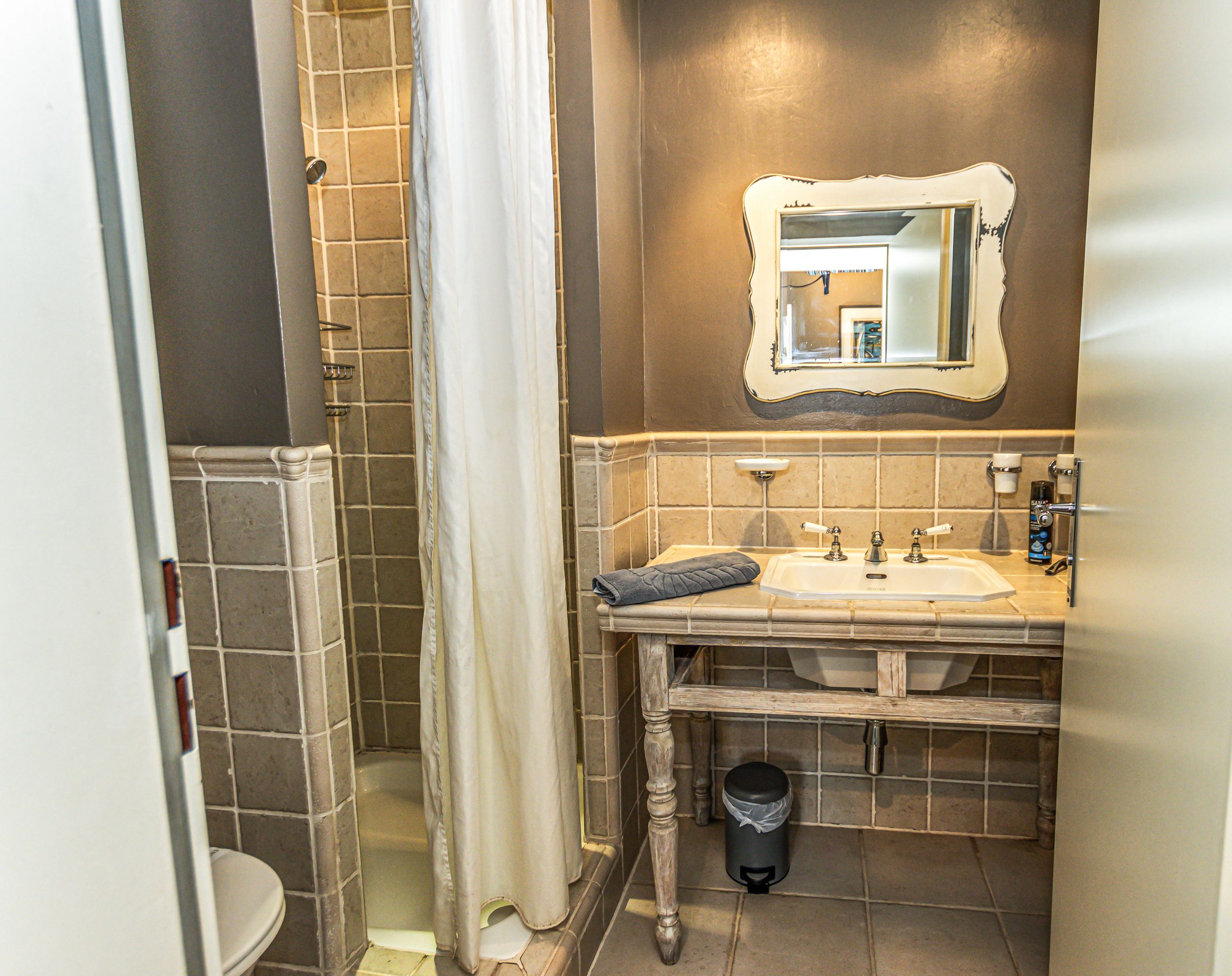 • Badezimmer mit Dusche, Waschtisch und WC