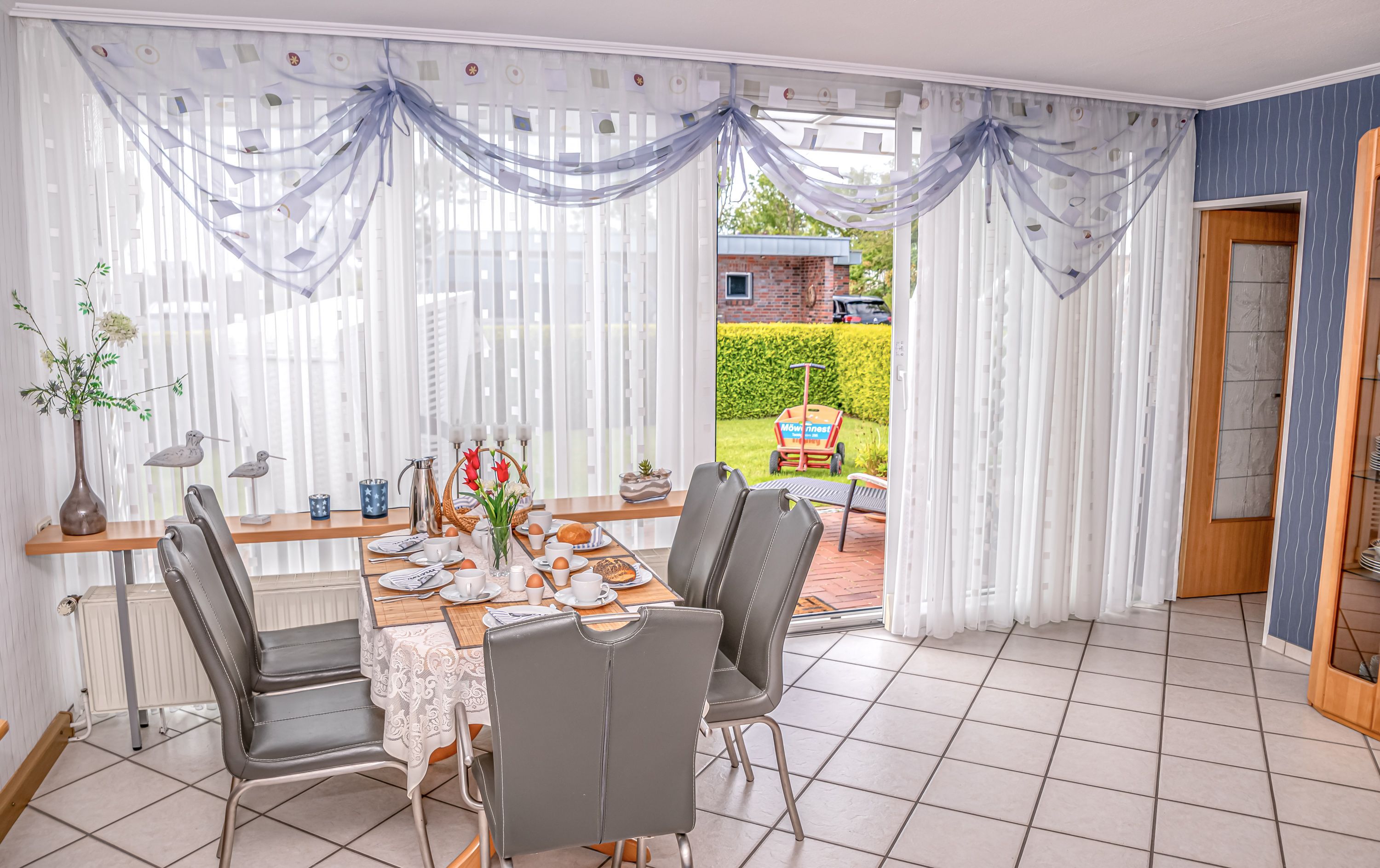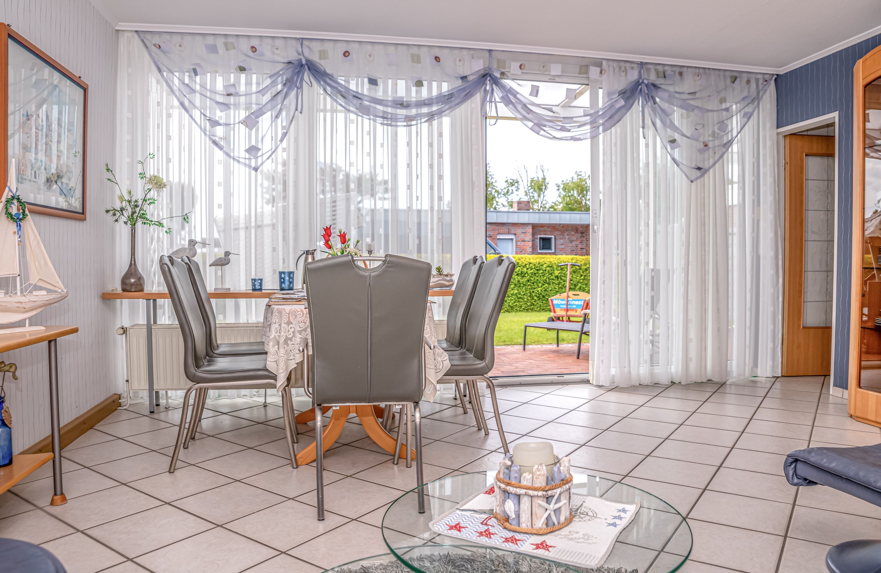 Das Ferienhaus Möwennest verfügt über zwei Fernseh-Geräte und einen kostenlosen WLAN-Zugang. Die Terrasse liegt am Wohnzimmer und ist überdacht.
