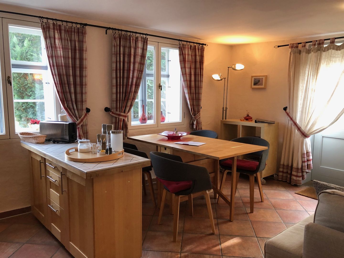 Die Küche ist mit einem Cerankochfeld (ohne Backofen), Mikrowelle, Kühlschrank mit Gefrierfach, Kaffeemaschine, Toaster und Wasserkocher augestattet.