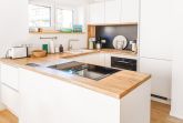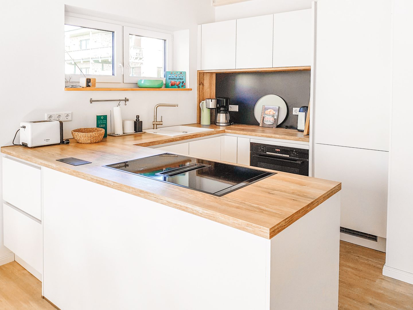 Der kombinierte Wohn- und Essbereich besticht durch seine Großzügigkeit und Gemütlichkeit. Hier finden Sie einen einladenden Esstisch, bequeme Sessel, einen Schaukelstuhl sowie ein Sofa, das zum Entspannen einlädt. Die offene Küche ist modern ausgestattet mit einem Induktionskochfeld, Backofen, Kühlschrank, Gefrierfach, Spülmaschine sowie einer Filterkaffeemaschine und Frenchpress für den perfekten Start in den Tag. Ein Wasserkocher, Toaster und Handrührgerät runden die Küchenausstattung ab.