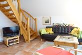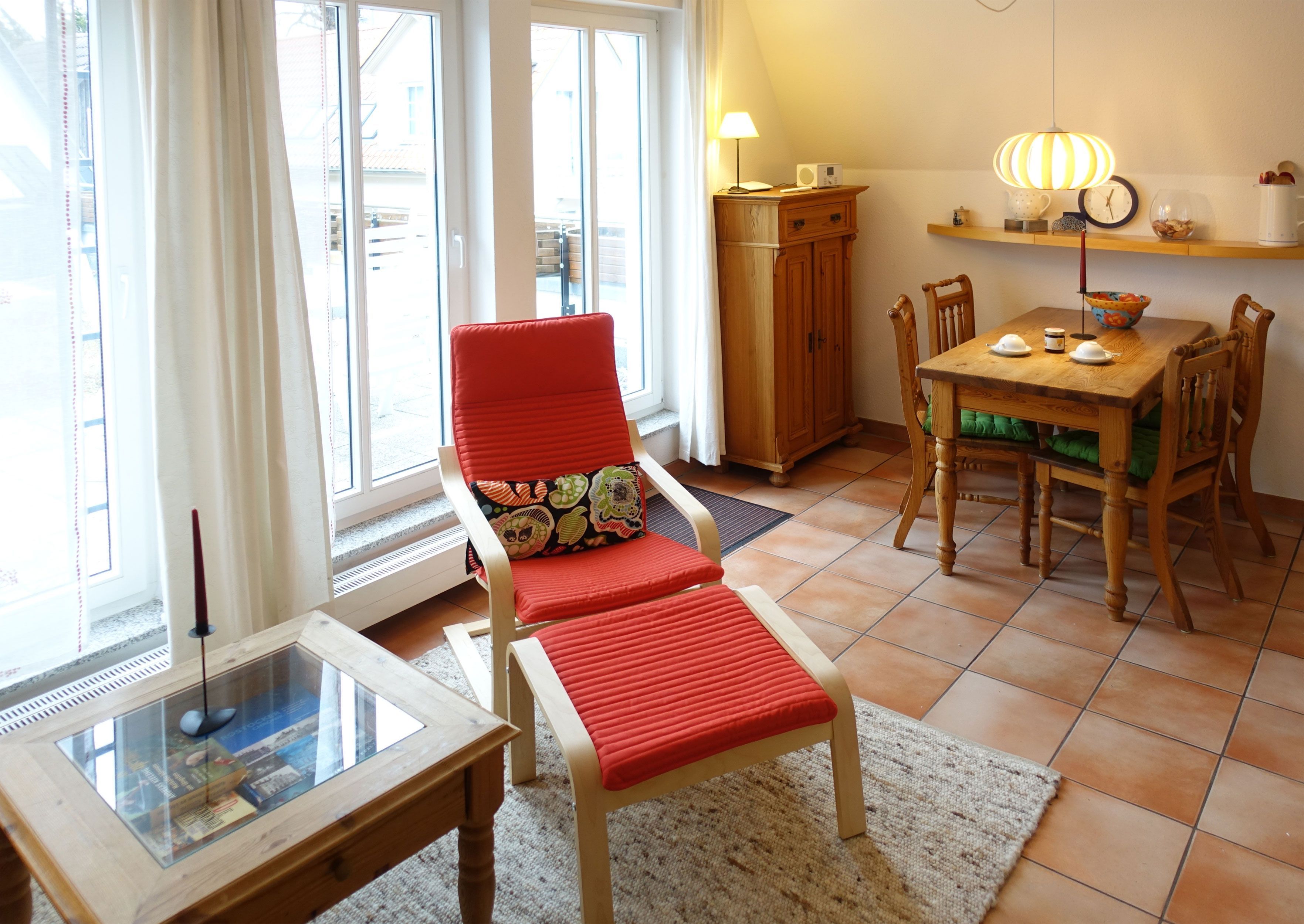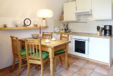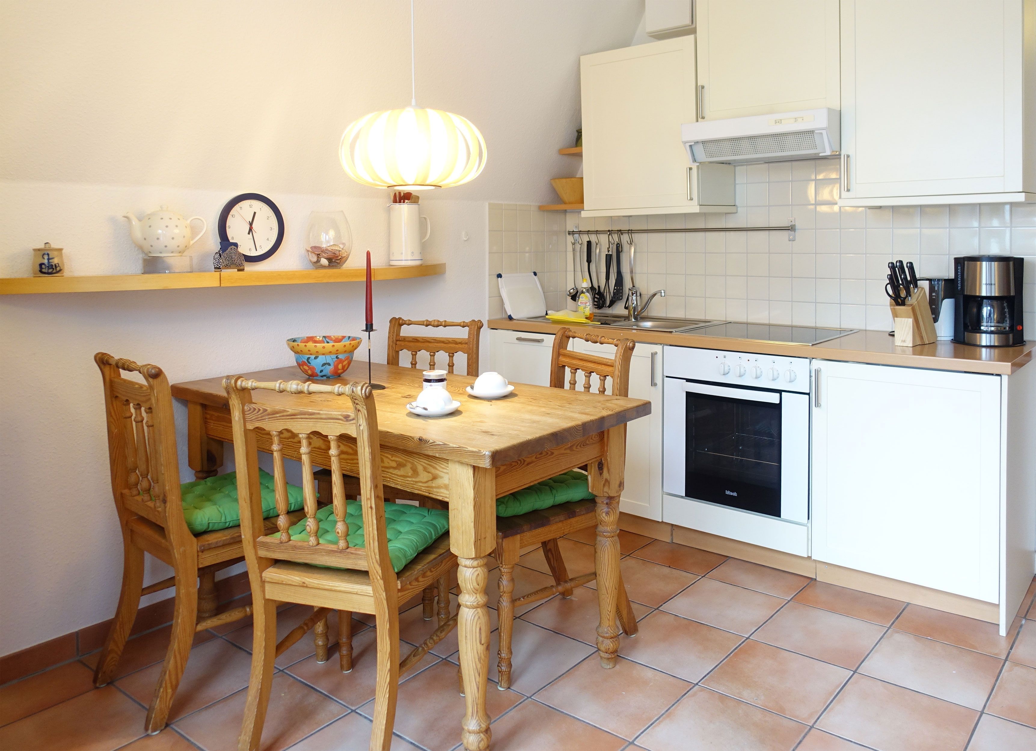 Viele Details und leichte Holzmöbel sorgen für eine komfortable Einrichtung der Ferienwohnung. Hier fühlt sich jeder wohl, egal ob er jung oder alt ist. Die untere Etage umfasst den Wohn- und Essbereich, die Küche, das Bad mit einer kleinen Badewanne und eine separate Toilette. Die Küchenzeile im Ess- und Wohnbereich verfügt über ein 4-Platten-Ceranfeld, einen Backofen und eine Spülmaschine.