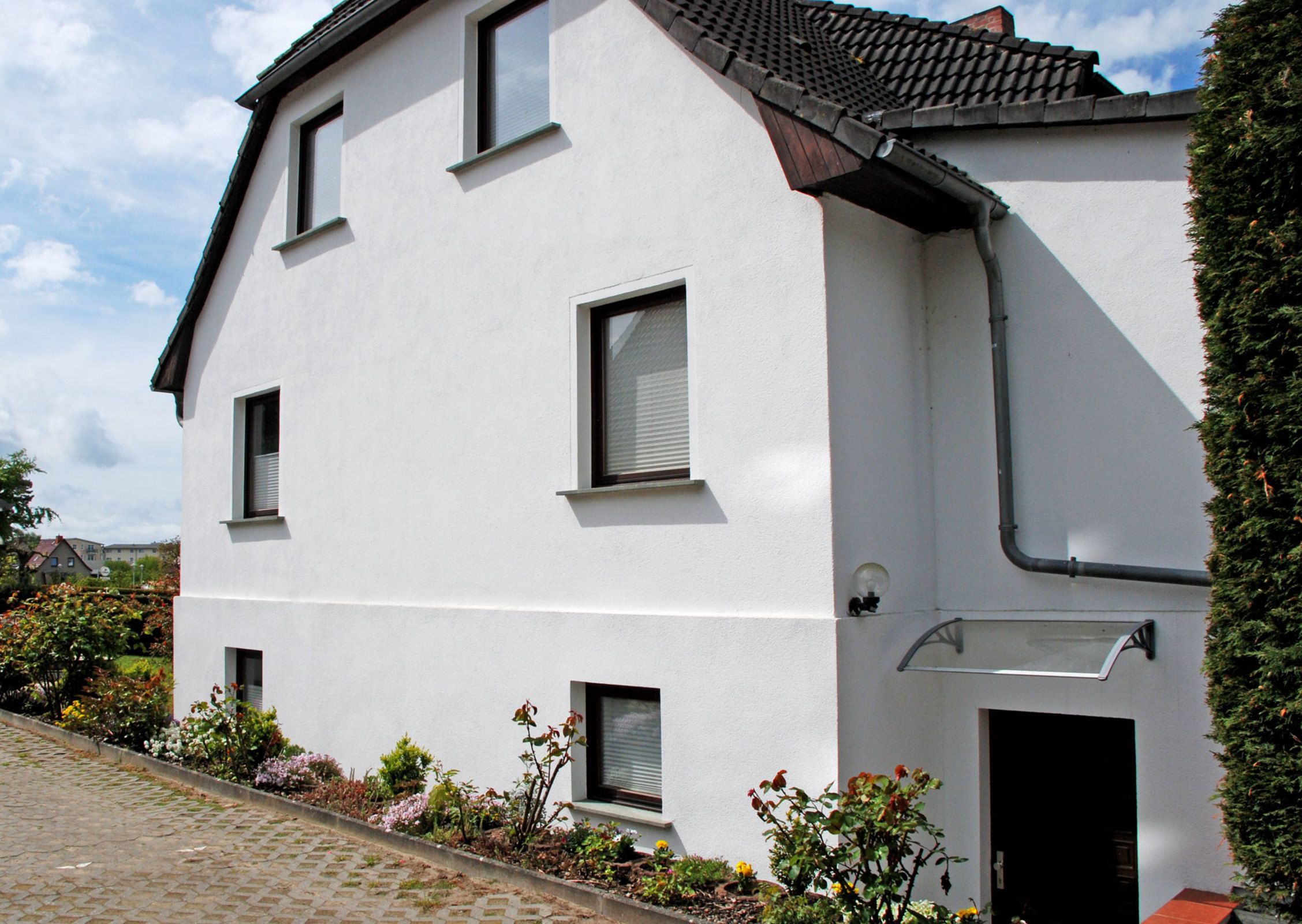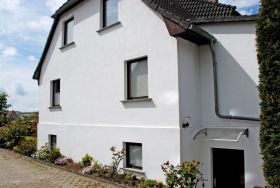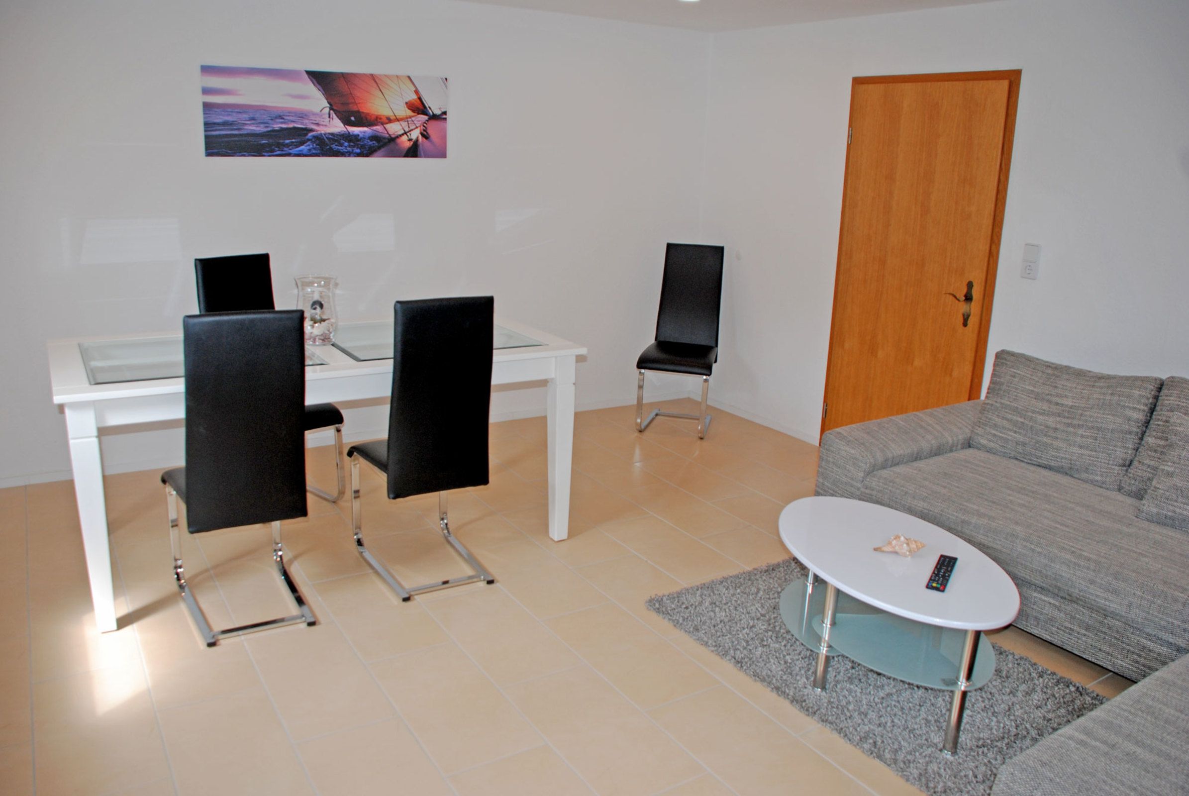Diese modern eingerichtete Ferienwohnung liegt im Soutterain eines Doppelhauses und bietet auf 65 qm großzügig Platz für max. 3 Erwachsene sowie 2 Kinder bis 17 Jahre und hat Internet - WLAN. Über den separaten Eingang gelangen Sie in den großzügigen Flur mit Garderobe, Spiegel und Kleiderschrank. Im großen, hellen Wohnzimmer stehen eine bequeme Polstersitzgruppe mit Tisch und Sesseln und ein Schrank mit Flachbild - TV - Gerät. Hier steht auch ein Esstisch mit Stühlen. Im großen Schlafzimmer stehen ein bequemes Doppelbett mit Nachttischen und Leselampen, ein Einzelbett sowie ein Kleiderschrank. Bei Bedarf kann im Wohnbereich die Couch für zwei Kinder bis 17 Jahre mit aufgebettet werden.  Die separate, moderne Küche ist mit einem 2-Plattenherd, Geschirrspüler, Abzugshaube, Wasserkocher, Kaffeemaschine, Toaster und Kühlschrank komplett ausgestattet.