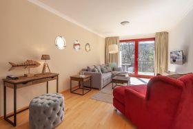 ein großes, helles Duschbad mit Doppelwaschbecken, sowie über einen geräumigen Flur mit kleinem Abstellbereich. Das besondere Highlight der Ferienwohnung - sie verfügt über zwei Balkone mit bodentiefen Panoramafenstern. Von hier aus haben Sie einen traumhaften Ausblick auf das Meer, den Golfplatz, den Nationalpark und den Schlossgarten.