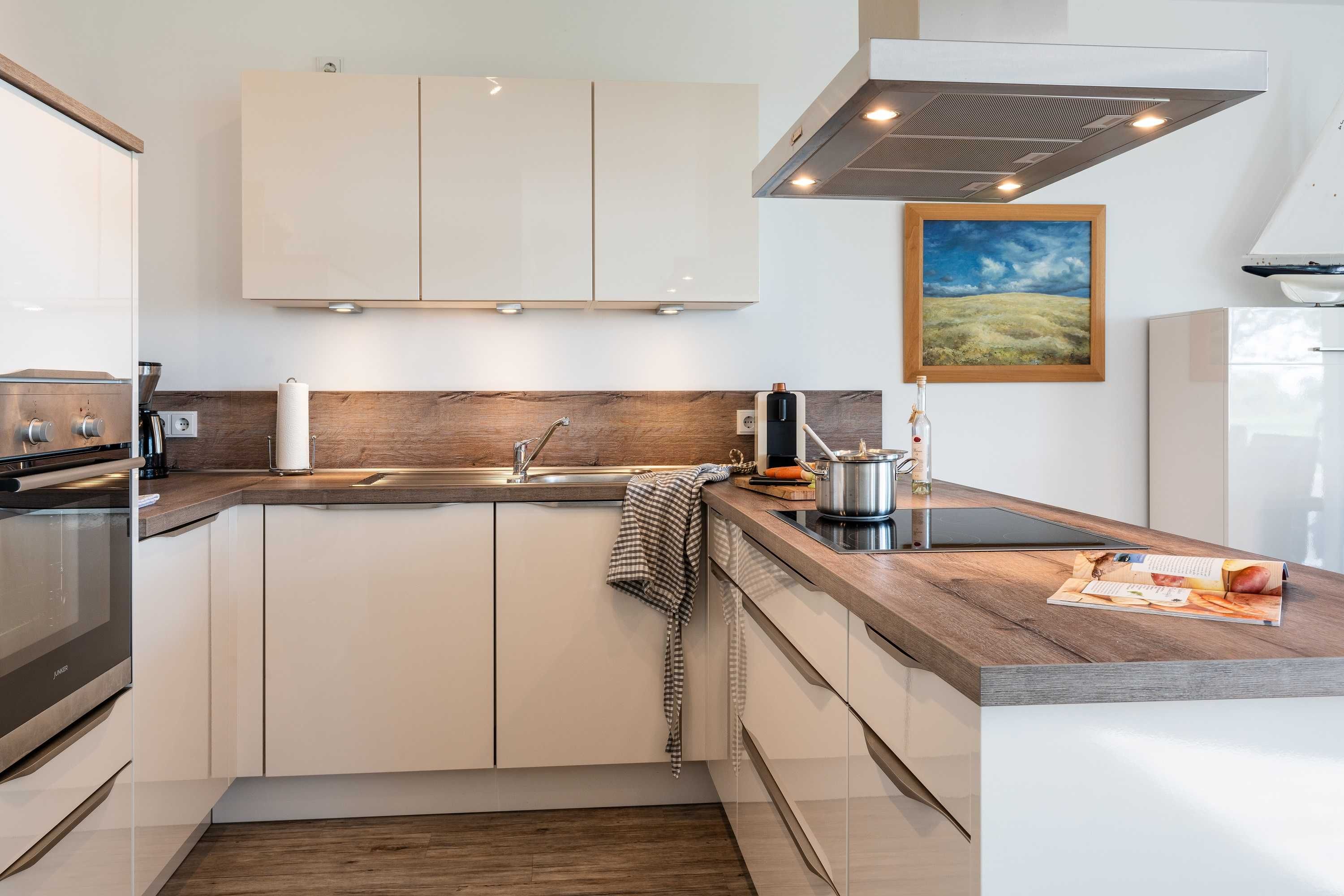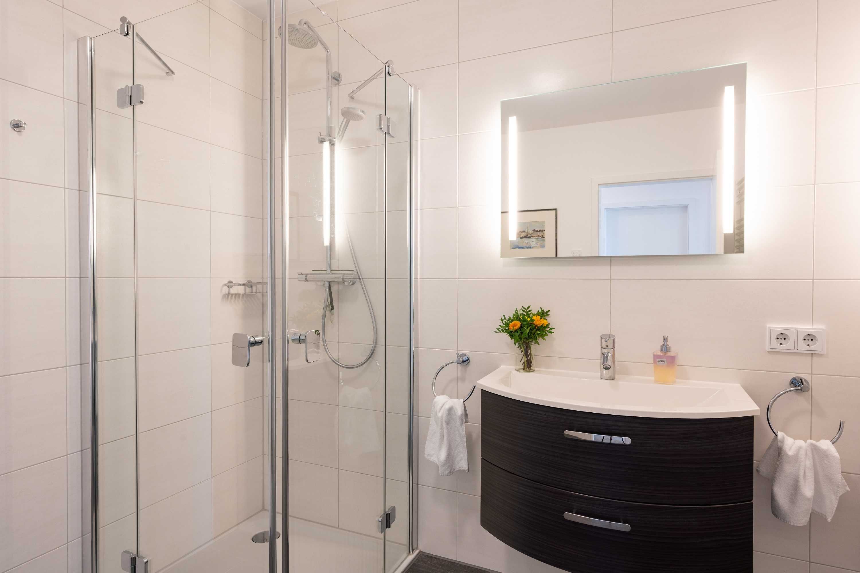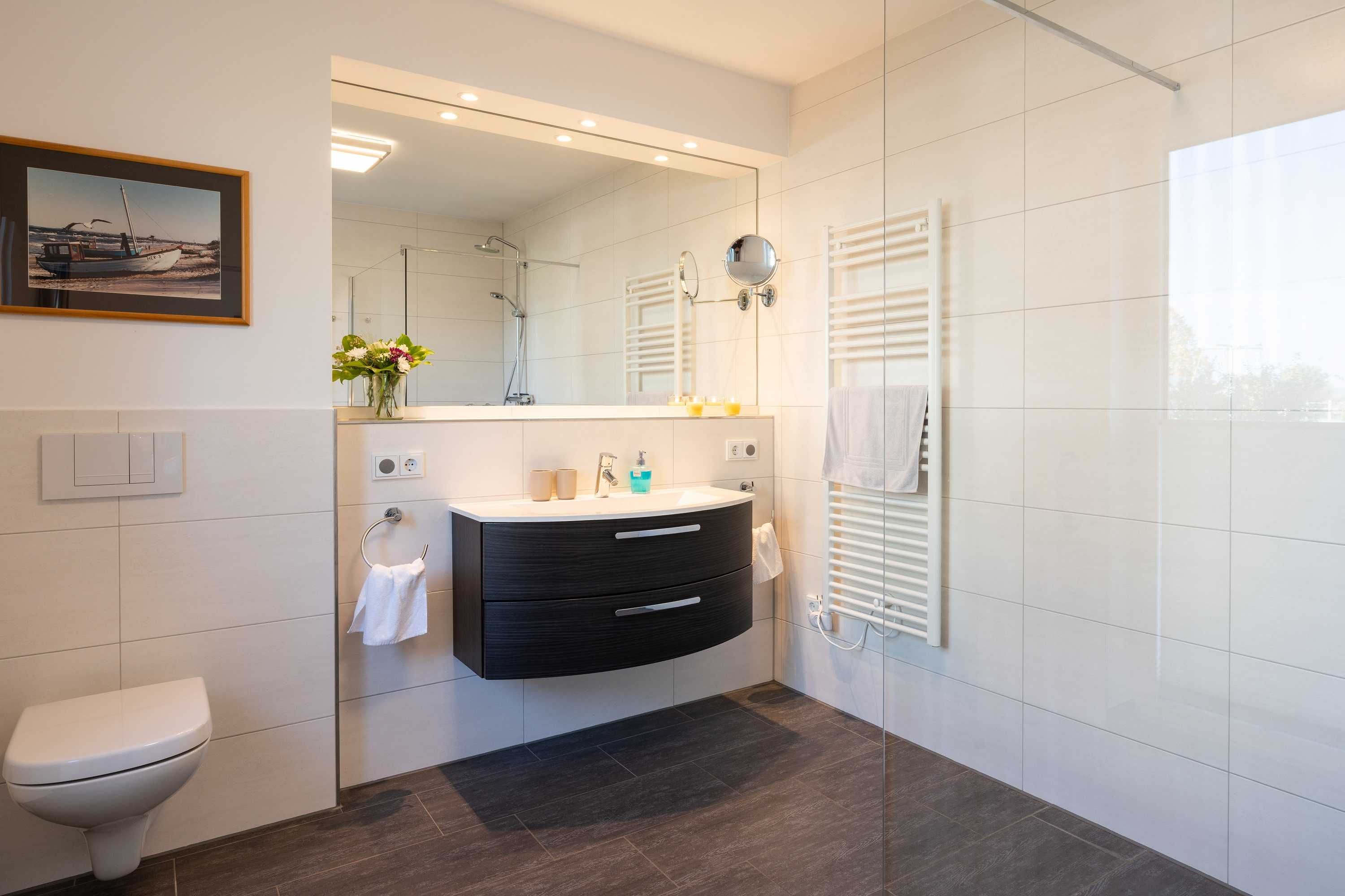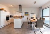 Diese luxuriöse 4-Zimmer-Wohnung im Erdgeschoss von Haus 2 mit Platz für maximal 6 Personen sowie einem Kleinkind bis 2 Jahre im Babybett verfügt über eine Wohnfläche von 119 m² und hat 3 Schlafzimmer sowie 2 voll ausgestattete Duschbäder. Die große Sonnenterrasse mit 21 m² liegt in idealer Süd-Ausrichtung. Die Wohnung ist modern eingerichtet mit offenem Wohn-Essbereich, großem Esstisch, Ledersofa sowie Flat-TV (inkl. Sky-Abo). Die hochwertig ausgestattete Küche, offen zum Wohnbereich, lässt keine Wünsche offen. Erholsamer Schlaf in den beiden Schlafzimmern mit Boxspringbetten und Flat-TV ist garantiert. Im dritten Schlafzimmer befindet sich ein bequemes Schlafsofa (Liegefläche: 1,80 x 2,00 m) und ein Flat-TV. Das Badezimmer en Suite ist mit einer begehbaren Dusche ausgestattet. Auf der großen, überdachten Sonnenterrasse mit Essgruppe und jeweils zwei Relax-Sesseln, Fußhockern, Sonnenschirm und Sonnenliegen können Sie die Seele baumeln lassen.