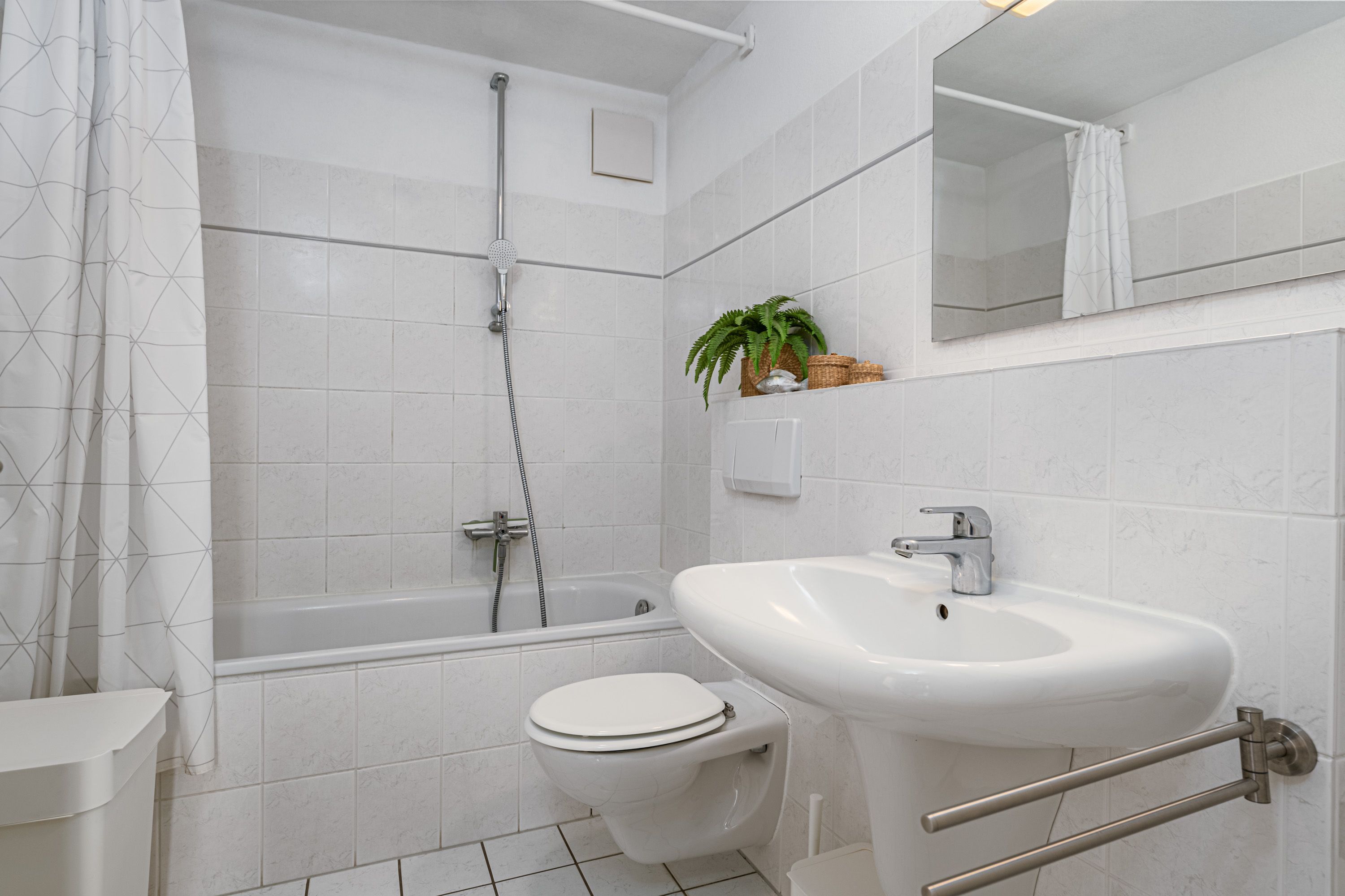 Das Badezimmer verfügt über eine Badewanne, WC und einem Föhn. Hier erfrischen Sie sich von einem schönen Tag am Strand.