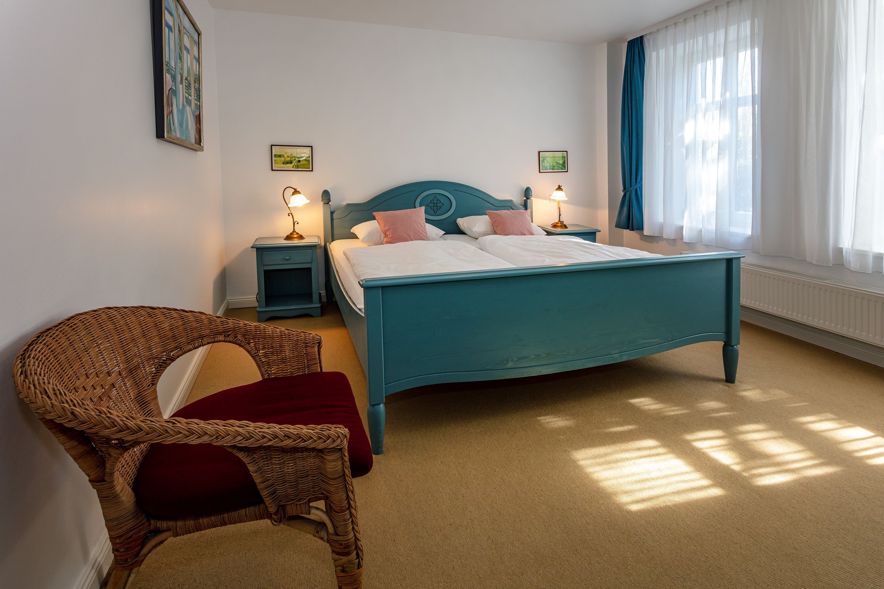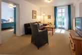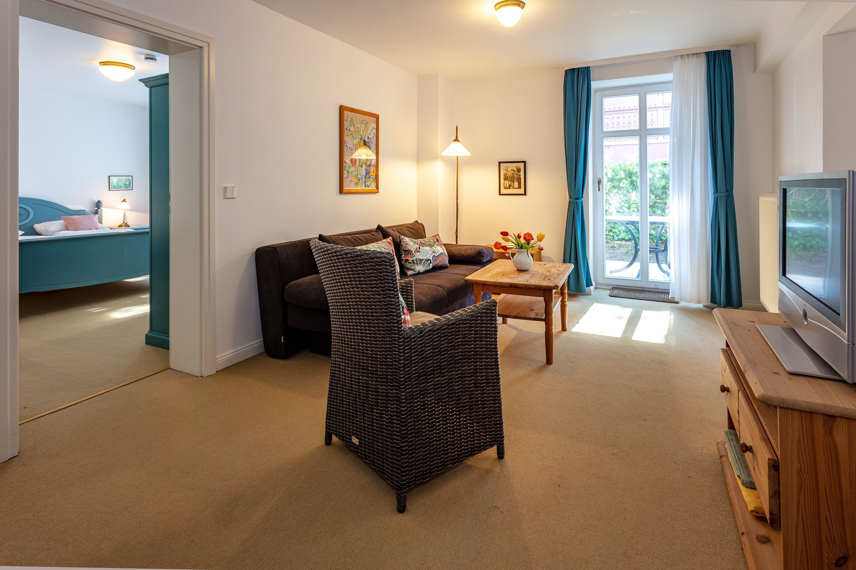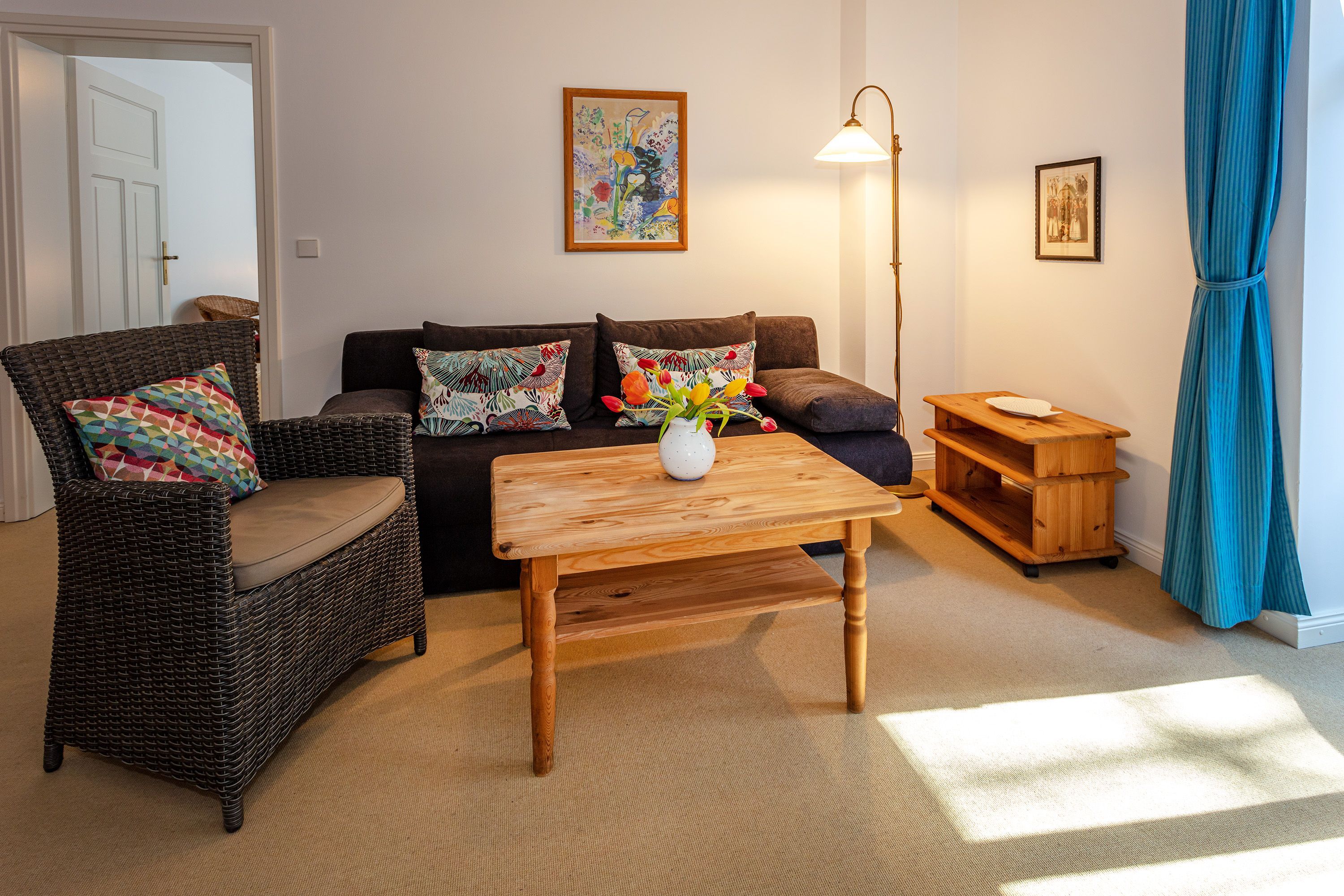 Die Wohnung 4 liegt im Erdgeschoss der historischen Villa Ruscha. Sie hat eine seitliche Terrasse sowie Gartenblick. Insgesamt befinden sich 13 Ferienwohnungen in der Villa Ruscha.