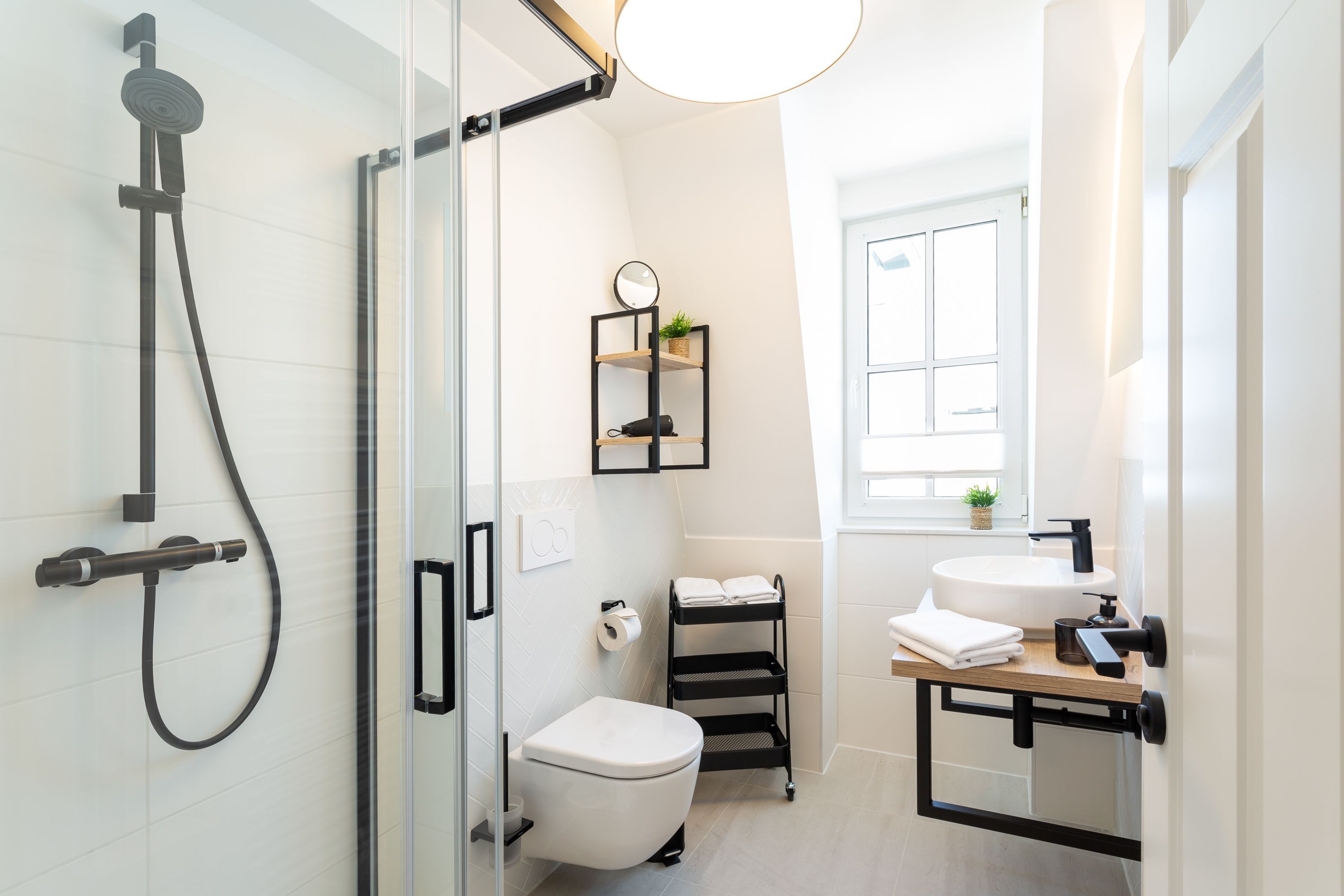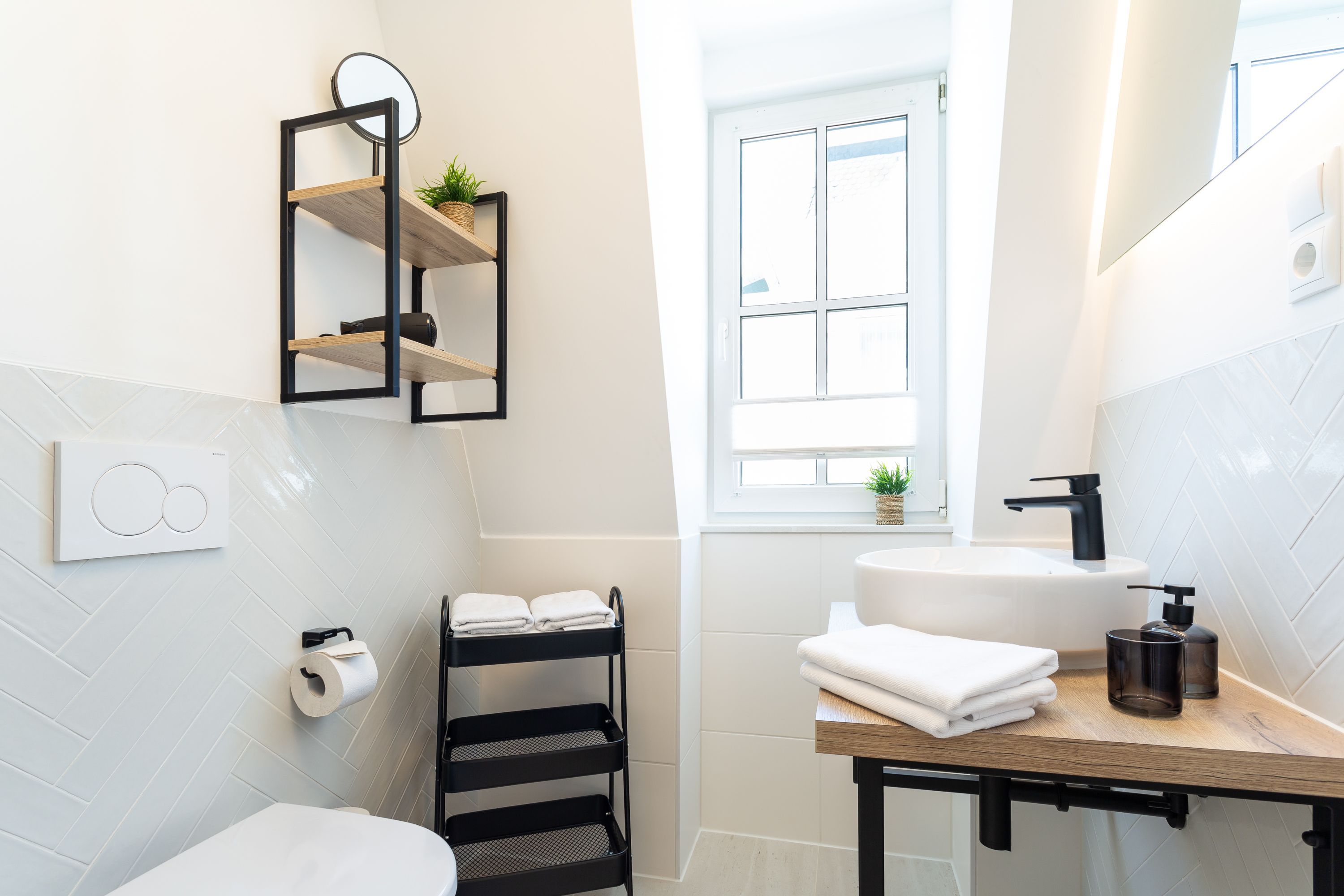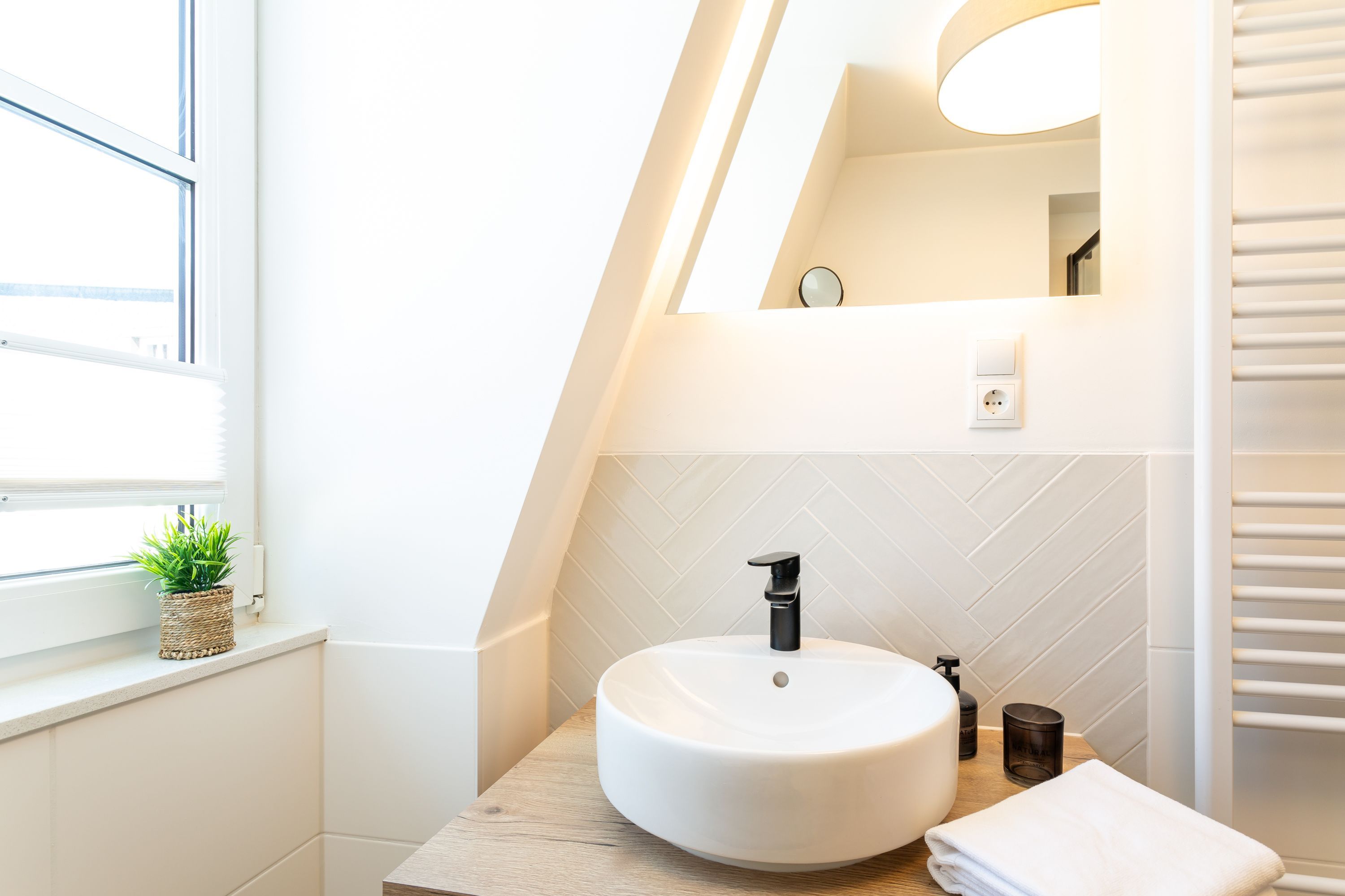 Das sonderangefertigte Inventar des Bades ist erstklassig und besticht durch seine Optik.