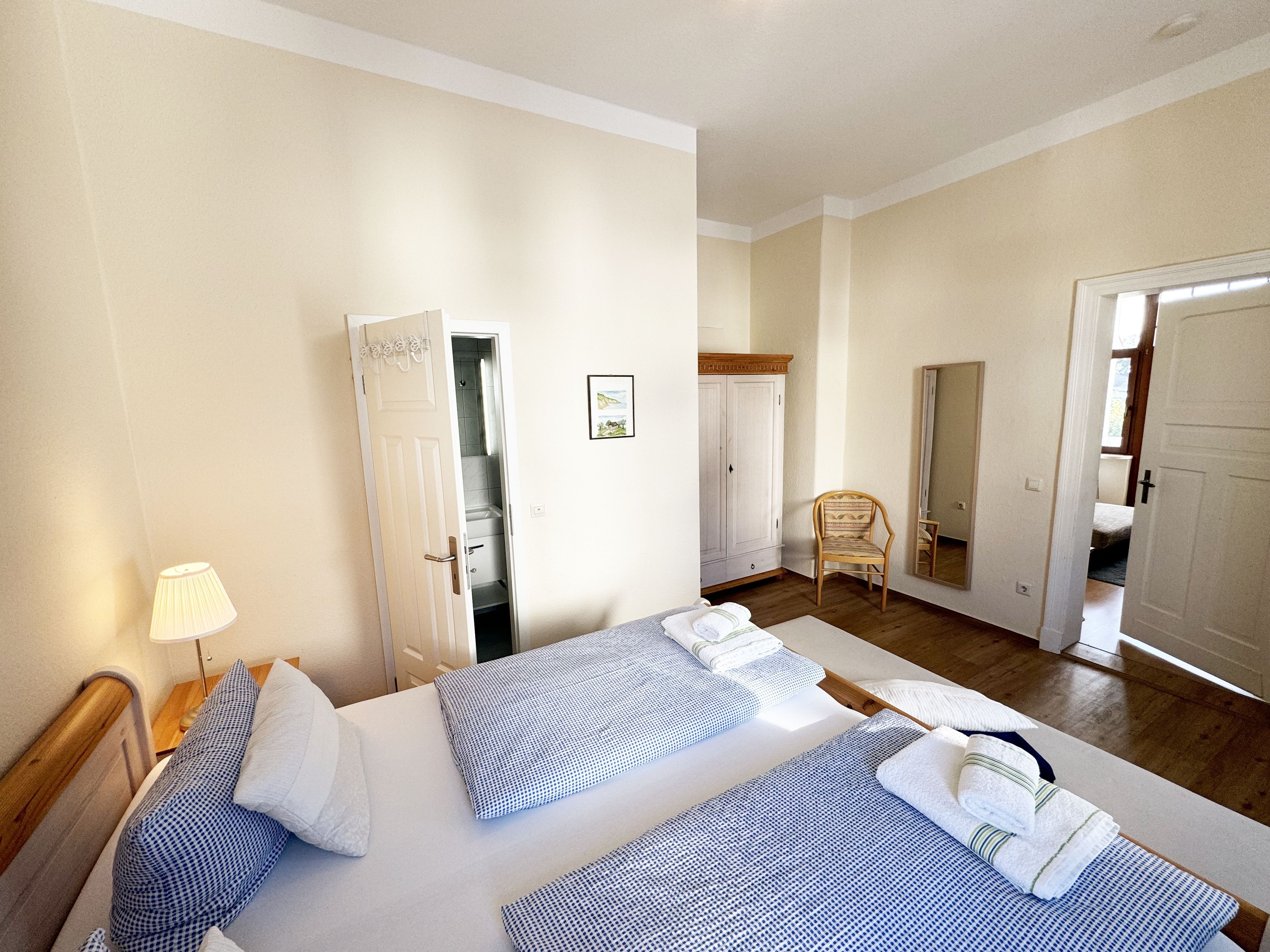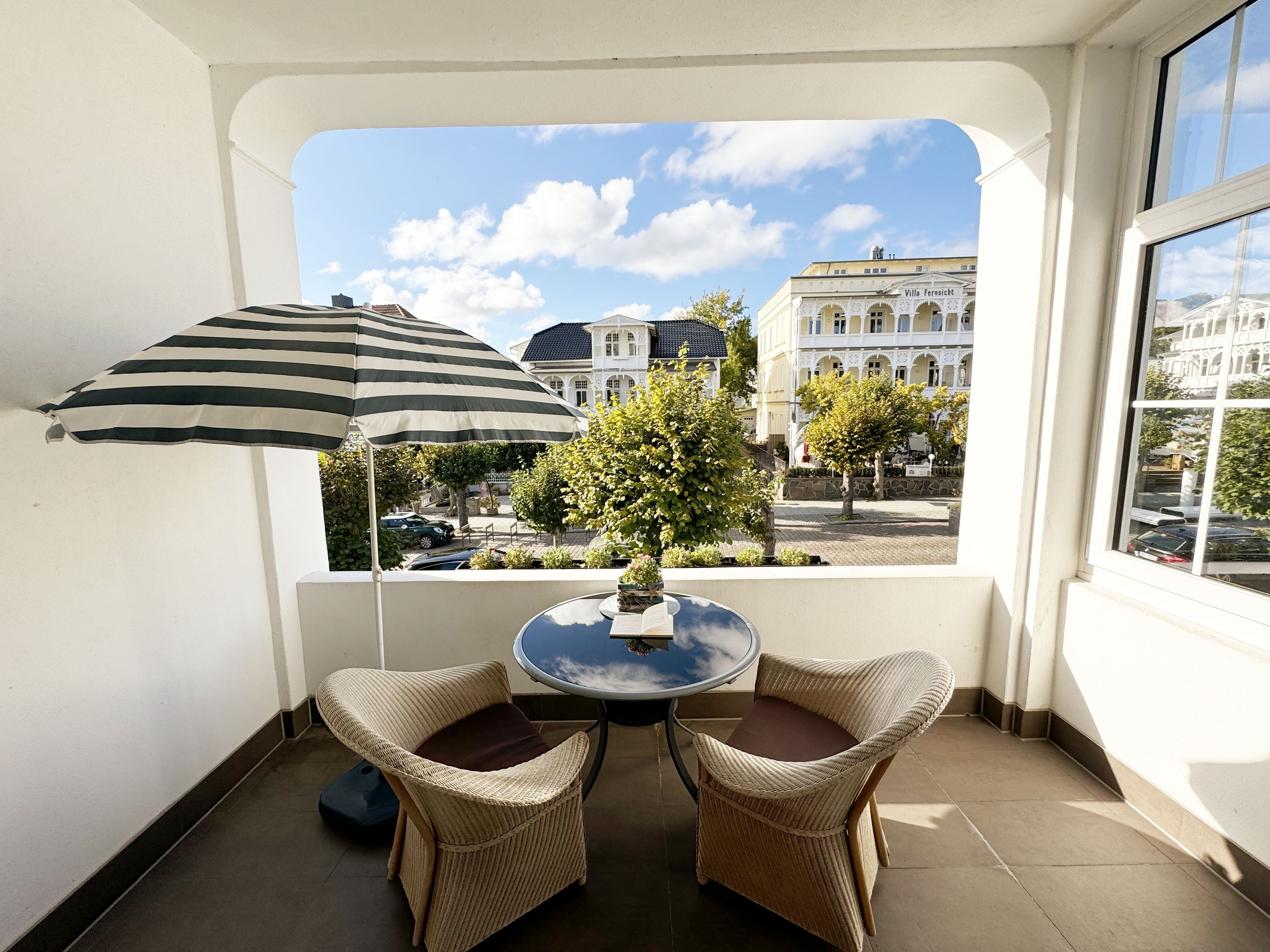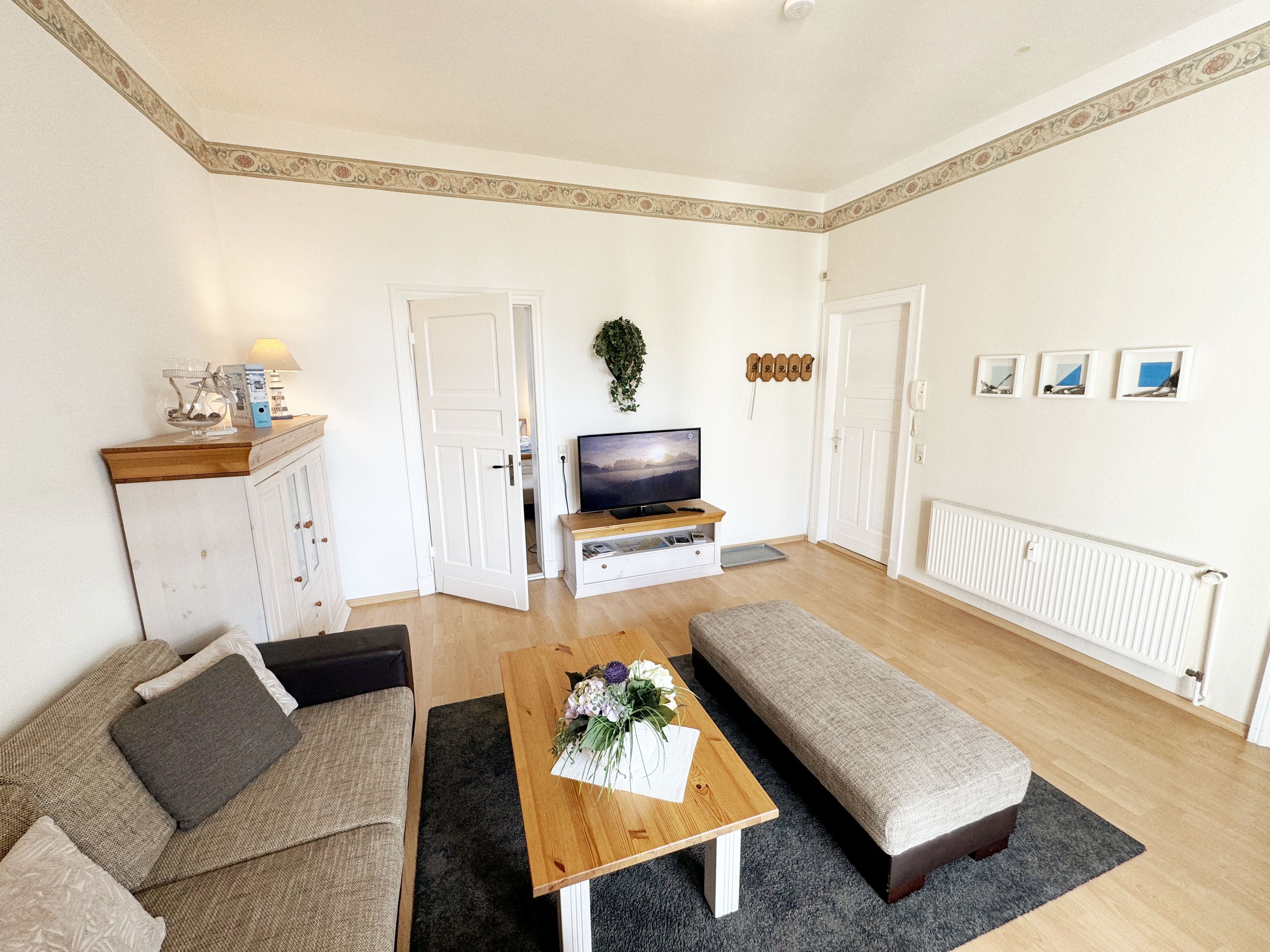 Über einen großzügigen hellen Flur gelangt man in die Ferienwohnung 2. Diese Ferienwohnung befindet sich in der 1. Etage und bietet mit seinen ca. 50 m² ausreichend Platz für maximal 2 Erwachsene + 1 Kleinkind bis 3 Jahre im Kinderreisebett. Mit seinen hohen Räumen genießen Sie den alten Charme dieser Villa. Die maritim eingerichtete Nichtraucherferienwohnung besteht aus einem großzügigen Wohnraum mit einer gemütlichen Couch, einem Couchtisch, einer Stehlampe sowie ein TV-Board mit Flachbild-TV. Auch auf einen Internetanschluss (WLAN) müssen Sie nicht verzichten. Dieser ist für Sie inklusive. Vom Wohnraum gelangen auf den großzügigen und überdachten Balkon (Westausrichtung) mit Sonnenschirm. Der Ihnen mit seiner Bestuhlung einen fantastischen Blick auf die Bäderarchitektur der Wilhelmstrasse bietet. Die separate Küche mit offener Eingangstür grenzt am Wohnraum. Die Ausstattung umfasst einen Herd mit Cerankochfeld, einen Backofen, einen Kühlschrank, einen Gefrierschrank, eine Spülmaschine, einem Toaster, einer Kaffeemaschine und einem Wasserkocher. Komplettiert wird der Raum durch einen gemütlichen Essplatz. Im Schlafzimmer befindet sich ein Doppelbett (1,80m x 2,00m), verstellbare Lattenroste, Nachttischablagen mit Beleuchtung, Ganzkörperspiegel, Insektenschutzgitter, Verdunklungsmöglichkeit und ein großer Kleiderschrank. Das kleine Bad befindet sich direkt neben dem Schlafzimmer und verfügt über einen Waschplatz, ein WC, eine Dusche mit flachem Einstieg, einen Kosmetikspiegel sowie einen Fön. Ein Staubsauger sowie ein mobiler Wäscheständer sind vorhanden. Für unsere kleinen Gäste stehen ein Kinderreisebett sowie ein Hochstuhl inklusive zur Verfügung. Haustiere sind nicht erlaubt. Ein PKW-Stellplatz (Nr.02) mit einer Höhe von max. 2,00m und einer Breite von 2,40m und eine abschließbare Fahrradunterstellmöglichkeit befinden sich direkt am Haus. Die Erstausstattung eines Wäschepaketes (komplette Bettwäsche, 1 Duschhandtuch, 2 kleine Handtücher) können Sie bis 14 Tage vor Anreise gegen einen Aufpreis dazu buchen oder durch eigenes Ergänzen. Ab 2 gebuchten Paketen erhalten Sie einmalig 1 Geschirrhandtuch und 1 Duschvorleger hinzu. Wir wünschen Ihnen einen traumhaften und angenehmen Urlaub an der Ostsee, erholen Sie sich gut.