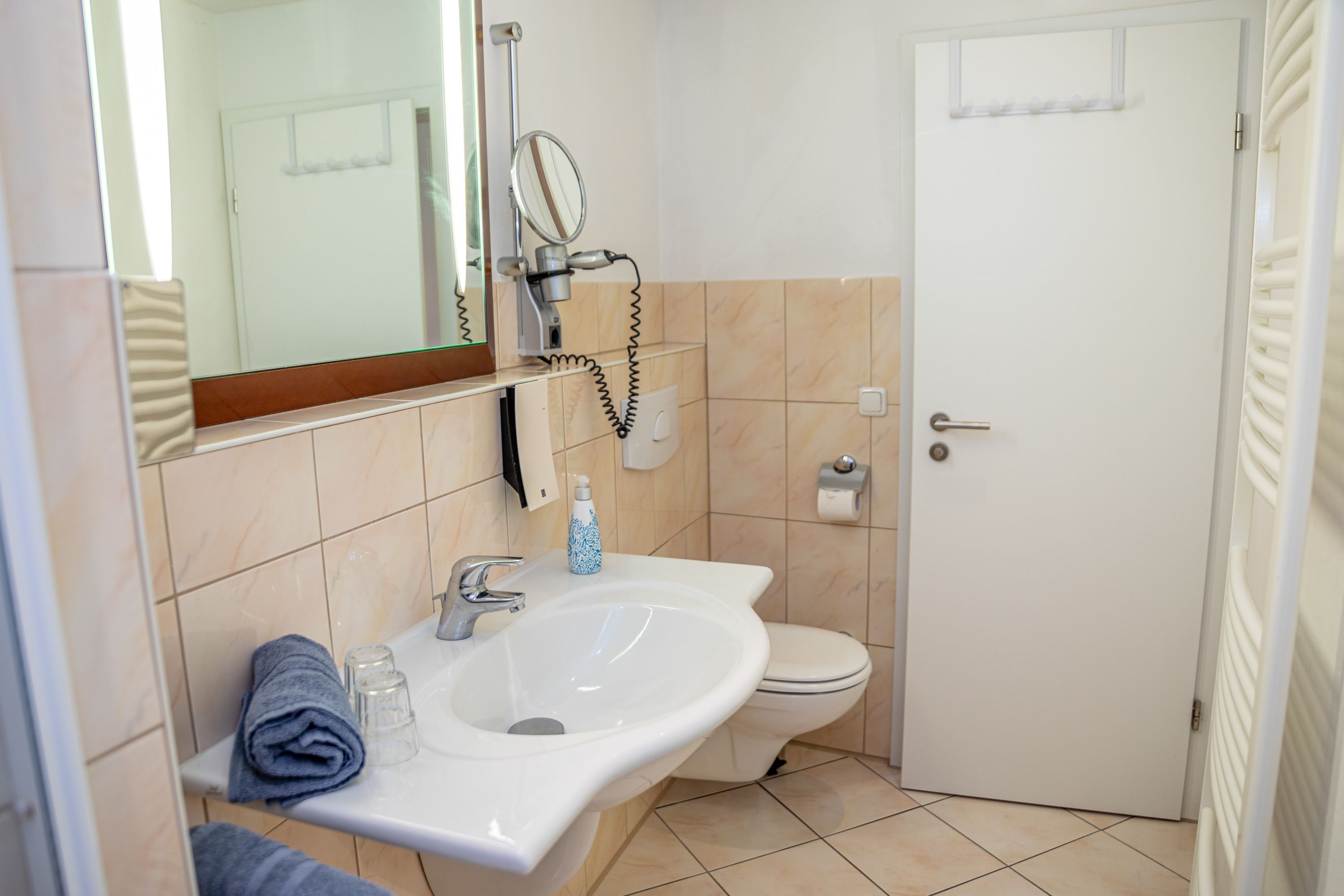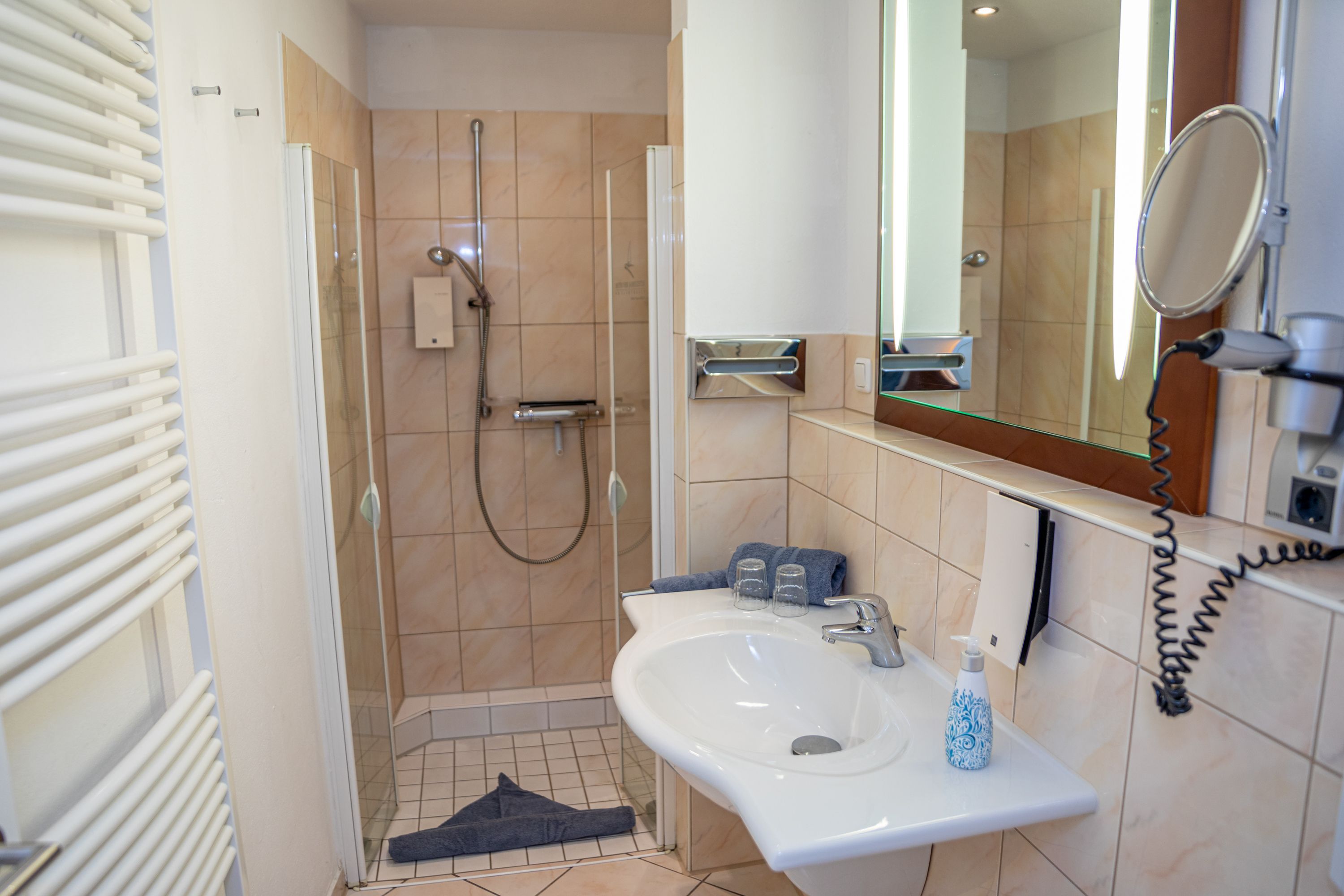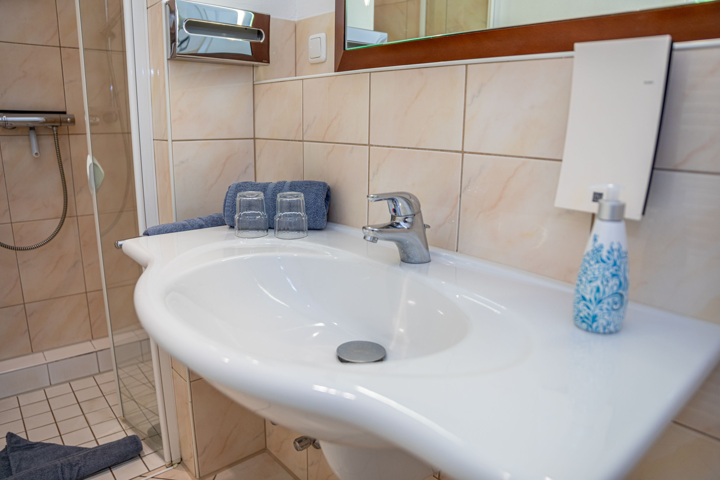 - Badezimmer mit Dusche, Waschtisch und WC.