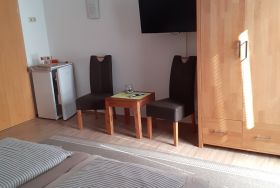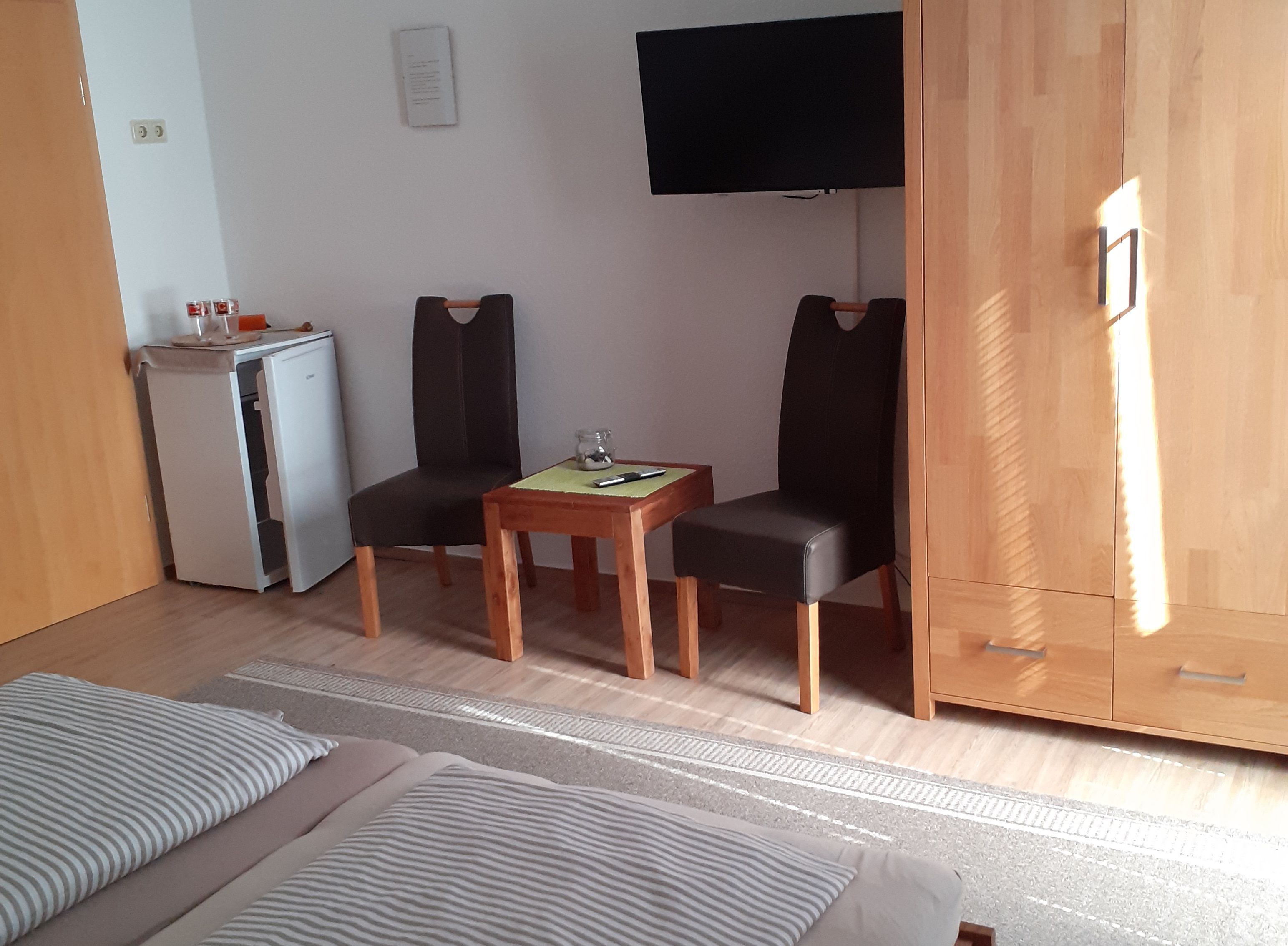 Das Ferienzimmer bietet Ihnen ein Doppelbett und ein separates Badezimmer. Das Ferienzimmer ist zudem mit einem TV und einem Kühlschrank sowie einer kleinen Sitz- und Essgelegenheit und einem Schrank ausgestattet.
