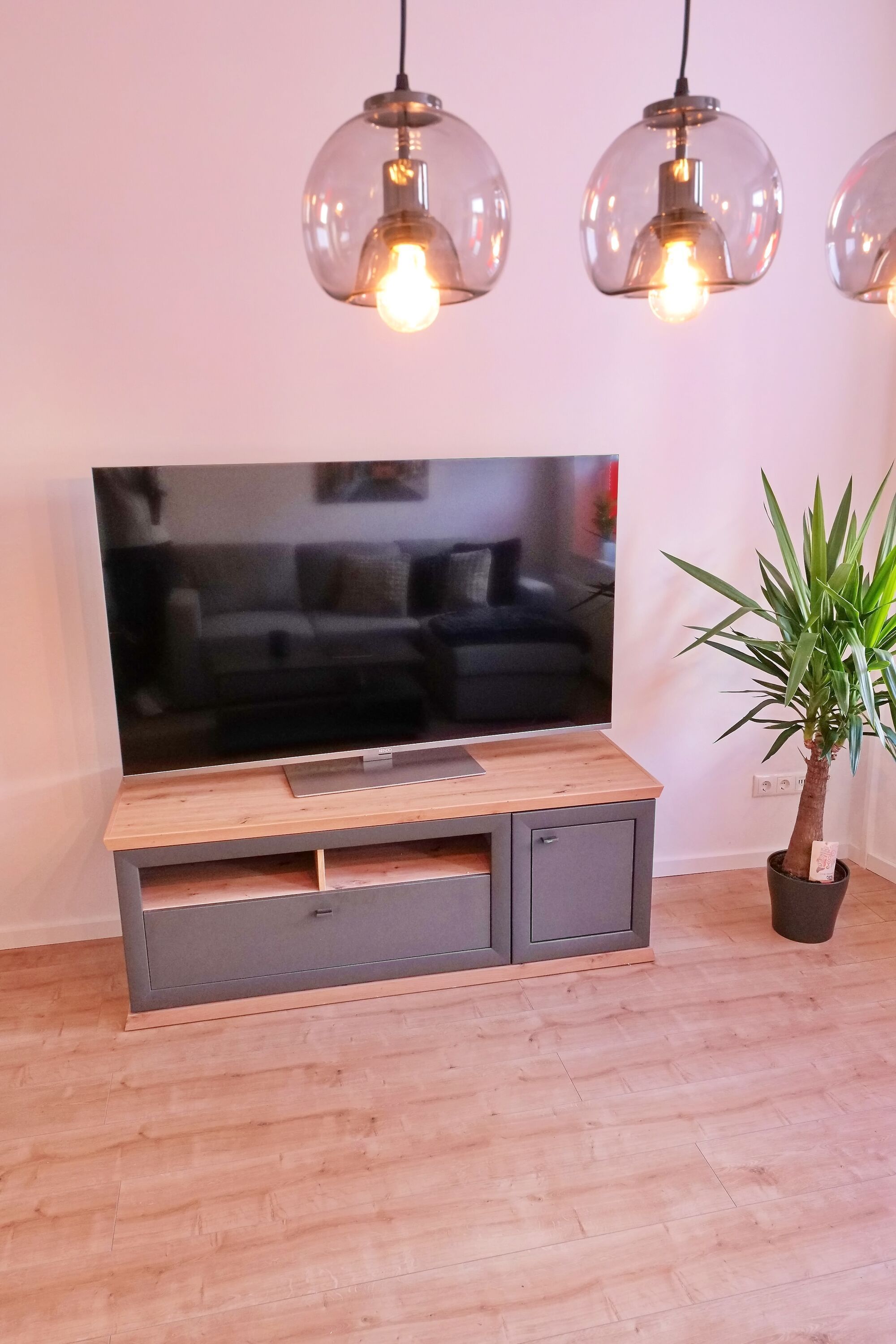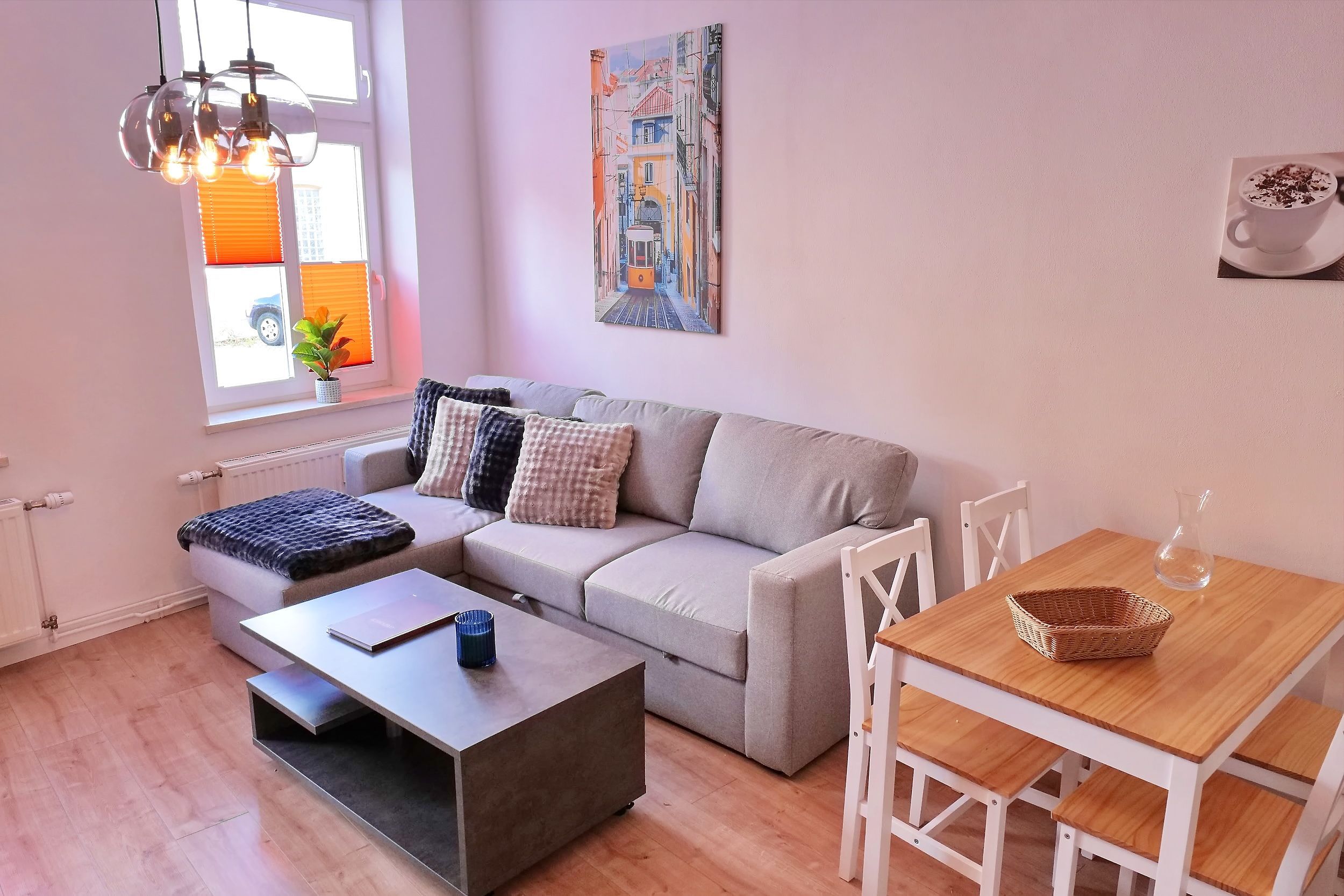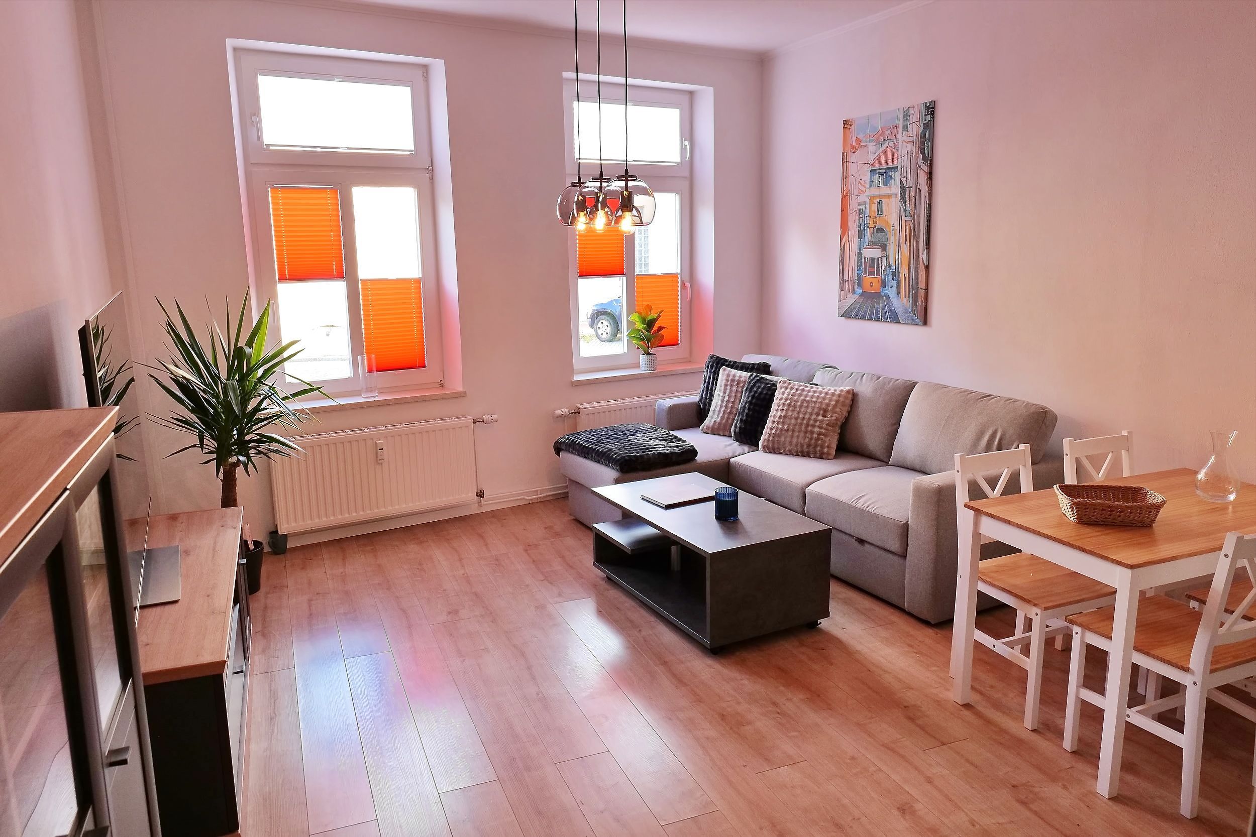- 1 großes Wohnzimmer mit Couchlandschaft, Sessel, Flat-TV, Essbereich für 4 Personen