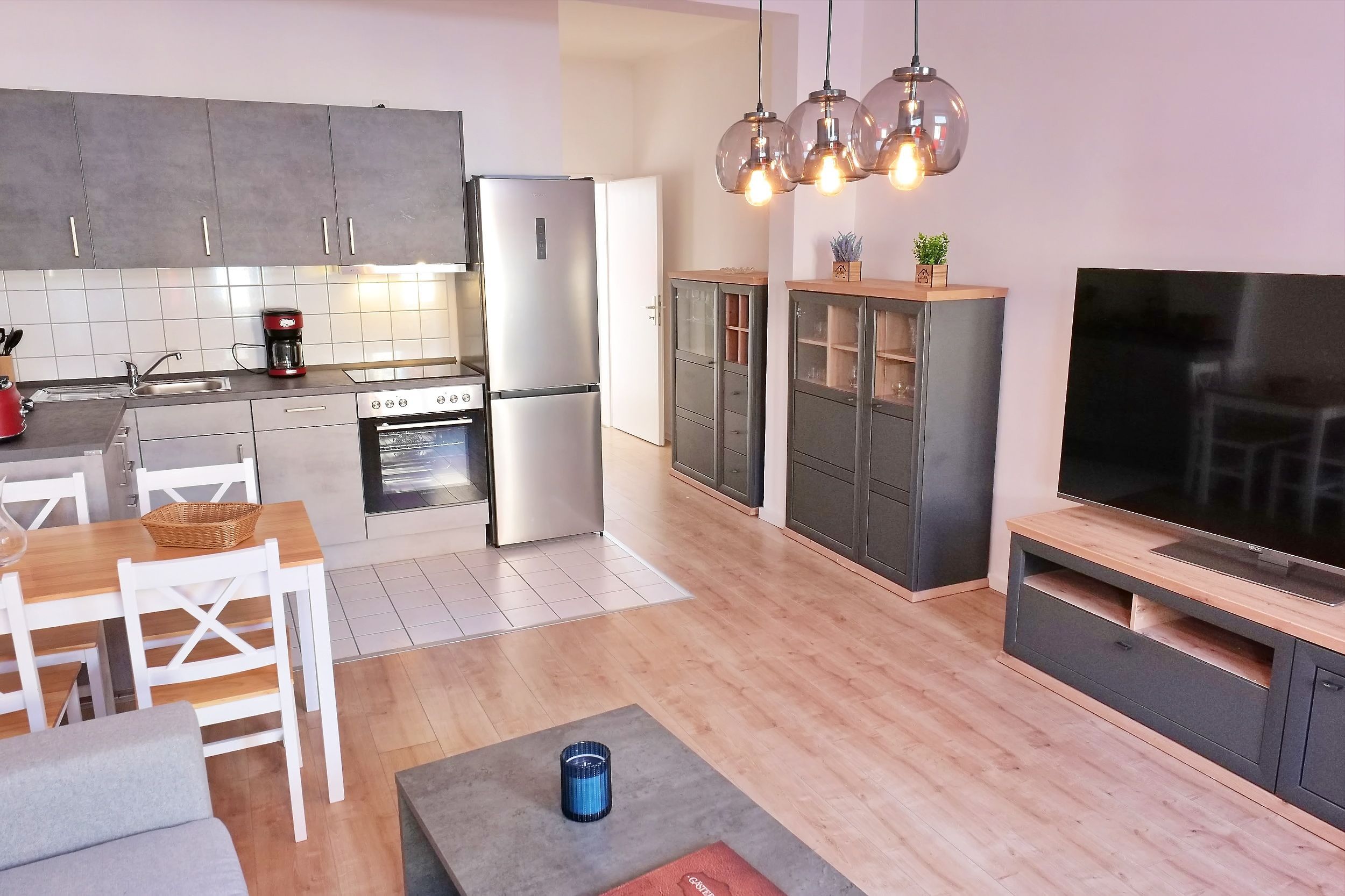 - offene Küche, vollausgestattet u.a. mit Backofen, Geschirrspüler, Herd, Filter-Kaffeemaschine, Geschirr, Besteck, Gläser, Kühlschrank uvm.