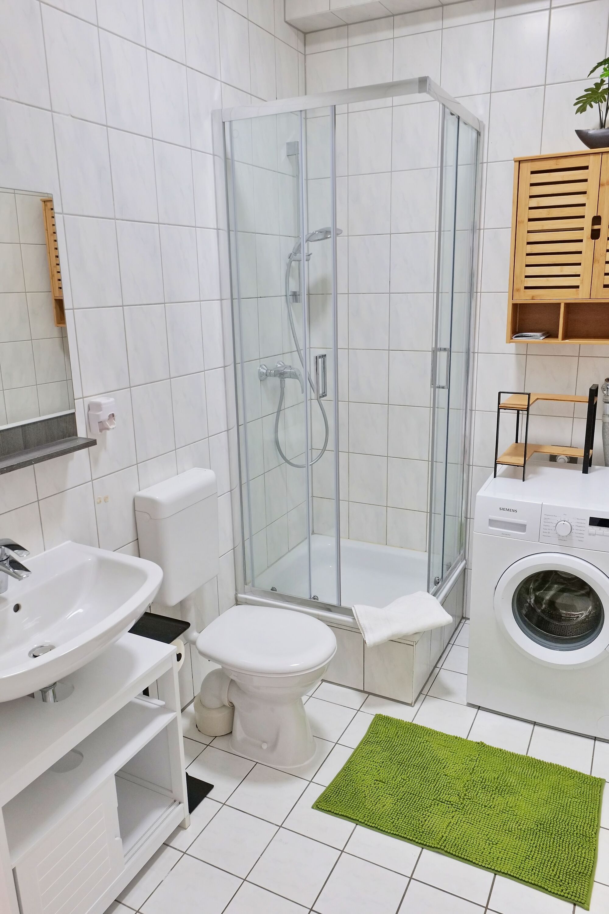 - Badezimmer mit Dusche/WC, Spiegel, Waschmaschine, Spiegel und Ablage, Wäscheständer