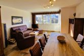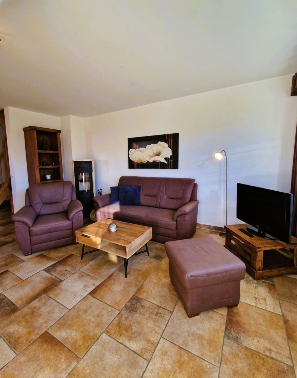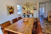Der zur Küche offene Wohn-Essbereich ist mit TV und großem Esstisch ausgestattet. Ein behaglicher Kamin ergänzt das ruhige Ambiente.